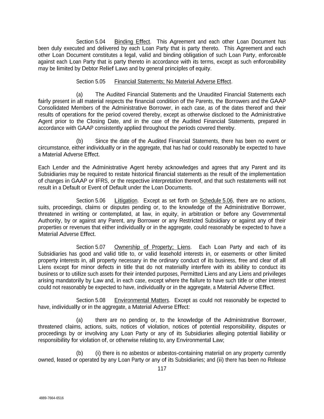 117 4889-7664-6516 Section 5.04 Binding Effect. This Agreement and each other Loan Document has been duly executed and delivered by each Loan Party that is party thereto. This Agreement and each other Loan Document constitutes a legal, valid and binding obligation of such Loan Party, enforceable against each Loan Party that is party thereto in accordance with its terms, except as such enforceability may be limited by Debtor Relief Laws and by general principles of equity. Section 5.05 Financial Statements; No Material Adverse Effect. (a) The Audited Financial Statements and the Unaudited Financial Statements each fairly present in all material respects the financial condition of the Parents, the Borrowers and the GAAP Consolidated Members of the Administrative Borrower, in each case, as of the dates thereof and their results of operations for the period covered thereby, except as otherwise disclosed to the Administrative Agent prior to the Closing Date, and in the case of the Audited Financial Statements, prepared in accordance with GAAP consistently applied throughout the periods covered thereby. (b) Since the date of the Audited Financial Statements, there has been no event or circumstance, either individually or in the aggregate, that has had or could reasonably be expected to have a Material Adverse Effect. Each Lender and the Administrative Agent hereby acknowledges and agrees that any Parent and its Subsidiaries may be required to restate historical financial statements as the result of the implementation of changes in GAAP or IFRS, or the respective interpretation thereof, and that such restatements will not result in a Default or Event of Default under the Loan Documents. Section 5.06 Litigation. Except as set forth on Schedule 5.06, there are no actions, suits, proceedings, claims or disputes pending or, to the knowledge of the Administrative Borrower, threatened in writing or contemplated, at law, in equity, in arbitration or before any Governmental Authority, by or against any Parent, any Borrower or any Restricted Subsidiary or against any of their properties or revenues that either individually or in the aggregate, could reasonably be expected to have a Material Adverse Effect. Section 5.07 Ownership of Property; Liens. Each Loan Party and each of its Subsidiaries has good and valid title to, or valid leasehold interests in, or easements or other limited property interests in, all property necessary in the ordinary conduct of its business, free and clear of all Liens except for minor defects in title that do not materially interfere with its ability to conduct its business or to utilize such assets for their intended purposes, Permitted Liens and any Liens and privileges arising mandatorily by Law and, in each case, except where the failure to have such title or other interest could not reasonably be expected to have, individually or in the aggregate, a Material Adverse Effect. Section 5.08 Environmental Matters. Except as could not reasonably be expected to have, individually or in the aggregate, a Material Adverse Effect: (a) there are no pending or, to the knowledge of the Administrative Borrower, threatened claims, actions, suits, notices of violation, notices of potential responsibility, disputes or proceedings by or involving any Loan Party or any of its Subsidiaries alleging potential liability or responsibility for violation of, or otherwise relating to, any Environmental Law; (b) (i) there is no asbestos or asbestos-containing material on any property currently owned, leased or operated by any Loan Party or any of its Subsidiaries; and (ii) there has been no Release