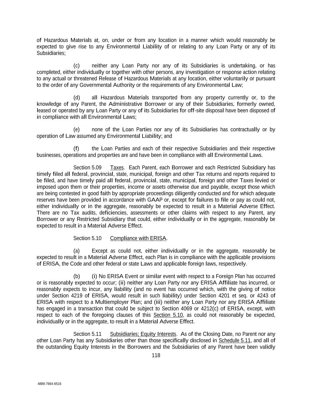 118 4889-7664-6516 of Hazardous Materials at, on, under or from any location in a manner which would reasonably be expected to give rise to any Environmental Liability of or relating to any Loan Party or any of its Subsidiaries; (c) neither any Loan Party nor any of its Subsidiaries is undertaking, or has completed, either individually or together with other persons, any investigation or response action relating to any actual or threatened Release of Hazardous Materials at any location, either voluntarily or pursuant to the order of any Governmental Authority or the requirements of any Environmental Law; (d) all Hazardous Materials transported from any property currently or, to the knowledge of any Parent, the Administrative Borrower or any of their Subsidiaries, formerly owned, leased or operated by any Loan Party or any of its Subsidiaries for off-site disposal have been disposed of in compliance with all Environmental Laws; (e) none of the Loan Parties nor any of its Subsidiaries has contractually or by operation of Law assumed any Environmental Liability; and (f) the Loan Parties and each of their respective Subsidiaries and their respective businesses, operations and properties are and have been in compliance with all Environmental Laws. Section 5.09 Taxes. Each Parent, each Borrower and each Restricted Subsidiary has timely filed all federal, provincial, state, municipal, foreign and other Tax returns and reports required to be filed, and have timely paid all federal, provincial, state, municipal, foreign and other Taxes levied or imposed upon them or their properties, income or assets otherwise due and payable, except those which are being contested in good faith by appropriate proceedings diligently conducted and for which adequate reserves have been provided in accordance with GAAP or, except for failures to file or pay as could not, either individually or in the aggregate, reasonably be expected to result in a Material Adverse Effect. There are no Tax audits, deficiencies, assessments or other claims with respect to any Parent, any Borrower or any Restricted Subsidiary that could, either individually or in the aggregate, reasonably be expected to result in a Material Adverse Effect. Section 5.10 Compliance with ERISA. (a) Except as could not, either individually or in the aggregate, reasonably be expected to result in a Material Adverse Effect, each Plan is in compliance with the applicable provisions of ERISA, the Code and other federal or state Laws and applicable foreign laws, respectively. (b) (i) No ERISA Event or similar event with respect to a Foreign Plan has occurred or is reasonably expected to occur; (ii) neither any Loan Party nor any ERISA Affiliate has incurred, or reasonably expects to incur, any liability (and no event has occurred which, with the giving of notice under Section 4219 of ERISA, would result in such liability) under Section 4201 et seq. or 4243 of ERISA with respect to a Multiemployer Plan; and (iii) neither any Loan Party nor any ERISA Affiliate has engaged in a transaction that could be subject to Section 4069 or 4212(c) of ERISA, except, with respect to each of the foregoing clauses of this Section 5.10, as could not reasonably be expected, individually or in the aggregate, to result in a Material Adverse Effect. Section 5.11 Subsidiaries; Equity Interests. As of the Closing Date, no Parent nor any other Loan Party has any Subsidiaries other than those specifically disclosed in Schedule 5.11, and all of the outstanding Equity Interests in the Borrowers and the Subsidiaries of any Parent have been validly