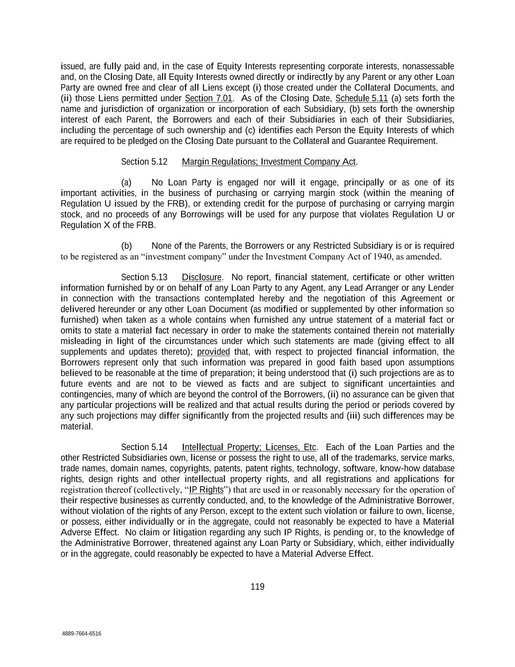 119 4889-7664-6516 issued, are fully paid and, in the case of Equity Interests representing corporate interests, nonassessable and, on the Closing Date, all Equity Interests owned directly or indirectly by any Parent or any other Loan Party are owned free and clear of all Liens except (i) those created under the Collateral Documents, and (ii) those Liens permitted under Section 7.01. As of the Closing Date, Schedule 5.11 (a) sets forth the name and jurisdiction of organization or incorporation of each Subsidiary, (b) sets forth the ownership interest of each Parent, the Borrowers and each of their Subsidiaries in each of their Subsidiaries, including the percentage of such ownership and (c) identifies each Person the Equity Interests of which are required to be pledged on the Closing Date pursuant to the Collateral and Guarantee Requirement. Section 5.12 Margin Regulations; Investment Company Act. (a) No Loan Party is engaged nor will it engage, principally or as one of its important activities, in the business of purchasing or carrying margin stock (within the meaning of Regulation U issued by the FRB), or extending credit for the purpose of purchasing or carrying margin stock, and no proceeds of any Borrowings will be used for any purpose that violates Regulation U or Regulation X of the FRB. (b) None of the Parents, the Borrowers or any Restricted Subsidiary is or is required to be registered as an “investment company” under the Investment Company Act of 1940, as amended. Section 5.13 Disclosure. No report, financial statement, certificate or other written information furnished by or on behalf of any Loan Party to any Agent, any Lead Arranger or any Lender in connection with the transactions contemplated hereby and the negotiation of this Agreement or delivered hereunder or any other Loan Document (as modified or supplemented by other information so furnished) when taken as a whole contains when furnished any untrue statement of a material fact or omits to state a material fact necessary in order to make the statements contained therein not materially misleading in light of the circumstances under which such statements are made (giving effect to all supplements and updates thereto); provided that, with respect to projected financial information, the Borrowers represent only that such information was prepared in good faith based upon assumptions believed to be reasonable at the time of preparation; it being understood that (i) such projections are as to future events and are not to be viewed as facts and are subject to significant uncertainties and contingencies, many of which are beyond the control of the Borrowers, (ii) no assurance can be given that any particular projections will be realized and that actual results during the period or periods covered by any such projections may differ significantly from the projected results and (iii) such differences may be material. Section 5.14 Intellectual Property; Licenses, Etc. Each of the Loan Parties and the other Restricted Subsidiaries own, license or possess the right to use, all of the trademarks, service marks, trade names, domain names, copyrights, patents, patent rights, technology, software, know-how database rights, design rights and other intellectual property rights, and all registrations and applications for registration thereof (collectively, “IP Rights”) that are used in or reasonably necessary for the operation of their respective businesses as currently conducted, and, to the knowledge of the Administrative Borrower, without violation of the rights of any Person, except to the extent such violation or failure to own, license, or possess, either individually or in the aggregate, could not reasonably be expected to have a Material Adverse Effect. No claim or litigation regarding any such IP Rights, is pending or, to the knowledge of the Administrative Borrower, threatened against any Loan Party or Subsidiary, which, either individually or in the aggregate, could reasonably be expected to have a Material Adverse Effect.
