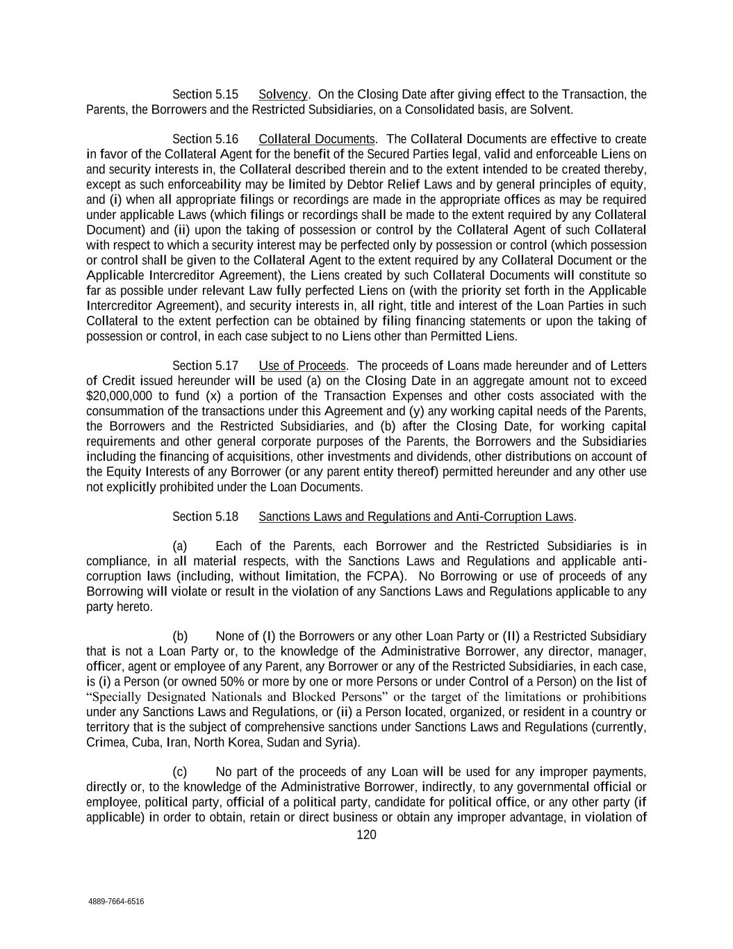 120 4889-7664-6516 Section 5.15 Solvency. On the Closing Date after giving effect to the Transaction, the Parents, the Borrowers and the Restricted Subsidiaries, on a Consolidated basis, are Solvent. Section 5.16 Collateral Documents. The Collateral Documents are effective to create in favor of the Collateral Agent for the benefit of the Secured Parties legal, valid and enforceable Liens on and security interests in, the Collateral described therein and to the extent intended to be created thereby, except as such enforceability may be limited by Debtor Relief Laws and by general principles of equity, and (i) when all appropriate filings or recordings are made in the appropriate offices as may be required under applicable Laws (which filings or recordings shall be made to the extent required by any Collateral Document) and (ii) upon the taking of possession or control by the Collateral Agent of such Collateral with respect to which a security interest may be perfected only by possession or control (which possession or control shall be given to the Collateral Agent to the extent required by any Collateral Document or the Applicable Intercreditor Agreement), the Liens created by such Collateral Documents will constitute so far as possible under relevant Law fully perfected Liens on (with the priority set forth in the Applicable Intercreditor Agreement), and security interests in, all right, title and interest of the Loan Parties in such Collateral to the extent perfection can be obtained by filing financing statements or upon the taking of possession or control, in each case subject to no Liens other than Permitted Liens. Section 5.17 Use of Proceeds. The proceeds of Loans made hereunder and of Letters of Credit issued hereunder will be used (a) on the Closing Date in an aggregate amount not to exceed $20,000,000 to fund (x) a portion of the Transaction Expenses and other costs associated with the consummation of the transactions under this Agreement and (y) any working capital needs of the Parents, the Borrowers and the Restricted Subsidiaries, and (b) after the Closing Date, for working capital requirements and other general corporate purposes of the Parents, the Borrowers and the Subsidiaries including the financing of acquisitions, other investments and dividends, other distributions on account of the Equity Interests of any Borrower (or any parent entity thereof) permitted hereunder and any other use not explicitly prohibited under the Loan Documents. Section 5.18 Sanctions Laws and Regulations and Anti-Corruption Laws. (a) Each of the Parents, each Borrower and the Restricted Subsidiaries is in compliance, in all material respects, with the Sanctions Laws and Regulations and applicable anti- corruption laws (including, without limitation, the FCPA). No Borrowing or use of proceeds of any Borrowing will violate or result in the violation of any Sanctions Laws and Regulations applicable to any party hereto. (b) None of (I) the Borrowers or any other Loan Party or (II) a Restricted Subsidiary that is not a Loan Party or, to the knowledge of the Administrative Borrower, any director, manager, officer, agent or employee of any Parent, any Borrower or any of the Restricted Subsidiaries, in each case, is (i) a Person (or owned 50% or more by one or more Persons or under Control of a Person) on the list of “Specially Designated Nationals and Blocked Persons” or the target of the limitations or prohibitions under any Sanctions Laws and Regulations, or (ii) a Person located, organized, or resident in a country or territory that is the subject of comprehensive sanctions under Sanctions Laws and Regulations (currently, Crimea, Cuba, Iran, North Korea, Sudan and Syria). (c) No part of the proceeds of any Loan will be used for any improper payments, directly or, to the knowledge of the Administrative Borrower, indirectly, to any governmental official or employee, political party, official of a political party, candidate for political office, or any other party (if applicable) in order to obtain, retain or direct business or obtain any improper advantage, in violation of