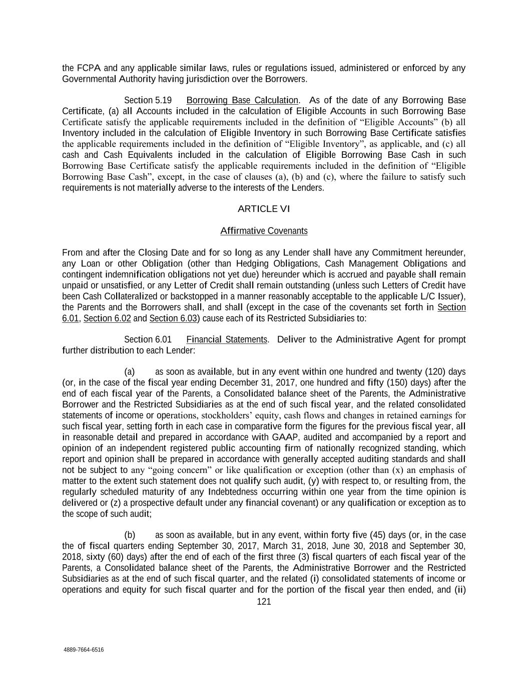 121 4889-7664-6516 the FCPA and any applicable similar laws, rules or regulations issued, administered or enforced by any Governmental Authority having jurisdiction over the Borrowers. Section 5.19 Borrowing Base Calculation. As of the date of any Borrowing Base Certificate, (a) all Accounts included in the calculation of Eligible Accounts in such Borrowing Base Certificate satisfy the applicable requirements included in the definition of “Eligible Accounts” (b) all Inventory included in the calculation of Eligible Inventory in such Borrowing Base Certificate satisfies the applicable requirements included in the definition of “Eligible Inventory”, as applicable, and (c) all cash and Cash Equivalents included in the calculation of Eligible Borrowing Base Cash in such Borrowing Base Certificate satisfy the applicable requirements included in the definition of “Eligible Borrowing Base Cash”, except, in the case of clauses (a), (b) and (c), where the failure to satisfy such requirements is not materially adverse to the interests of the Lenders. ARTICLE VI Affirmative Covenants From and after the Closing Date and for so long as any Lender shall have any Commitment hereunder, any Loan or other Obligation (other than Hedging Obligations, Cash Management Obligations and contingent indemnification obligations not yet due) hereunder which is accrued and payable shall remain unpaid or unsatisfied, or any Letter of Credit shall remain outstanding (unless such Letters of Credit have been Cash Collateralized or backstopped in a manner reasonably acceptable to the applicable L/C Issuer), the Parents and the Borrowers shall, and shall (except in the case of the covenants set forth in Section 6.01, Section 6.02 and Section 6.03) cause each of its Restricted Subsidiaries to: Section 6.01 Financial Statements. Deliver to the Administrative Agent for prompt further distribution to each Lender: (a) as soon as available, but in any event within one hundred and twenty (120) days (or, in the case of the fiscal year ending December 31, 2017, one hundred and fifty (150) days) after the end of each fiscal year of the Parents, a Consolidated balance sheet of the Parents, the Administrative Borrower and the Restricted Subsidiaries as at the end of such fiscal year, and the related consolidated statements of income or operations, stockholders’ equity, cash flows and changes in retained earnings for such fiscal year, setting forth in each case in comparative form the figures for the previous fiscal year, all in reasonable detail and prepared in accordance with GAAP, audited and accompanied by a report and opinion of an independent registered public accounting firm of nationally recognized standing, which report and opinion shall be prepared in accordance with generally accepted auditing standards and shall not be subject to any “going concern” or like qualification or exception (other than (x) an emphasis of matter to the extent such statement does not qualify such audit, (y) with respect to, or resulting from, the regularly scheduled maturity of any Indebtedness occurring within one year from the time opinion is delivered or (z) a prospective default under any financial covenant) or any qualification or exception as to the scope of such audit; (b) as soon as available, but in any event, within forty five (45) days (or, in the case the of fiscal quarters ending September 30, 2017, March 31, 2018, June 30, 2018 and September 30, 2018, sixty (60) days) after the end of each of the first three (3) fiscal quarters of each fiscal year of the Parents, a Consolidated balance sheet of the Parents, the Administrative Borrower and the Restricted Subsidiaries as at the end of such fiscal quarter, and the related (i) consolidated statements of income or operations and equity for such fiscal quarter and for the portion of the fiscal year then ended, and (ii)