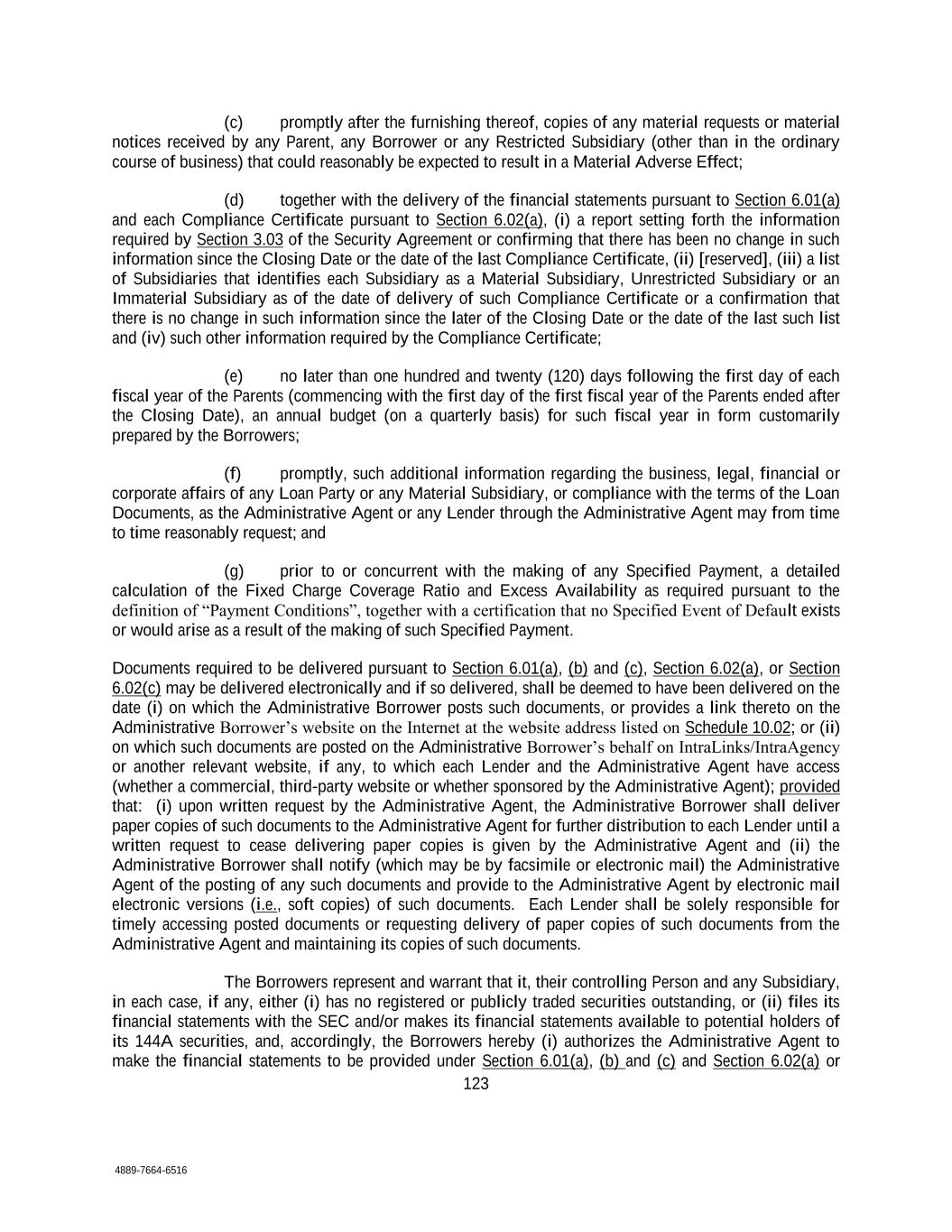 123 4889-7664-6516 (c) promptly after the furnishing thereof, copies of any material requests or material notices received by any Parent, any Borrower or any Restricted Subsidiary (other than in the ordinary course of business) that could reasonably be expected to result in a Material Adverse Effect; (d) together with the delivery of the financial statements pursuant to Section 6.01(a) and each Compliance Certificate pursuant to Section 6.02(a), (i) a report setting forth the information required by Section 3.03 of the Security Agreement or confirming that there has been no change in such information since the Closing Date or the date of the last Compliance Certificate, (ii) [reserved], (iii) a list of Subsidiaries that identifies each Subsidiary as a Material Subsidiary, Unrestricted Subsidiary or an Immaterial Subsidiary as of the date of delivery of such Compliance Certificate or a confirmation that there is no change in such information since the later of the Closing Date or the date of the last such list and (iv) such other information required by the Compliance Certificate; (e) no later than one hundred and twenty (120) days following the first day of each fiscal year of the Parents (commencing with the first day of the first fiscal year of the Parents ended after the Closing Date), an annual budget (on a quarterly basis) for such fiscal year in form customarily prepared by the Borrowers; (f) promptly, such additional information regarding the business, legal, financial or corporate affairs of any Loan Party or any Material Subsidiary, or compliance with the terms of the Loan Documents, as the Administrative Agent or any Lender through the Administrative Agent may from time to time reasonably request; and (g) prior to or concurrent with the making of any Specified Payment, a detailed calculation of the Fixed Charge Coverage Ratio and Excess Availability as required pursuant to the definition of “Payment Conditions”, together with a certification that no Specified Event of Default exists or would arise as a result of the making of such Specified Payment. Documents required to be delivered pursuant to Section 6.01(a), (b) and (c), Section 6.02(a), or Section 6.02(c) may be delivered electronically and if so delivered, shall be deemed to have been delivered on the date (i) on which the Administrative Borrower posts such documents, or provides a link thereto on the Administrative Borrower’s website on the Internet at the website address listed on Schedule 10.02; or (ii) on which such documents are posted on the Administrative Borrower’s behalf on IntraLinks/IntraAgency or another relevant website, if any, to which each Lender and the Administrative Agent have access (whether a commercial, third-party website or whether sponsored by the Administrative Agent); provided that: (i) upon written request by the Administrative Agent, the Administrative Borrower shall deliver paper copies of such documents to the Administrative Agent for further distribution to each Lender until a written request to cease delivering paper copies is given by the Administrative Agent and (ii) the Administrative Borrower shall notify (which may be by facsimile or electronic mail) the Administrative Agent of the posting of any such documents and provide to the Administrative Agent by electronic mail electronic versions (i.e., soft copies) of such documents. Each Lender shall be solely responsible for timely accessing posted documents or requesting delivery of paper copies of such documents from the Administrative Agent and maintaining its copies of such documents. The Borrowers represent and warrant that it, their controlling Person and any Subsidiary, in each case, if any, either (i) has no registered or publicly traded securities outstanding, or (ii) files its financial statements with the SEC and/or makes its financial statements available to potential holders of its 144A securities, and, accordingly, the Borrowers hereby (i) authorizes the Administrative Agent to make the financial statements to be provided under Section 6.01(a), (b) and (c) and Section 6.02(a) or