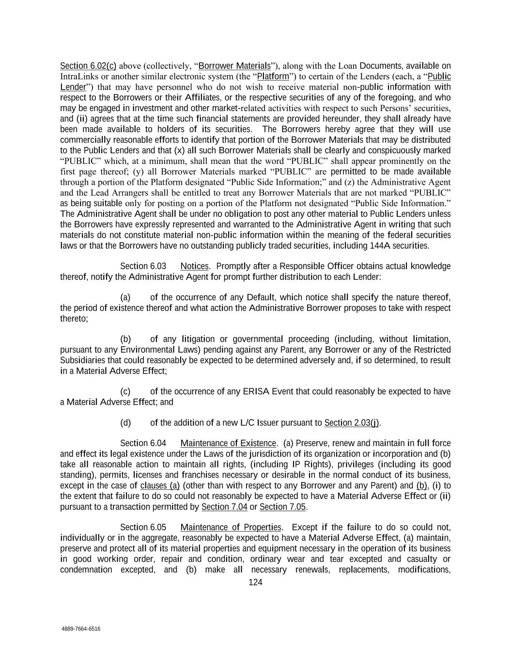 124 4889-7664-6516 Section 6.02(c) above (collectively, “Borrower Materials”), along with the Loan Documents, available on IntraLinks or another similar electronic system (the “Platform”) to certain of the Lenders (each, a “Public Lender”) that may have personnel who do not wish to receive material non-public information with respect to the Borrowers or their Affiliates, or the respective securities of any of the foregoing, and who may be engaged in investment and other market-related activities with respect to such Persons’ securities, and (ii) agrees that at the time such financial statements are provided hereunder, they shall already have been made available to holders of its securities. The Borrowers hereby agree that they will use commercially reasonable efforts to identify that portion of the Borrower Materials that may be distributed to the Public Lenders and that (x) all such Borrower Materials shall be clearly and conspicuously marked “PUBLIC” which, at a minimum, shall mean that the word “PUBLIC” shall appear prominently on the first page thereof; (y) all Borrower Materials marked “PUBLIC” are permitted to be made available through a portion of the Platform designated “Public Side Information;” and (z) the Administrative Agent and the Lead Arrangers shall be entitled to treat any Borrower Materials that are not marked “PUBLIC” as being suitable only for posting on a portion of the Platform not designated “Public Side Information.” The Administrative Agent shall be under no obligation to post any other material to Public Lenders unless the Borrowers have expressly represented and warranted to the Administrative Agent in writing that such materials do not constitute material non-public information within the meaning of the federal securities laws or that the Borrowers have no outstanding publicly traded securities, including 144A securities. Section 6.03 Notices. Promptly after a Responsible Officer obtains actual knowledge thereof, notify the Administrative Agent for prompt further distribution to each Lender: (a) of the occurrence of any Default, which notice shall specify the nature thereof, the period of existence thereof and what action the Administrative Borrower proposes to take with respect thereto; (b) of any litigation or governmental proceeding (including, without limitation, pursuant to any Environmental Laws) pending against any Parent, any Borrower or any of the Restricted Subsidiaries that could reasonably be expected to be determined adversely and, if so determined, to result in a Material Adverse Effect; (c) of the occurrence of any ERISA Event that could reasonably be expected to have a Material Adverse Effect; and (d) of the addition of a new L/C Issuer pursuant to Section 2.03(j). Section 6.04 Maintenance of Existence. (a) Preserve, renew and maintain in full force and effect its legal existence under the Laws of the jurisdiction of its organization or incorporation and (b) take all reasonable action to maintain all rights, (including IP Rights), privileges (including its good standing), permits, licenses and franchises necessary or desirable in the normal conduct of its business, except in the case of clauses (a) (other than with respect to any Borrower and any Parent) and (b), (i) to the extent that failure to do so could not reasonably be expected to have a Material Adverse Effect or (ii) pursuant to a transaction permitted by Section 7.04 or Section 7.05. Section 6.05 Maintenance of Properties. Except if the failure to do so could not, individually or in the aggregate, reasonably be expected to have a Material Adverse Effect, (a) maintain, preserve and protect all of its material properties and equipment necessary in the operation of its business in good working order, repair and condition, ordinary wear and tear excepted and casualty or condemnation excepted, and (b) make all necessary renewals, replacements, modifications,