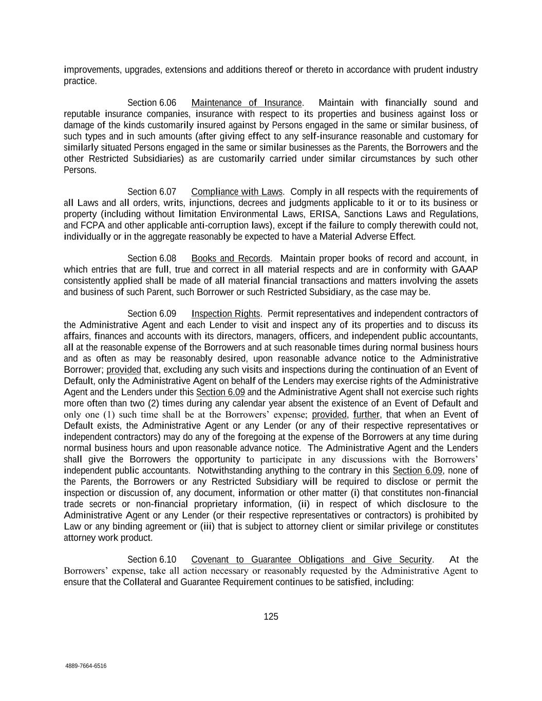 125 4889-7664-6516 improvements, upgrades, extensions and additions thereof or thereto in accordance with prudent industry practice. Section 6.06 Maintenance of Insurance. Maintain with financially sound and reputable insurance companies, insurance with respect to its properties and business against loss or damage of the kinds customarily insured against by Persons engaged in the same or similar business, of such types and in such amounts (after giving effect to any self-insurance reasonable and customary for similarly situated Persons engaged in the same or similar businesses as the Parents, the Borrowers and the other Restricted Subsidiaries) as are customarily carried under similar circumstances by such other Persons. Section 6.07 Compliance with Laws. Comply in all respects with the requirements of all Laws and all orders, writs, injunctions, decrees and judgments applicable to it or to its business or property (including without limitation Environmental Laws, ERISA, Sanctions Laws and Regulations, and FCPA and other applicable anti-corruption laws), except if the failure to comply therewith could not, individually or in the aggregate reasonably be expected to have a Material Adverse Effect. Section 6.08 Books and Records. Maintain proper books of record and account, in which entries that are full, true and correct in all material respects and are in conformity with GAAP consistently applied shall be made of all material financial transactions and matters involving the assets and business of such Parent, such Borrower or such Restricted Subsidiary, as the case may be. Section 6.09 Inspection Rights. Permit representatives and independent contractors of the Administrative Agent and each Lender to visit and inspect any of its properties and to discuss its affairs, finances and accounts with its directors, managers, officers, and independent public accountants, all at the reasonable expense of the Borrowers and at such reasonable times during normal business hours and as often as may be reasonably desired, upon reasonable advance notice to the Administrative Borrower; provided that, excluding any such visits and inspections during the continuation of an Event of Default, only the Administrative Agent on behalf of the Lenders may exercise rights of the Administrative Agent and the Lenders under this Section 6.09 and the Administrative Agent shall not exercise such rights more often than two (2) times during any calendar year absent the existence of an Event of Default and only one (1) such time shall be at the Borrowers’ expense; provided, further, that when an Event of Default exists, the Administrative Agent or any Lender (or any of their respective representatives or independent contractors) may do any of the foregoing at the expense of the Borrowers at any time during normal business hours and upon reasonable advance notice. The Administrative Agent and the Lenders shall give the Borrowers the opportunity to participate in any discussions with the Borrowers’ independent public accountants. Notwithstanding anything to the contrary in this Section 6.09, none of the Parents, the Borrowers or any Restricted Subsidiary will be required to disclose or permit the inspection or discussion of, any document, information or other matter (i) that constitutes non-financial trade secrets or non-financial proprietary information, (ii) in respect of which disclosure to the Administrative Agent or any Lender (or their respective representatives or contractors) is prohibited by Law or any binding agreement or (iii) that is subject to attorney client or similar privilege or constitutes attorney work product. Section 6.10 Covenant to Guarantee Obligations and Give Security. At the Borrowers’ expense, take all action necessary or reasonably requested by the Administrative Agent to ensure that the Collateral and Guarantee Requirement continues to be satisfied, including: