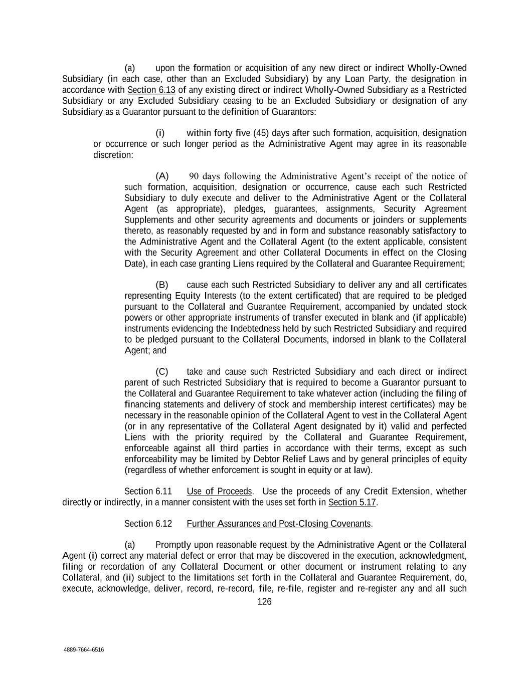 126 4889-7664-6516 (a) upon the formation or acquisition of any new direct or indirect Wholly-Owned Subsidiary (in each case, other than an Excluded Subsidiary) by any Loan Party, the designation in accordance with Section 6.13 of any existing direct or indirect Wholly-Owned Subsidiary as a Restricted Subsidiary or any Excluded Subsidiary ceasing to be an Excluded Subsidiary or designation of any Subsidiary as a Guarantor pursuant to the definition of Guarantors: (i) within forty five (45) days after such formation, acquisition, designation or occurrence or such longer period as the Administrative Agent may agree in its reasonable discretion: (A) 90 days following the Administrative Agent’s receipt of the notice of such formation, acquisition, designation or occurrence, cause each such Restricted Subsidiary to duly execute and deliver to the Administrative Agent or the Collateral Agent (as appropriate), pledges, guarantees, assignments, Security Agreement Supplements and other security agreements and documents or joinders or supplements thereto, as reasonably requested by and in form and substance reasonably satisfactory to the Administrative Agent and the Collateral Agent (to the extent applicable, consistent with the Security Agreement and other Collateral Documents in effect on the Closing Date), in each case granting Liens required by the Collateral and Guarantee Requirement; (B) cause each such Restricted Subsidiary to deliver any and all certificates representing Equity Interests (to the extent certificated) that are required to be pledged pursuant to the Collateral and Guarantee Requirement, accompanied by undated stock powers or other appropriate instruments of transfer executed in blank and (if applicable) instruments evidencing the Indebtedness held by such Restricted Subsidiary and required to be pledged pursuant to the Collateral Documents, indorsed in blank to the Collateral Agent; and (C) take and cause such Restricted Subsidiary and each direct or indirect parent of such Restricted Subsidiary that is required to become a Guarantor pursuant to the Collateral and Guarantee Requirement to take whatever action (including the filing of financing statements and delivery of stock and membership interest certificates) may be necessary in the reasonable opinion of the Collateral Agent to vest in the Collateral Agent (or in any representative of the Collateral Agent designated by it) valid and perfected Liens with the priority required by the Collateral and Guarantee Requirement, enforceable against all third parties in accordance with their terms, except as such enforceability may be limited by Debtor Relief Laws and by general principles of equity (regardless of whether enforcement is sought in equity or at law). Section 6.11 Use of Proceeds. Use the proceeds of any Credit Extension, whether directly or indirectly, in a manner consistent with the uses set forth in Section 5.17. Section 6.12 Further Assurances and Post-Closing Covenants. (a) Promptly upon reasonable request by the Administrative Agent or the Collateral Agent (i) correct any material defect or error that may be discovered in the execution, acknowledgment, filing or recordation of any Collateral Document or other document or instrument relating to any Collateral, and (ii) subject to the limitations set forth in the Collateral and Guarantee Requirement, do, execute, acknowledge, deliver, record, re-record, file, re-file, register and re-register any and all such
