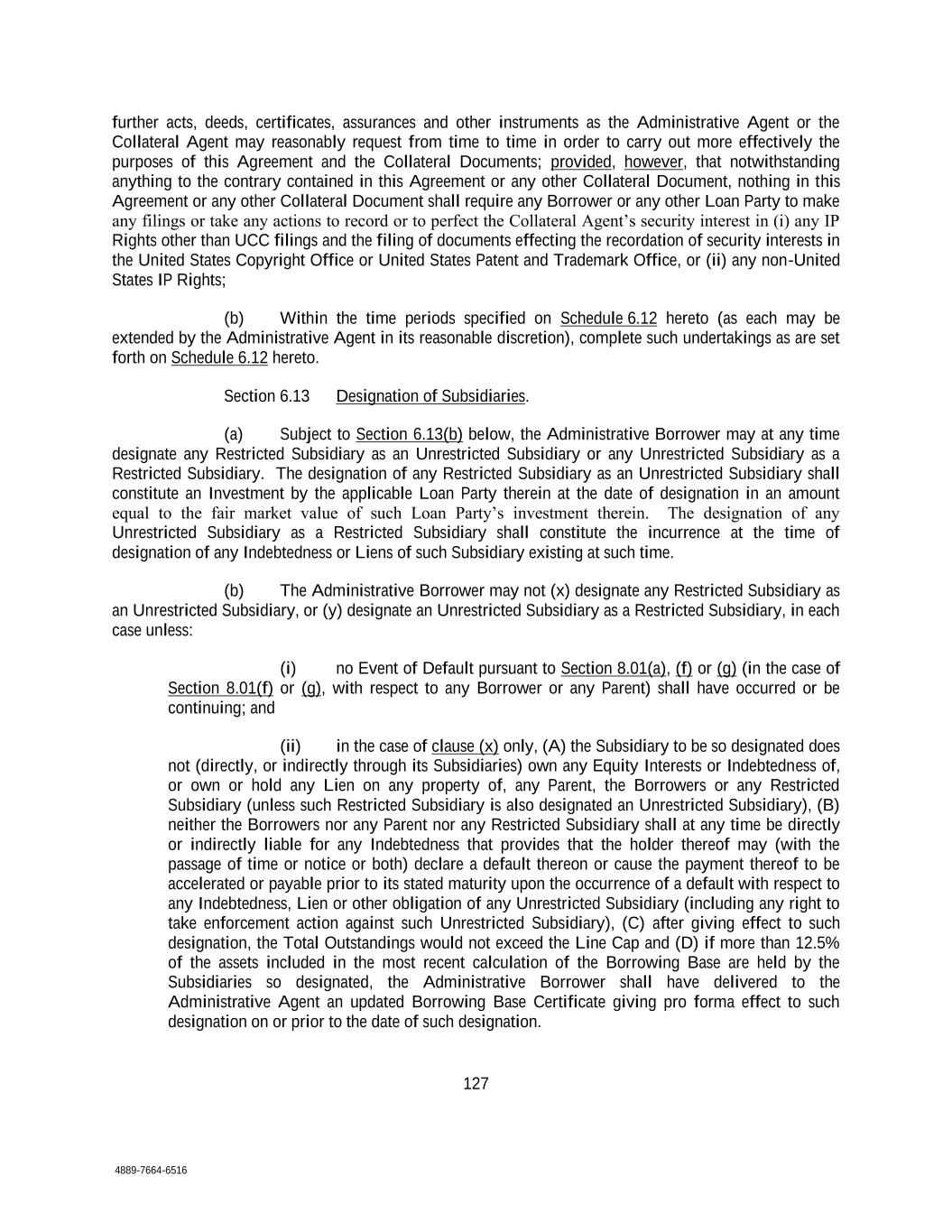 127 4889-7664-6516 further acts, deeds, certificates, assurances and other instruments as the Administrative Agent or the Collateral Agent may reasonably request from time to time in order to carry out more effectively the purposes of this Agreement and the Collateral Documents; provided, however, that notwithstanding anything to the contrary contained in this Agreement or any other Collateral Document, nothing in this Agreement or any other Collateral Document shall require any Borrower or any other Loan Party to make any filings or take any actions to record or to perfect the Collateral Agent’s security interest in (i) any IP Rights other than UCC filings and the filing of documents effecting the recordation of security interests in the United States Copyright Office or United States Patent and Trademark Office, or (ii) any non-United States IP Rights; (b) Within the time periods specified on Schedule 6.12 hereto (as each may be extended by the Administrative Agent in its reasonable discretion), complete such undertakings as are set forth on Schedule 6.12 hereto. Section 6.13 Designation of Subsidiaries. (a) Subject to Section 6.13(b) below, the Administrative Borrower may at any time designate any Restricted Subsidiary as an Unrestricted Subsidiary or any Unrestricted Subsidiary as a Restricted Subsidiary. The designation of any Restricted Subsidiary as an Unrestricted Subsidiary shall constitute an Investment by the applicable Loan Party therein at the date of designation in an amount equal to the fair market value of such Loan Party’s investment therein. The designation of any Unrestricted Subsidiary as a Restricted Subsidiary shall constitute the incurrence at the time of designation of any Indebtedness or Liens of such Subsidiary existing at such time. (b) The Administrative Borrower may not (x) designate any Restricted Subsidiary as an Unrestricted Subsidiary, or (y) designate an Unrestricted Subsidiary as a Restricted Subsidiary, in each case unless: (i) no Event of Default pursuant to Section 8.01(a), (f) or (g) (in the case of Section 8.01(f) or (g), with respect to any Borrower or any Parent) shall have occurred or be continuing; and (ii) in the case of clause (x) only, (A) the Subsidiary to be so designated does not (directly, or indirectly through its Subsidiaries) own any Equity Interests or Indebtedness of, or own or hold any Lien on any property of, any Parent, the Borrowers or any Restricted Subsidiary (unless such Restricted Subsidiary is also designated an Unrestricted Subsidiary), (B) neither the Borrowers nor any Parent nor any Restricted Subsidiary shall at any time be directly or indirectly liable for any Indebtedness that provides that the holder thereof may (with the passage of time or notice or both) declare a default thereon or cause the payment thereof to be accelerated or payable prior to its stated maturity upon the occurrence of a default with respect to any Indebtedness, Lien or other obligation of any Unrestricted Subsidiary (including any right to take enforcement action against such Unrestricted Subsidiary), (C) after giving effect to such designation, the Total Outstandings would not exceed the Line Cap and (D) if more than 12.5% of the assets included in the most recent calculation of the Borrowing Base are held by the Subsidiaries so designated, the Administrative Borrower shall have delivered to the Administrative Agent an updated Borrowing Base Certificate giving pro forma effect to such designation on or prior to the date of such designation.