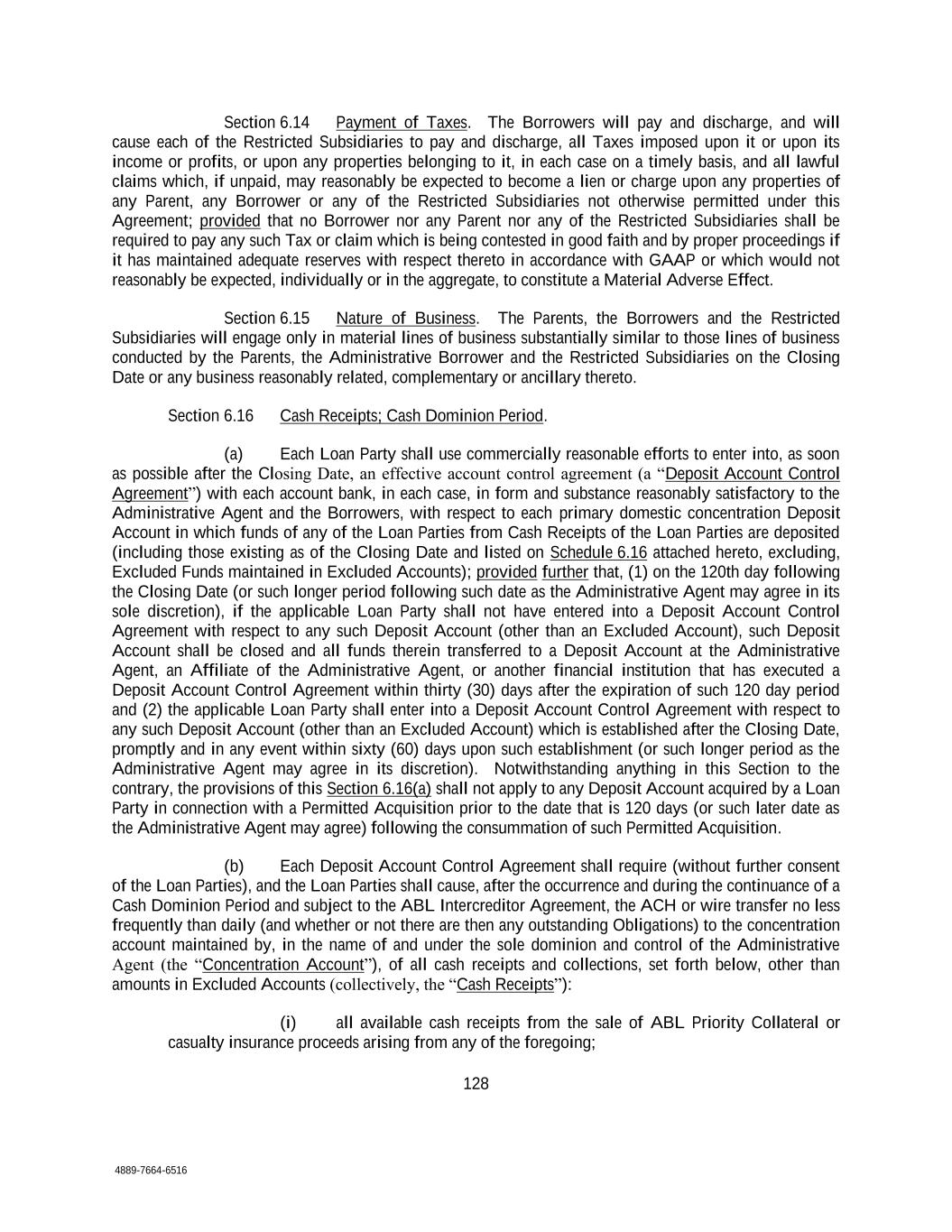 128 4889-7664-6516 Section 6.14 Payment of Taxes. The Borrowers will pay and discharge, and will cause each of the Restricted Subsidiaries to pay and discharge, all Taxes imposed upon it or upon its income or profits, or upon any properties belonging to it, in each case on a timely basis, and all lawful claims which, if unpaid, may reasonably be expected to become a lien or charge upon any properties of any Parent, any Borrower or any of the Restricted Subsidiaries not otherwise permitted under this Agreement; provided that no Borrower nor any Parent nor any of the Restricted Subsidiaries shall be required to pay any such Tax or claim which is being contested in good faith and by proper proceedings if it has maintained adequate reserves with respect thereto in accordance with GAAP or which would not reasonably be expected, individually or in the aggregate, to constitute a Material Adverse Effect. Section 6.15 Nature of Business. The Parents, the Borrowers and the Restricted Subsidiaries will engage only in material lines of business substantially similar to those lines of business conducted by the Parents, the Administrative Borrower and the Restricted Subsidiaries on the Closing Date or any business reasonably related, complementary or ancillary thereto. Section 6.16 Cash Receipts; Cash Dominion Period. (a) Each Loan Party shall use commercially reasonable efforts to enter into, as soon as possible after the Closing Date, an effective account control agreement (a “Deposit Account Control Agreement”) with each account bank, in each case, in form and substance reasonably satisfactory to the Administrative Agent and the Borrowers, with respect to each primary domestic concentration Deposit Account in which funds of any of the Loan Parties from Cash Receipts of the Loan Parties are deposited (including those existing as of the Closing Date and listed on Schedule 6.16 attached hereto, excluding, Excluded Funds maintained in Excluded Accounts); provided further that, (1) on the 120th day following the Closing Date (or such longer period following such date as the Administrative Agent may agree in its sole discretion), if the applicable Loan Party shall not have entered into a Deposit Account Control Agreement with respect to any such Deposit Account (other than an Excluded Account), such Deposit Account shall be closed and all funds therein transferred to a Deposit Account at the Administrative Agent, an Affiliate of the Administrative Agent, or another financial institution that has executed a Deposit Account Control Agreement within thirty (30) days after the expiration of such 120 day period and (2) the applicable Loan Party shall enter into a Deposit Account Control Agreement with respect to any such Deposit Account (other than an Excluded Account) which is established after the Closing Date, promptly and in any event within sixty (60) days upon such establishment (or such longer period as the Administrative Agent may agree in its discretion). Notwithstanding anything in this Section to the contrary, the provisions of this Section 6.16(a) shall not apply to any Deposit Account acquired by a Loan Party in connection with a Permitted Acquisition prior to the date that is 120 days (or such later date as the Administrative Agent may agree) following the consummation of such Permitted Acquisition. (b) Each Deposit Account Control Agreement shall require (without further consent of the Loan Parties), and the Loan Parties shall cause, after the occurrence and during the continuance of a Cash Dominion Period and subject to the ABL Intercreditor Agreement, the ACH or wire transfer no less frequently than daily (and whether or not there are then any outstanding Obligations) to the concentration account maintained by, in the name of and under the sole dominion and control of the Administrative Agent (the “Concentration Account”), of all cash receipts and collections, set forth below, other than amounts in Excluded Accounts (collectively, the “Cash Receipts”): (i) all available cash receipts from the sale of ABL Priority Collateral or casualty insurance proceeds arising from any of the foregoing;