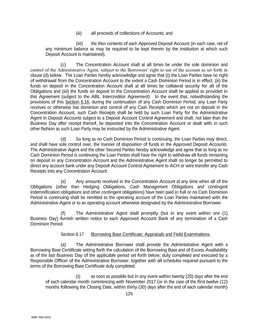 129 4889-7664-6516 (ii) all proceeds of collections of Accounts; and (iii) the then contents of each Approved Deposit Account (in each case, net of any minimum balance as may be required to be kept therein by the institution at which such Deposit Account is maintained). (c) The Concentration Account shall at all times be under the sole dominion and control of the Administrative Agent, subject to the Borrowers’ right to use of the account as set forth in clause (d) below. The Loan Parties hereby acknowledge and agree that (i) the Loan Parties have no right of withdrawal from the Concentration Account to the extent a Cash Dominion Period is in effect, (ii) the funds on deposit in the Concentration Account shall at all times be collateral security for all of the Obligations and (iii) the funds on deposit in the Concentration Account shall be applied as provided in this Agreement (subject to the ABL Intercreditor Agreement). In the event that, notwithstanding the provisions of this Section 6.16, during the continuation of any Cash Dominion Period, any Loan Party receives or otherwise has dominion and control of any Cash Receipts which are not on deposit in the Concentration Account, such Cash Receipts shall be held by such Loan Party for the Administrative Agent in Deposit Accounts subject to a Deposit Account Control Agreement and shall, not later than the Business Day after receipt thereof, be deposited into the Concentration Account or dealt with in such other fashion as such Loan Party may be instructed by the Administrative Agent. (d) So long as no Cash Dominion Period is continuing, the Loan Parties may direct, and shall have sole control over, the manner of disposition of funds in the Approved Deposit Accounts. The Administrative Agent and the other Secured Parties hereby acknowledge and agree that so long as no Cash Dominion Period is continuing the Loan Parties shall have the right to withdraw all funds remaining on deposit in any Concentration Account and the Administrative Agent shall no longer be permitted to direct any account bank under any Deposit Account Control Agreement to ACH or wire transfer any Cash Receipts into any Concentration Account. (e) Any amounts received in the Concentration Account at any time when all of the Obligations (other than Hedging Obligations, Cash Management Obligations and contingent indemnification obligations and other contingent obligations) have been paid in full or no Cash Dominion Period is continuing shall be remitted to the operating account of the Loan Parties maintained with the Administrative Agent or to an operating account otherwise designated by the Administrative Borrower. (f) The Administrative Agent shall promptly (but in any event within one (1) Business Day) furnish written notice to each Approved Account Bank of any termination of a Cash Dominion Period. Section 6.17 Borrowing Base Certificate; Appraisals and Field Examinations. (a) The Administrative Borrower shall provide the Administrative Agent with a Borrowing Base Certificate setting forth the calculation of the Borrowing Base and of Excess Availability as of the last Business Day of the applicable period set forth below, duly completed and executed by a Responsible Officer of the Administrative Borrower, together with all schedules required pursuant to the terms of the Borrowing Base Certificate duly completed: (i) as soon as possible but in any event within twenty (20) days after the end of each calendar month commencing with November 2017 (or in the case of the first twelve (12) months following the Closing Date, within thirty (30) days after the end of each calendar month)
