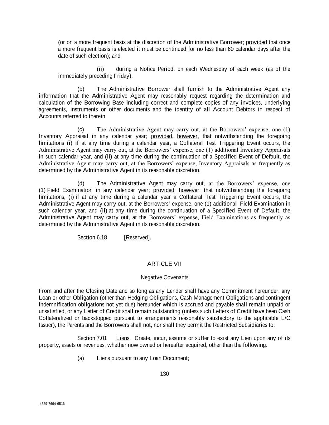 130 4889-7664-6516 (or on a more frequent basis at the discretion of the Administrative Borrower; provided that once a more frequent basis is elected it must be continued for no less than 60 calendar days after the date of such election); and (ii) during a Notice Period, on each Wednesday of each week (as of the immediately preceding Friday). (b) The Administrative Borrower shall furnish to the Administrative Agent any information that the Administrative Agent may reasonably request regarding the determination and calculation of the Borrowing Base including correct and complete copies of any invoices, underlying agreements, instruments or other documents and the identity of all Account Debtors in respect of Accounts referred to therein. (c) The Administrative Agent may carry out, at the Borrowers’ expense, one (1) Inventory Appraisal in any calendar year; provided, however, that notwithstanding the foregoing limitations (i) if at any time during a calendar year, a Collateral Test Triggering Event occurs, the Administrative Agent may carry out, at the Borrowers’ expense, one (1) additional Inventory Appraisals in such calendar year, and (ii) at any time during the continuation of a Specified Event of Default, the Administrative Agent may carry out, at the Borrowers’ expense, Inventory Appraisals as frequently as determined by the Administrative Agent in its reasonable discretion. (d) The Administrative Agent may carry out, at the Borrowers’ expense, one (1) Field Examination in any calendar year; provided, however, that notwithstanding the foregoing limitations, (i) if at any time during a calendar year a Collateral Test Triggering Event occurs, the Administrative Agent may carry out, at the Borrowers’ expense, one (1) additional Field Examination in such calendar year, and (ii) at any time during the continuation of a Specified Event of Default, the Administrative Agent may carry out, at the Borrowers’ expense, Field Examinations as frequently as determined by the Administrative Agent in its reasonable discretion. Section 6.18 [Reserved]. ARTICLE VII Negative Covenants From and after the Closing Date and so long as any Lender shall have any Commitment hereunder, any Loan or other Obligation (other than Hedging Obligations, Cash Management Obligations and contingent indemnification obligations not yet due) hereunder which is accrued and payable shall remain unpaid or unsatisfied, or any Letter of Credit shall remain outstanding (unless such Letters of Credit have been Cash Collateralized or backstopped pursuant to arrangements reasonably satisfactory to the applicable L/C Issuer), the Parents and the Borrowers shall not, nor shall they permit the Restricted Subsidiaries to: Section 7.01 Liens. Create, incur, assume or suffer to exist any Lien upon any of its property, assets or revenues, whether now owned or hereafter acquired, other than the following: (a) Liens pursuant to any Loan Document;