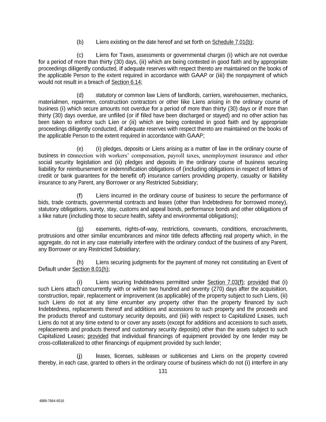 131 4889-7664-6516 (b) Liens existing on the date hereof and set forth on Schedule 7.01(b); (c) Liens for Taxes, assessments or governmental charges (i) which are not overdue for a period of more than thirty (30) days, (ii) which are being contested in good faith and by appropriate proceedings diligently conducted, if adequate reserves with respect thereto are maintained on the books of the applicable Person to the extent required in accordance with GAAP or (iii) the nonpayment of which would not result in a breach of Section 6.14; (d) statutory or common law Liens of landlords, carriers, warehousemen, mechanics, materialmen, repairmen, construction contractors or other like Liens arising in the ordinary course of business (i) which secure amounts not overdue for a period of more than thirty (30) days or if more than thirty (30) days overdue, are unfiled (or if filed have been discharged or stayed) and no other action has been taken to enforce such Lien or (ii) which are being contested in good faith and by appropriate proceedings diligently conducted, if adequate reserves with respect thereto are maintained on the books of the applicable Person to the extent required in accordance with GAAP; (e) (i) pledges, deposits or Liens arising as a matter of law in the ordinary course of business in connection with workers’ compensation, payroll taxes, unemployment insurance and other social security legislation and (ii) pledges and deposits in the ordinary course of business securing liability for reimbursement or indemnification obligations of (including obligations in respect of letters of credit or bank guarantees for the benefit of) insurance carriers providing property, casualty or liability insurance to any Parent, any Borrower or any Restricted Subsidiary; (f) Liens incurred in the ordinary course of business to secure the performance of bids, trade contracts, governmental contracts and leases (other than Indebtedness for borrowed money), statutory obligations, surety, stay, customs and appeal bonds, performance bonds and other obligations of a like nature (including those to secure health, safety and environmental obligations); (g) easements, rights-of-way, restrictions, covenants, conditions, encroachments, protrusions and other similar encumbrances and minor title defects affecting real property which, in the aggregate, do not in any case materially interfere with the ordinary conduct of the business of any Parent, any Borrower or any Restricted Subsidiary; (h) Liens securing judgments for the payment of money not constituting an Event of Default under Section 8.01(h); (i) Liens securing Indebtedness permitted under Section 7.03(f); provided that (i) such Liens attach concurrently with or within two hundred and seventy (270) days after the acquisition, construction, repair, replacement or improvement (as applicable) of the property subject to such Liens, (ii) such Liens do not at any time encumber any property other than the property financed by such Indebtedness, replacements thereof and additions and accessions to such property and the proceeds and the products thereof and customary security deposits, and (iii) with respect to Capitalized Leases, such Liens do not at any time extend to or cover any assets (except for additions and accessions to such assets, replacements and products thereof and customary security deposits) other than the assets subject to such Capitalized Leases; provided that individual financings of equipment provided by one lender may be cross-collateralized to other financings of equipment provided by such lender; (j) leases, licenses, subleases or sublicenses and Liens on the property covered thereby, in each case, granted to others in the ordinary course of business which do not (i) interfere in any