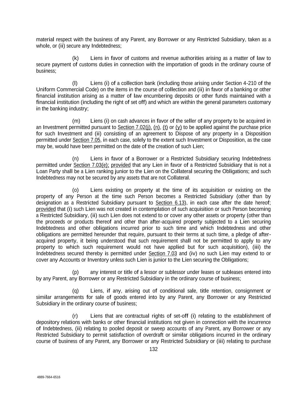 132 4889-7664-6516 material respect with the business of any Parent, any Borrower or any Restricted Subsidiary, taken as a whole, or (ii) secure any Indebtedness; (k) Liens in favor of customs and revenue authorities arising as a matter of law to secure payment of customs duties in connection with the importation of goods in the ordinary course of business; (l) Liens (i) of a collection bank (including those arising under Section 4-210 of the Uniform Commercial Code) on the items in the course of collection and (ii) in favor of a banking or other financial institution arising as a matter of law encumbering deposits or other funds maintained with a financial institution (including the right of set off) and which are within the general parameters customary in the banking industry; (m) Liens (i) on cash advances in favor of the seller of any property to be acquired in an Investment permitted pursuant to Section 7.02(j), (n), (t) or (y) to be applied against the purchase price for such Investment and (ii) consisting of an agreement to Dispose of any property in a Disposition permitted under Section 7.05, in each case, solely to the extent such Investment or Disposition, as the case may be, would have been permitted on the date of the creation of such Lien; (n) Liens in favor of a Borrower or a Restricted Subsidiary securing Indebtedness permitted under Section 7.03(e); provided that any Lien in favor of a Restricted Subsidiary that is not a Loan Party shall be a Lien ranking junior to the Lien on the Collateral securing the Obligations; and such Indebtedness may not be secured by any assets that are not Collateral. (o) Liens existing on property at the time of its acquisition or existing on the property of any Person at the time such Person becomes a Restricted Subsidiary (other than by designation as a Restricted Subsidiary pursuant to Section 6.13), in each case after the date hereof; provided that (i) such Lien was not created in contemplation of such acquisition or such Person becoming a Restricted Subsidiary, (ii) such Lien does not extend to or cover any other assets or property (other than the proceeds or products thereof and other than after-acquired property subjected to a Lien securing Indebtedness and other obligations incurred prior to such time and which Indebtedness and other obligations are permitted hereunder that require, pursuant to their terms at such time, a pledge of after- acquired property, it being understood that such requirement shall not be permitted to apply to any property to which such requirement would not have applied but for such acquisition), (iii) the Indebtedness secured thereby is permitted under Section 7.03 and (iv) no such Lien may extend to or cover any Accounts or Inventory unless such Lien is junior to the Lien securing the Obligations; (p) any interest or title of a lessor or sublessor under leases or subleases entered into by any Parent, any Borrower or any Restricted Subsidiary in the ordinary course of business; (q) Liens, if any, arising out of conditional sale, title retention, consignment or similar arrangements for sale of goods entered into by any Parent, any Borrower or any Restricted Subsidiary in the ordinary course of business; (r) Liens that are contractual rights of set-off (i) relating to the establishment of depository relations with banks or other financial institutions not given in connection with the incurrence of Indebtedness, (ii) relating to pooled deposit or sweep accounts of any Parent, any Borrower or any Restricted Subsidiary to permit satisfaction of overdraft or similar obligations incurred in the ordinary course of business of any Parent, any Borrower or any Restricted Subsidiary or (iii) relating to purchase
