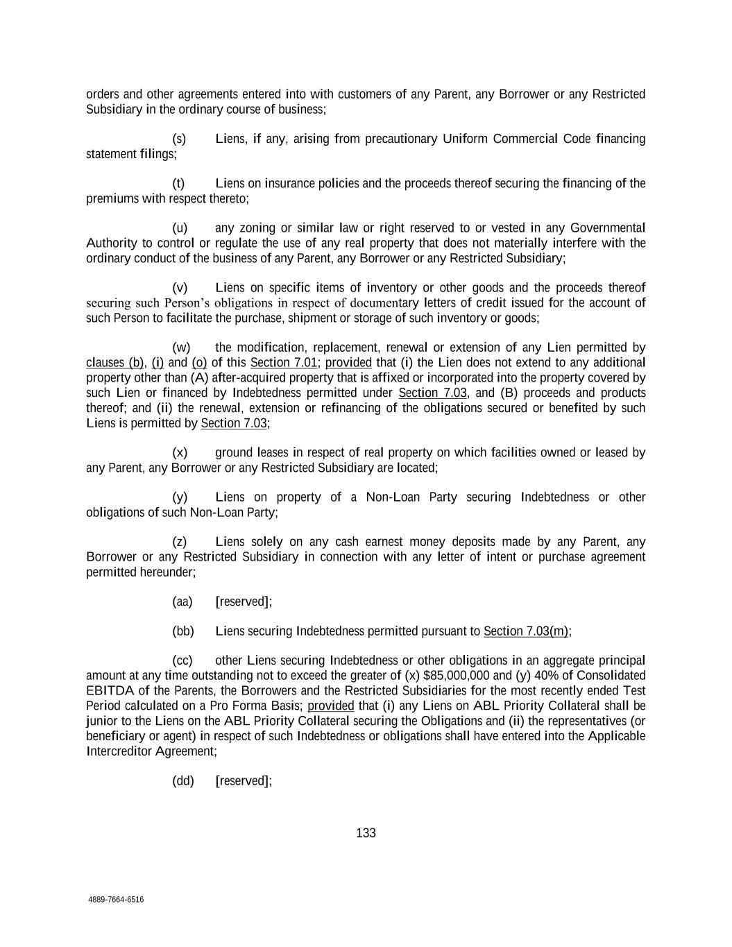 133 4889-7664-6516 orders and other agreements entered into with customers of any Parent, any Borrower or any Restricted Subsidiary in the ordinary course of business; (s) Liens, if any, arising from precautionary Uniform Commercial Code financing statement filings; (t) Liens on insurance policies and the proceeds thereof securing the financing of the premiums with respect thereto; (u) any zoning or similar law or right reserved to or vested in any Governmental Authority to control or regulate the use of any real property that does not materially interfere with the ordinary conduct of the business of any Parent, any Borrower or any Restricted Subsidiary; (v) Liens on specific items of inventory or other goods and the proceeds thereof securing such Person’s obligations in respect of documentary letters of credit issued for the account of such Person to facilitate the purchase, shipment or storage of such inventory or goods; (w) the modification, replacement, renewal or extension of any Lien permitted by clauses (b), (i) and (o) of this Section 7.01; provided that (i) the Lien does not extend to any additional property other than (A) after-acquired property that is affixed or incorporated into the property covered by such Lien or financed by Indebtedness permitted under Section 7.03, and (B) proceeds and products thereof; and (ii) the renewal, extension or refinancing of the obligations secured or benefited by such Liens is permitted by Section 7.03; (x) ground leases in respect of real property on which facilities owned or leased by any Parent, any Borrower or any Restricted Subsidiary are located; (y) Liens on property of a Non-Loan Party securing Indebtedness or other obligations of such Non-Loan Party; (z) Liens solely on any cash earnest money deposits made by any Parent, any Borrower or any Restricted Subsidiary in connection with any letter of intent or purchase agreement permitted hereunder; (aa) [reserved]; (bb) Liens securing Indebtedness permitted pursuant to Section 7.03(m); (cc) other Liens securing Indebtedness or other obligations in an aggregate principal amount at any time outstanding not to exceed the greater of (x) $85,000,000 and (y) 40% of Consolidated EBITDA of the Parents, the Borrowers and the Restricted Subsidiaries for the most recently ended Test Period calculated on a Pro Forma Basis; provided that (i) any Liens on ABL Priority Collateral shall be junior to the Liens on the ABL Priority Collateral securing the Obligations and (ii) the representatives (or beneficiary or agent) in respect of such Indebtedness or obligations shall have entered into the Applicable Intercreditor Agreement; (dd) [reserved];