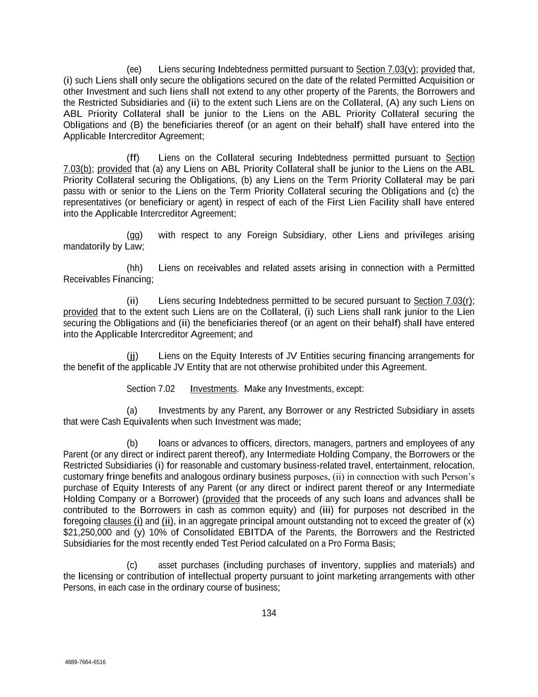 134 4889-7664-6516 (ee) Liens securing Indebtedness permitted pursuant to Section 7.03(v); provided that, (i) such Liens shall only secure the obligations secured on the date of the related Permitted Acquisition or other Investment and such liens shall not extend to any other property of the Parents, the Borrowers and the Restricted Subsidiaries and (ii) to the extent such Liens are on the Collateral, (A) any such Liens on ABL Priority Collateral shall be junior to the Liens on the ABL Priority Collateral securing the Obligations and (B) the beneficiaries thereof (or an agent on their behalf) shall have entered into the Applicable Intercreditor Agreement; (ff) Liens on the Collateral securing Indebtedness permitted pursuant to Section 7.03(b); provided that (a) any Liens on ABL Priority Collateral shall be junior to the Liens on the ABL Priority Collateral securing the Obligations, (b) any Liens on the Term Priority Collateral may be pari passu with or senior to the Liens on the Term Priority Collateral securing the Obligations and (c) the representatives (or beneficiary or agent) in respect of each of the First Lien Facility shall have entered into the Applicable Intercreditor Agreement; (gg) with respect to any Foreign Subsidiary, other Liens and privileges arising mandatorily by Law; (hh) Liens on receivables and related assets arising in connection with a Permitted Receivables Financing; (ii) Liens securing Indebtedness permitted to be secured pursuant to Section 7.03(r); provided that to the extent such Liens are on the Collateral, (i) such Liens shall rank junior to the Lien securing the Obligations and (ii) the beneficiaries thereof (or an agent on their behalf) shall have entered into the Applicable Intercreditor Agreement; and (jj) Liens on the Equity Interests of JV Entities securing financing arrangements for the benefit of the applicable JV Entity that are not otherwise prohibited under this Agreement. Section 7.02 Investments. Make any Investments, except: (a) Investments by any Parent, any Borrower or any Restricted Subsidiary in assets that were Cash Equivalents when such Investment was made; (b) loans or advances to officers, directors, managers, partners and employees of any Parent (or any direct or indirect parent thereof), any Intermediate Holding Company, the Borrowers or the Restricted Subsidiaries (i) for reasonable and customary business-related travel, entertainment, relocation, customary fringe benefits and analogous ordinary business purposes, (ii) in connection with such Person’s purchase of Equity Interests of any Parent (or any direct or indirect parent thereof or any Intermediate Holding Company or a Borrower) (provided that the proceeds of any such loans and advances shall be contributed to the Borrowers in cash as common equity) and (iii) for purposes not described in the foregoing clauses (i) and (ii), in an aggregate principal amount outstanding not to exceed the greater of (x) $21,250,000 and (y) 10% of Consolidated EBITDA of the Parents, the Borrowers and the Restricted Subsidiaries for the most recently ended Test Period calculated on a Pro Forma Basis; (c) asset purchases (including purchases of inventory, supplies and materials) and the licensing or contribution of intellectual property pursuant to joint marketing arrangements with other Persons, in each case in the ordinary course of business;