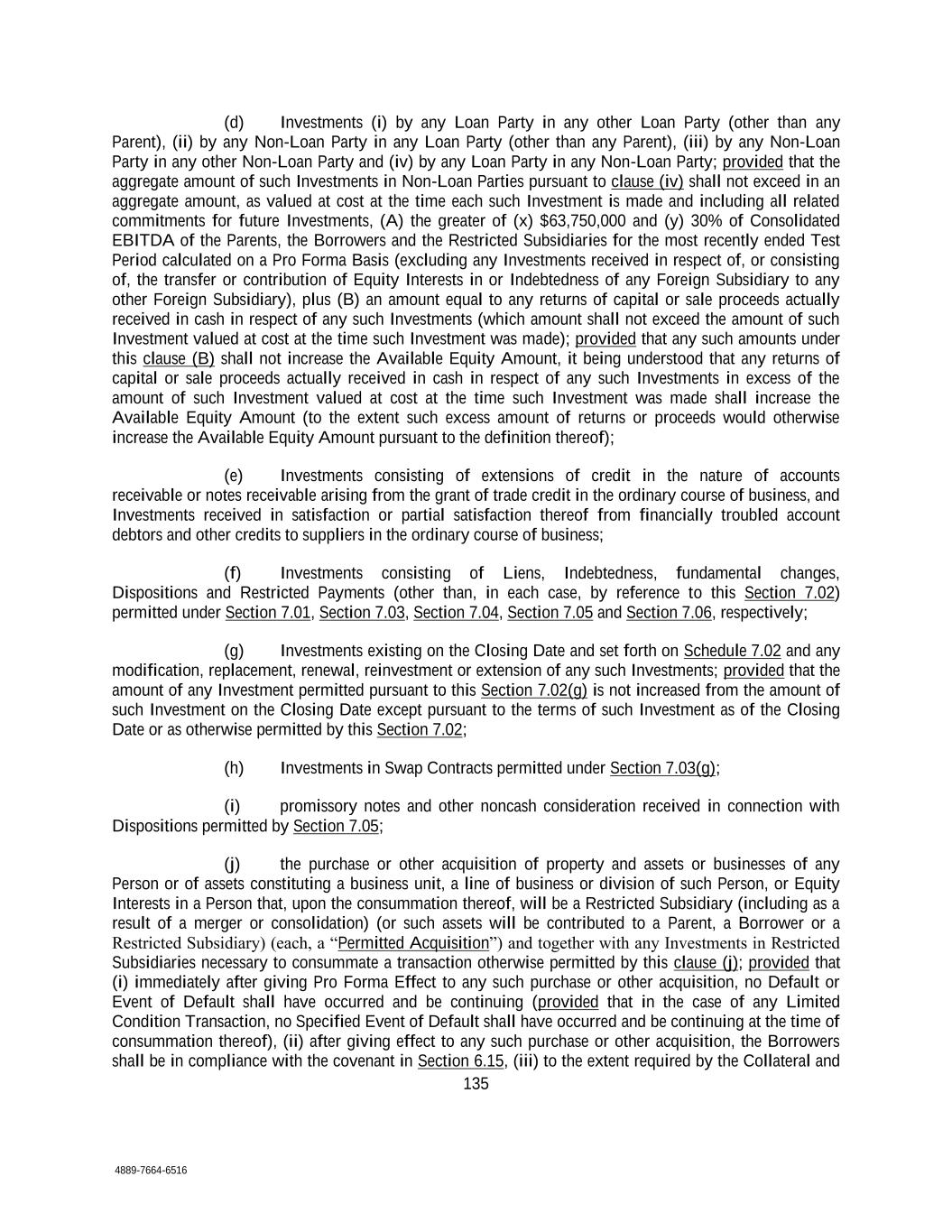 135 4889-7664-6516 (d) Investments (i) by any Loan Party in any other Loan Party (other than any Parent), (ii) by any Non-Loan Party in any Loan Party (other than any Parent), (iii) by any Non-Loan Party in any other Non-Loan Party and (iv) by any Loan Party in any Non-Loan Party; provided that the aggregate amount of such Investments in Non-Loan Parties pursuant to clause (iv) shall not exceed in an aggregate amount, as valued at cost at the time each such Investment is made and including all related commitments for future Investments, (A) the greater of (x) $63,750,000 and (y) 30% of Consolidated EBITDA of the Parents, the Borrowers and the Restricted Subsidiaries for the most recently ended Test Period calculated on a Pro Forma Basis (excluding any Investments received in respect of, or consisting of, the transfer or contribution of Equity Interests in or Indebtedness of any Foreign Subsidiary to any other Foreign Subsidiary), plus (B) an amount equal to any returns of capital or sale proceeds actually received in cash in respect of any such Investments (which amount shall not exceed the amount of such Investment valued at cost at the time such Investment was made); provided that any such amounts under this clause (B) shall not increase the Available Equity Amount, it being understood that any returns of capital or sale proceeds actually received in cash in respect of any such Investments in excess of the amount of such Investment valued at cost at the time such Investment was made shall increase the Available Equity Amount (to the extent such excess amount of returns or proceeds would otherwise increase the Available Equity Amount pursuant to the definition thereof); (e) Investments consisting of extensions of credit in the nature of accounts receivable or notes receivable arising from the grant of trade credit in the ordinary course of business, and Investments received in satisfaction or partial satisfaction thereof from financially troubled account debtors and other credits to suppliers in the ordinary course of business; (f) Investments consisting of Liens, Indebtedness, fundamental changes, Dispositions and Restricted Payments (other than, in each case, by reference to this Section 7.02) permitted under Section 7.01, Section 7.03, Section 7.04, Section 7.05 and Section 7.06, respectively; (g) Investments existing on the Closing Date and set forth on Schedule 7.02 and any modification, replacement, renewal, reinvestment or extension of any such Investments; provided that the amount of any Investment permitted pursuant to this Section 7.02(g) is not increased from the amount of such Investment on the Closing Date except pursuant to the terms of such Investment as of the Closing Date or as otherwise permitted by this Section 7.02; (h) Investments in Swap Contracts permitted under Section 7.03(g); (i) promissory notes and other noncash consideration received in connection with Dispositions permitted by Section 7.05; (j) the purchase or other acquisition of property and assets or businesses of any Person or of assets constituting a business unit, a line of business or division of such Person, or Equity Interests in a Person that, upon the consummation thereof, will be a Restricted Subsidiary (including as a result of a merger or consolidation) (or such assets will be contributed to a Parent, a Borrower or a Restricted Subsidiary) (each, a “Permitted Acquisition”) and together with any Investments in Restricted Subsidiaries necessary to consummate a transaction otherwise permitted by this clause (j); provided that (i) immediately after giving Pro Forma Effect to any such purchase or other acquisition, no Default or Event of Default shall have occurred and be continuing (provided that in the case of any Limited Condition Transaction, no Specified Event of Default shall have occurred and be continuing at the time of consummation thereof), (ii) after giving effect to any such purchase or other acquisition, the Borrowers shall be in compliance with the covenant in Section 6.15, (iii) to the extent required by the Collateral and