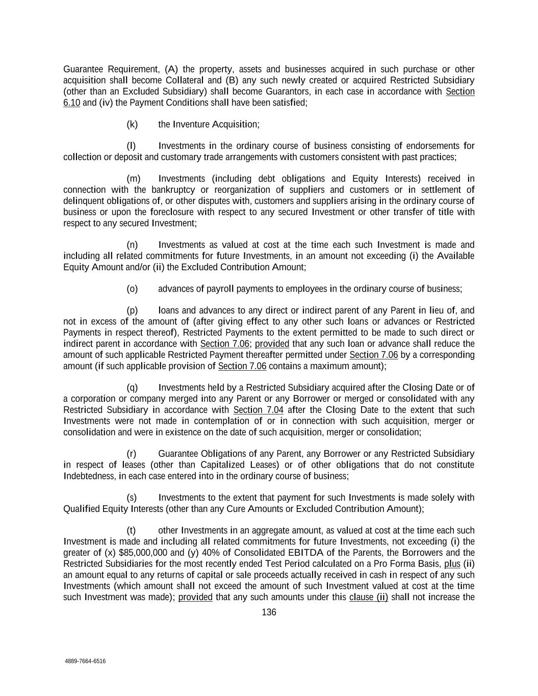 136 4889-7664-6516 Guarantee Requirement, (A) the property, assets and businesses acquired in such purchase or other acquisition shall become Collateral and (B) any such newly created or acquired Restricted Subsidiary (other than an Excluded Subsidiary) shall become Guarantors, in each case in accordance with Section 6.10 and (iv) the Payment Conditions shall have been satisfied; (k) the Inventure Acquisition; (l) Investments in the ordinary course of business consisting of endorsements for collection or deposit and customary trade arrangements with customers consistent with past practices; (m) Investments (including debt obligations and Equity Interests) received in connection with the bankruptcy or reorganization of suppliers and customers or in settlement of delinquent obligations of, or other disputes with, customers and suppliers arising in the ordinary course of business or upon the foreclosure with respect to any secured Investment or other transfer of title with respect to any secured Investment; (n) Investments as valued at cost at the time each such Investment is made and including all related commitments for future Investments, in an amount not exceeding (i) the Available Equity Amount and/or (ii) the Excluded Contribution Amount; (o) advances of payroll payments to employees in the ordinary course of business; (p) loans and advances to any direct or indirect parent of any Parent in lieu of, and not in excess of the amount of (after giving effect to any other such loans or advances or Restricted Payments in respect thereof), Restricted Payments to the extent permitted to be made to such direct or indirect parent in accordance with Section 7.06; provided that any such loan or advance shall reduce the amount of such applicable Restricted Payment thereafter permitted under Section 7.06 by a corresponding amount (if such applicable provision of Section 7.06 contains a maximum amount); (q) Investments held by a Restricted Subsidiary acquired after the Closing Date or of a corporation or company merged into any Parent or any Borrower or merged or consolidated with any Restricted Subsidiary in accordance with Section 7.04 after the Closing Date to the extent that such Investments were not made in contemplation of or in connection with such acquisition, merger or consolidation and were in existence on the date of such acquisition, merger or consolidation; (r) Guarantee Obligations of any Parent, any Borrower or any Restricted Subsidiary in respect of leases (other than Capitalized Leases) or of other obligations that do not constitute Indebtedness, in each case entered into in the ordinary course of business; (s) Investments to the extent that payment for such Investments is made solely with Qualified Equity Interests (other than any Cure Amounts or Excluded Contribution Amount); (t) other Investments in an aggregate amount, as valued at cost at the time each such Investment is made and including all related commitments for future Investments, not exceeding (i) the greater of (x) $85,000,000 and (y) 40% of Consolidated EBITDA of the Parents, the Borrowers and the Restricted Subsidiaries for the most recently ended Test Period calculated on a Pro Forma Basis, plus (ii) an amount equal to any returns of capital or sale proceeds actually received in cash in respect of any such Investments (which amount shall not exceed the amount of such Investment valued at cost at the time such Investment was made); provided that any such amounts under this clause (ii) shall not increase the