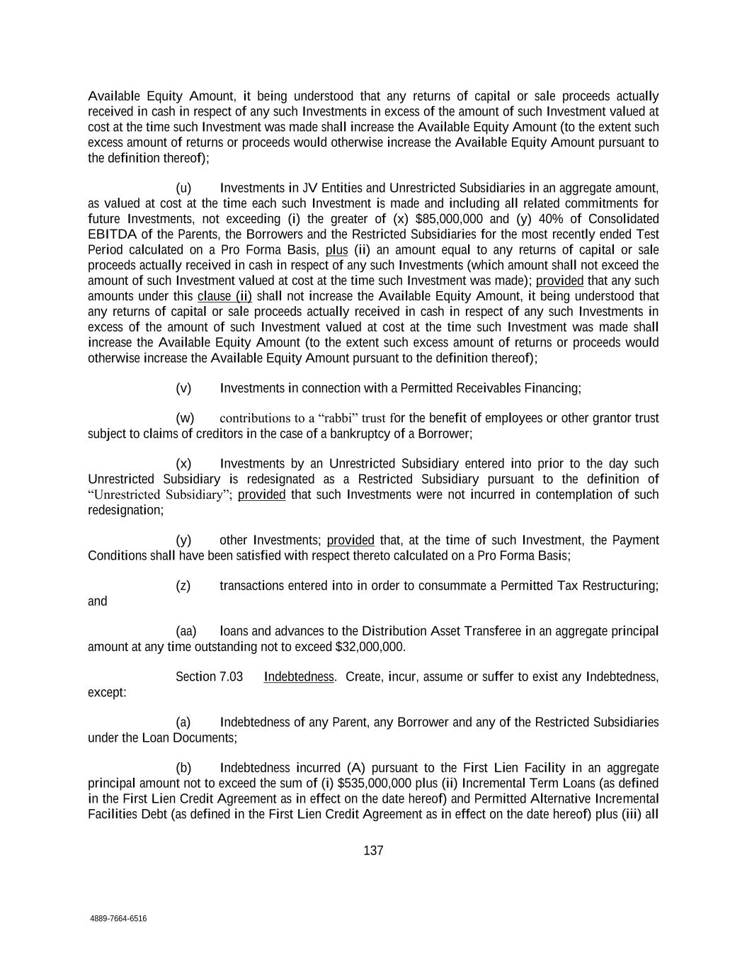 137 4889-7664-6516 Available Equity Amount, it being understood that any returns of capital or sale proceeds actually received in cash in respect of any such Investments in excess of the amount of such Investment valued at cost at the time such Investment was made shall increase the Available Equity Amount (to the extent such excess amount of returns or proceeds would otherwise increase the Available Equity Amount pursuant to the definition thereof); (u) Investments in JV Entities and Unrestricted Subsidiaries in an aggregate amount, as valued at cost at the time each such Investment is made and including all related commitments for future Investments, not exceeding (i) the greater of (x) $85,000,000 and (y) 40% of Consolidated EBITDA of the Parents, the Borrowers and the Restricted Subsidiaries for the most recently ended Test Period calculated on a Pro Forma Basis, plus (ii) an amount equal to any returns of capital or sale proceeds actually received in cash in respect of any such Investments (which amount shall not exceed the amount of such Investment valued at cost at the time such Investment was made); provided that any such amounts under this clause (ii) shall not increase the Available Equity Amount, it being understood that any returns of capital or sale proceeds actually received in cash in respect of any such Investments in excess of the amount of such Investment valued at cost at the time such Investment was made shall increase the Available Equity Amount (to the extent such excess amount of returns or proceeds would otherwise increase the Available Equity Amount pursuant to the definition thereof); (v) Investments in connection with a Permitted Receivables Financing; (w) contributions to a “rabbi” trust for the benefit of employees or other grantor trust subject to claims of creditors in the case of a bankruptcy of a Borrower; (x) Investments by an Unrestricted Subsidiary entered into prior to the day such Unrestricted Subsidiary is redesignated as a Restricted Subsidiary pursuant to the definition of “Unrestricted Subsidiary”; provided that such Investments were not incurred in contemplation of such redesignation; (y) other Investments; provided that, at the time of such Investment, the Payment Conditions shall have been satisfied with respect thereto calculated on a Pro Forma Basis; (z) transactions entered into in order to consummate a Permitted Tax Restructuring; and (aa) loans and advances to the Distribution Asset Transferee in an aggregate principal amount at any time outstanding not to exceed $32,000,000. Section 7.03 Indebtedness. Create, incur, assume or suffer to exist any Indebtedness, except: (a) Indebtedness of any Parent, any Borrower and any of the Restricted Subsidiaries under the Loan Documents; (b) Indebtedness incurred (A) pursuant to the First Lien Facility in an aggregate principal amount not to exceed the sum of (i) $535,000,000 plus (ii) Incremental Term Loans (as defined in the First Lien Credit Agreement as in effect on the date hereof) and Permitted Alternative Incremental Facilities Debt (as defined in the First Lien Credit Agreement as in effect on the date hereof) plus (iii) all