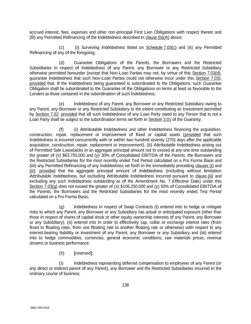 138 4889-7664-6516 accrued interest, fees, expenses and other non-principal First Lien Obligations with respect thereto and (B) any Permitted Refinancing of the Indebtedness described in clause (b)(A) above; (c) (i) Surviving Indebtedness listed on Schedule 7.03(c) and (ii) any Permitted Refinancing of any of the foregoing; (d) Guarantee Obligations of the Parents, the Borrowers and the Restricted Subsidiaries in respect of Indebtedness of any Parent, any Borrower or any Restricted Subsidiary otherwise permitted hereunder (except that Non-Loan Parties may not, by virtue of this Section 7.03(d), guarantee Indebtedness that such Non-Loan Parties could not otherwise incur under this Section 7.03); provided that, if the Indebtedness being guaranteed is subordinated to the Obligations, such Guarantee Obligation shall be subordinated to the Guarantee of the Obligations on terms at least as favorable to the Lenders as those contained in the subordination of such Indebtedness; (e) Indebtedness of any Parent, any Borrower or any Restricted Subsidiary owing to any Parent, any Borrower or any Restricted Subsidiary to the extent constituting an Investment permitted by Section 7.02; provided that all such Indebtedness of any Loan Party owed to any Person that is not a Loan Party shall be subject to the subordination terms set forth in Section 3.01 of the Guaranty; (f) (i) Attributable Indebtedness and other Indebtedness financing the acquisition, construction, repair, replacement or improvement of fixed or capital assets (provided that such Indebtedness is incurred concurrently with or within two hundred seventy (270) days after the applicable acquisition, construction, repair, replacement or improvement), (ii) Attributable Indebtedness arising out of Permitted Sale Leasebacks in an aggregate principal amount not to exceed at any one time outstanding the greater of (x) $63,750,000 and (y) 30% of Consolidated EBITDA of the Parents, the Borrowers and the Restricted Subsidiaries for the most recently ended Test Period calculated on a Pro Forma Basis and (iii) any Permitted Refinancing of any Indebtedness set forth in the immediately preceding clauses (i) and (ii); provided that the aggregate principal amount of Indebtedness (including without limitation Attributable Indebtedness, but excluding Attributable Indebtedness incurred pursuant to clause (ii) and excluding any such Indebtedness outstanding as of the Amendment No. 7 Effective Date) under this Section 7.03(g) does not exceed the greater of (x) $106,250,000 and (y) 50% of Consolidated EBITDA of the Parents, the Borrowers and the Restricted Subsidiaries for the most recently ended Test Period calculated on a Pro Forma Basis; (g) Indebtedness in respect of Swap Contracts (i) entered into to hedge or mitigate risks to which any Parent, any Borrower or any Subsidiary has actual or anticipated exposure (other than those in respect of shares of capital stock or other equity ownership interests of any Parent, any Borrower or any Subsidiary), (ii) entered into in order to effectively cap, collar or exchange interest rates (from fixed to floating rates, from one floating rate to another floating rate or otherwise) with respect to any interest-bearing liability or investment of any Parent, any Borrower or any Subsidiary and (iii) entered into to hedge commodities, currencies, general economic conditions, raw materials prices, revenue streams or business performance; (h) [reserved]; (i) Indebtedness representing deferred compensation to employees of any Parent (or any direct or indirect parent of any Parent), any Borrower and the Restricted Subsidiaries incurred in the ordinary course of business;
