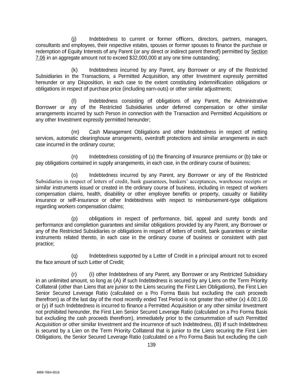 139 4889-7664-6516 (j) Indebtedness to current or former officers, directors, partners, managers, consultants and employees, their respective estates, spouses or former spouses to finance the purchase or redemption of Equity Interests of any Parent (or any direct or indirect parent thereof) permitted by Section 7.06 in an aggregate amount not to exceed $32,000,000 at any one time outstanding; (k) Indebtedness incurred by any Parent, any Borrower or any of the Restricted Subsidiaries in the Transactions, a Permitted Acquisition, any other Investment expressly permitted hereunder or any Disposition, in each case to the extent constituting indemnification obligations or obligations in respect of purchase price (including earn-outs) or other similar adjustments; (l) Indebtedness consisting of obligations of any Parent, the Administrative Borrower or any of the Restricted Subsidiaries under deferred compensation or other similar arrangements incurred by such Person in connection with the Transaction and Permitted Acquisitions or any other Investment expressly permitted hereunder; (m) Cash Management Obligations and other Indebtedness in respect of netting services, automatic clearinghouse arrangements, overdraft protections and similar arrangements in each case incurred in the ordinary course; (n) Indebtedness consisting of (a) the financing of insurance premiums or (b) take or pay obligations contained in supply arrangements, in each case, in the ordinary course of business; (o) Indebtedness incurred by any Parent, any Borrower or any of the Restricted Subsidiaries in respect of letters of credit, bank guarantees, bankers’ acceptances, warehouse receipts or similar instruments issued or created in the ordinary course of business, including in respect of workers compensation claims, health, disability or other employee benefits or property, casualty or liability insurance or self-insurance or other Indebtedness with respect to reimbursement-type obligations regarding workers compensation claims; (p) obligations in respect of performance, bid, appeal and surety bonds and performance and completion guarantees and similar obligations provided by any Parent, any Borrower or any of the Restricted Subsidiaries or obligations in respect of letters of credit, bank guarantees or similar instruments related thereto, in each case in the ordinary course of business or consistent with past practice; (q) Indebtedness supported by a Letter of Credit in a principal amount not to exceed the face amount of such Letter of Credit; (r) (i) other Indebtedness of any Parent, any Borrower or any Restricted Subsidiary in an unlimited amount, so long as (A) if such Indebtedness is secured by any Liens on the Term Priority Collateral (other than Liens that are junior to the Liens securing the First Lien Obligations), the First Lien Senior Secured Leverage Ratio (calculated on a Pro Forma Basis but excluding the cash proceeds therefrom) as of the last day of the most recently ended Test Period is not greater than either (x) 4.00:1.00 or (y) if such Indebtedness is incurred to finance a Permitted Acquisition or any other similar Investment not prohibited hereunder, the First Lien Senior Secured Leverage Ratio (calculated on a Pro Forma Basis but excluding the cash proceeds therefrom), immediately prior to the consummation of such Permitted Acquisition or other similar Investment and the incurrence of such Indebtedness, (B) if such Indebtedness is secured by a Lien on the Term Priority Collateral that is junior to the Liens securing the First Lien Obligations, the Senior Secured Leverage Ratio (calculated on a Pro Forma Basis but excluding the cash
