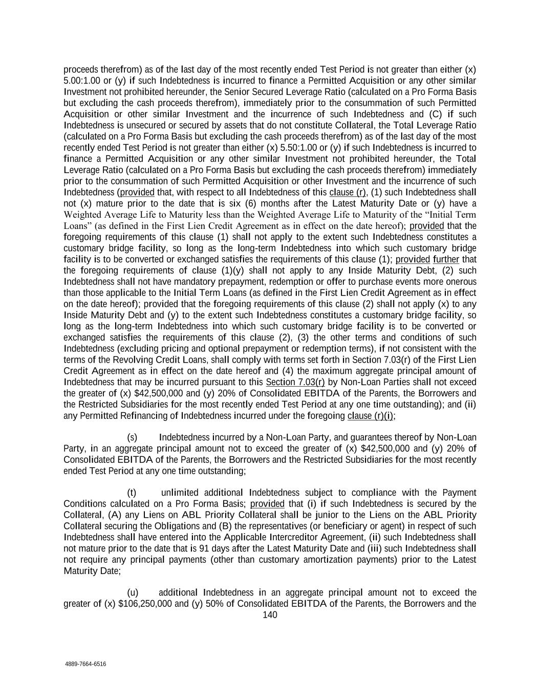 140 4889-7664-6516 proceeds therefrom) as of the last day of the most recently ended Test Period is not greater than either (x) 5.00:1.00 or (y) if such Indebtedness is incurred to finance a Permitted Acquisition or any other similar Investment not prohibited hereunder, the Senior Secured Leverage Ratio (calculated on a Pro Forma Basis but excluding the cash proceeds therefrom), immediately prior to the consummation of such Permitted Acquisition or other similar Investment and the incurrence of such Indebtedness and (C) if such Indebtedness is unsecured or secured by assets that do not constitute Collateral, the Total Leverage Ratio (calculated on a Pro Forma Basis but excluding the cash proceeds therefrom) as of the last day of the most recently ended Test Period is not greater than either (x) 5.50:1.00 or (y) if such Indebtedness is incurred to finance a Permitted Acquisition or any other similar Investment not prohibited hereunder, the Total Leverage Ratio (calculated on a Pro Forma Basis but excluding the cash proceeds therefrom) immediately prior to the consummation of such Permitted Acquisition or other Investment and the incurrence of such Indebtedness (provided that, with respect to all Indebtedness of this clause (r), (1) such Indebtedness shall not (x) mature prior to the date that is six (6) months after the Latest Maturity Date or (y) have a Weighted Average Life to Maturity less than the Weighted Average Life to Maturity of the “Initial Term Loans” (as defined in the First Lien Credit Agreement as in effect on the date hereof); provided that the foregoing requirements of this clause (1) shall not apply to the extent such Indebtedness constitutes a customary bridge facility, so long as the long-term Indebtedness into which such customary bridge facility is to be converted or exchanged satisfies the requirements of this clause (1); provided further that the foregoing requirements of clause (1)(y) shall not apply to any Inside Maturity Debt, (2) such Indebtedness shall not have mandatory prepayment, redemption or offer to purchase events more onerous than those applicable to the Initial Term Loans (as defined in the First Lien Credit Agreement as in effect on the date hereof); provided that the foregoing requirements of this clause (2) shall not apply (x) to any Inside Maturity Debt and (y) to the extent such Indebtedness constitutes a customary bridge facility, so long as the long-term Indebtedness into which such customary bridge facility is to be converted or exchanged satisfies the requirements of this clause (2), (3) the other terms and conditions of such Indebtedness (excluding pricing and optional prepayment or redemption terms), if not consistent with the terms of the Revolving Credit Loans, shall comply with terms set forth in Section 7.03(r) of the First Lien Credit Agreement as in effect on the date hereof and (4) the maximum aggregate principal amount of Indebtedness that may be incurred pursuant to this Section 7.03(r) by Non-Loan Parties shall not exceed the greater of (x) $42,500,000 and (y) 20% of Consolidated EBITDA of the Parents, the Borrowers and the Restricted Subsidiaries for the most recently ended Test Period at any one time outstanding); and (ii) any Permitted Refinancing of Indebtedness incurred under the foregoing clause (r)(i); (s) Indebtedness incurred by a Non-Loan Party, and guarantees thereof by Non-Loan Party, in an aggregate principal amount not to exceed the greater of (x) $42,500,000 and (y) 20% of Consolidated EBITDA of the Parents, the Borrowers and the Restricted Subsidiaries for the most recently ended Test Period at any one time outstanding; (t) unlimited additional Indebtedness subject to compliance with the Payment Conditions calculated on a Pro Forma Basis; provided that (i) if such Indebtedness is secured by the Collateral, (A) any Liens on ABL Priority Collateral shall be junior to the Liens on the ABL Priority Collateral securing the Obligations and (B) the representatives (or beneficiary or agent) in respect of such Indebtedness shall have entered into the Applicable Intercreditor Agreement, (ii) such Indebtedness shall not mature prior to the date that is 91 days after the Latest Maturity Date and (iii) such Indebtedness shall not require any principal payments (other than customary amortization payments) prior to the Latest Maturity Date; (u) additional Indebtedness in an aggregate principal amount not to exceed the greater of (x) $106,250,000 and (y) 50% of Consolidated EBITDA of the Parents, the Borrowers and the