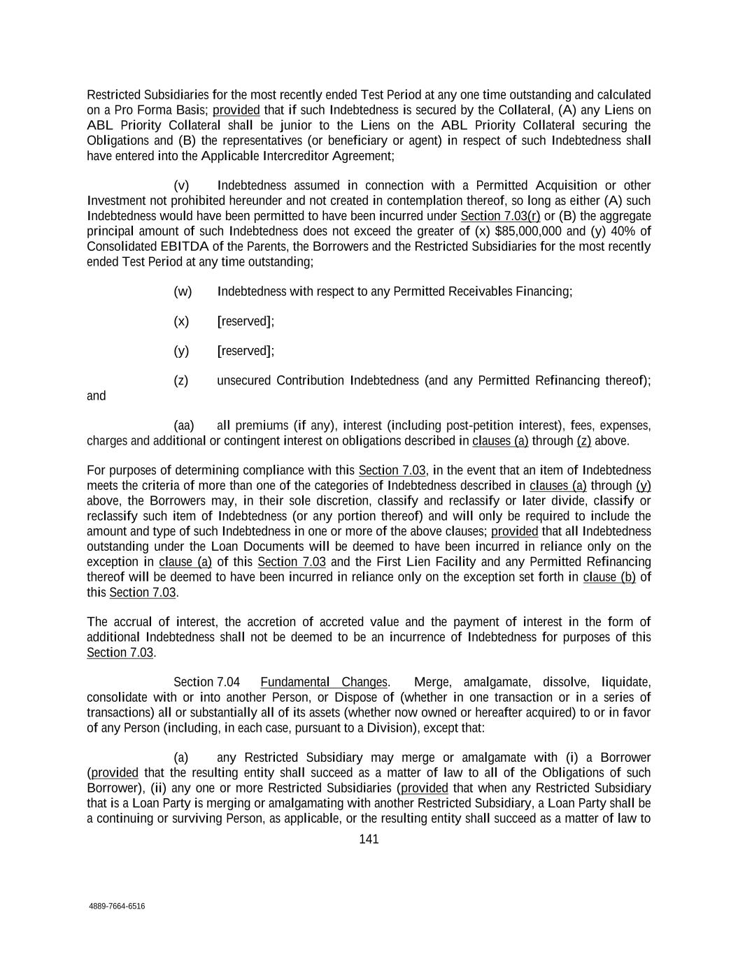 141 4889-7664-6516 Restricted Subsidiaries for the most recently ended Test Period at any one time outstanding and calculated on a Pro Forma Basis; provided that if such Indebtedness is secured by the Collateral, (A) any Liens on ABL Priority Collateral shall be junior to the Liens on the ABL Priority Collateral securing the Obligations and (B) the representatives (or beneficiary or agent) in respect of such Indebtedness shall have entered into the Applicable Intercreditor Agreement; (v) Indebtedness assumed in connection with a Permitted Acquisition or other Investment not prohibited hereunder and not created in contemplation thereof, so long as either (A) such Indebtedness would have been permitted to have been incurred under Section 7.03(r) or (B) the aggregate principal amount of such Indebtedness does not exceed the greater of (x) $85,000,000 and (y) 40% of Consolidated EBITDA of the Parents, the Borrowers and the Restricted Subsidiaries for the most recently ended Test Period at any time outstanding; (w) Indebtedness with respect to any Permitted Receivables Financing; (x) [reserved]; (y) [reserved]; (z) unsecured Contribution Indebtedness (and any Permitted Refinancing thereof); and (aa) all premiums (if any), interest (including post-petition interest), fees, expenses, charges and additional or contingent interest on obligations described in clauses (a) through (z) above. For purposes of determining compliance with this Section 7.03, in the event that an item of Indebtedness meets the criteria of more than one of the categories of Indebtedness described in clauses (a) through (y) above, the Borrowers may, in their sole discretion, classify and reclassify or later divide, classify or reclassify such item of Indebtedness (or any portion thereof) and will only be required to include the amount and type of such Indebtedness in one or more of the above clauses; provided that all Indebtedness outstanding under the Loan Documents will be deemed to have been incurred in reliance only on the exception in clause (a) of this Section 7.03 and the First Lien Facility and any Permitted Refinancing thereof will be deemed to have been incurred in reliance only on the exception set forth in clause (b) of this Section 7.03. The accrual of interest, the accretion of accreted value and the payment of interest in the form of additional Indebtedness shall not be deemed to be an incurrence of Indebtedness for purposes of this Section 7.03. Section 7.04 Fundamental Changes. Merge, amalgamate, dissolve, liquidate, consolidate with or into another Person, or Dispose of (whether in one transaction or in a series of transactions) all or substantially all of its assets (whether now owned or hereafter acquired) to or in favor of any Person (including, in each case, pursuant to a Division), except that: (a) any Restricted Subsidiary may merge or amalgamate with (i) a Borrower (provided that the resulting entity shall succeed as a matter of law to all of the Obligations of such Borrower), (ii) any one or more Restricted Subsidiaries (provided that when any Restricted Subsidiary that is a Loan Party is merging or amalgamating with another Restricted Subsidiary, a Loan Party shall be a continuing or surviving Person, as applicable, or the resulting entity shall succeed as a matter of law to