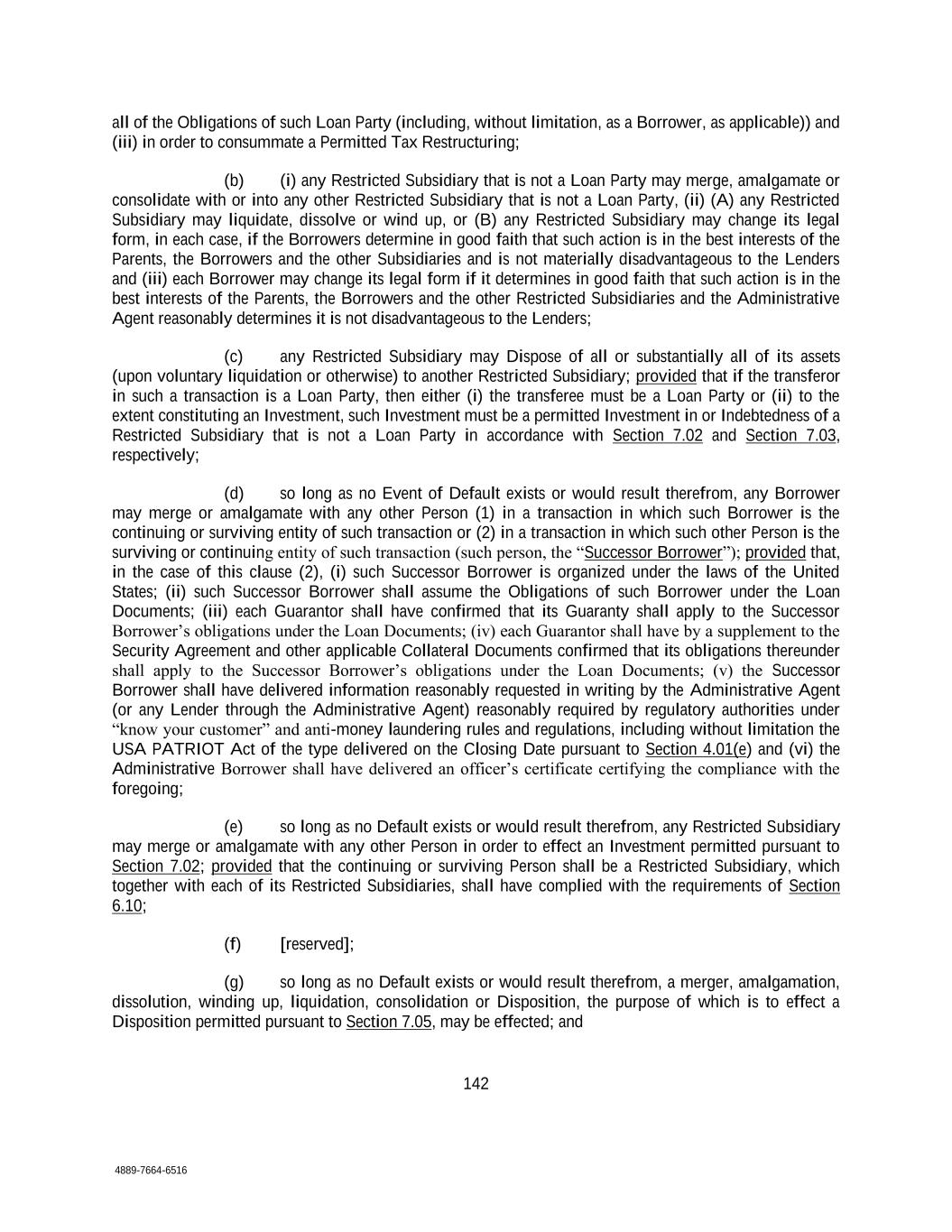 142 4889-7664-6516 all of the Obligations of such Loan Party (including, without limitation, as a Borrower, as applicable)) and (iii) in order to consummate a Permitted Tax Restructuring; (b) (i) any Restricted Subsidiary that is not a Loan Party may merge, amalgamate or consolidate with or into any other Restricted Subsidiary that is not a Loan Party, (ii) (A) any Restricted Subsidiary may liquidate, dissolve or wind up, or (B) any Restricted Subsidiary may change its legal form, in each case, if the Borrowers determine in good faith that such action is in the best interests of the Parents, the Borrowers and the other Subsidiaries and is not materially disadvantageous to the Lenders and (iii) each Borrower may change its legal form if it determines in good faith that such action is in the best interests of the Parents, the Borrowers and the other Restricted Subsidiaries and the Administrative Agent reasonably determines it is not disadvantageous to the Lenders; (c) any Restricted Subsidiary may Dispose of all or substantially all of its assets (upon voluntary liquidation or otherwise) to another Restricted Subsidiary; provided that if the transferor in such a transaction is a Loan Party, then either (i) the transferee must be a Loan Party or (ii) to the extent constituting an Investment, such Investment must be a permitted Investment in or Indebtedness of a Restricted Subsidiary that is not a Loan Party in accordance with Section 7.02 and Section 7.03, respectively; (d) so long as no Event of Default exists or would result therefrom, any Borrower may merge or amalgamate with any other Person (1) in a transaction in which such Borrower is the continuing or surviving entity of such transaction or (2) in a transaction in which such other Person is the surviving or continuing entity of such transaction (such person, the “Successor Borrower”); provided that, in the case of this clause (2), (i) such Successor Borrower is organized under the laws of the United States; (ii) such Successor Borrower shall assume the Obligations of such Borrower under the Loan Documents; (iii) each Guarantor shall have confirmed that its Guaranty shall apply to the Successor Borrower’s obligations under the Loan Documents; (iv) each Guarantor shall have by a supplement to the Security Agreement and other applicable Collateral Documents confirmed that its obligations thereunder shall apply to the Successor Borrower’s obligations under the Loan Documents; (v) the Successor Borrower shall have delivered information reasonably requested in writing by the Administrative Agent (or any Lender through the Administrative Agent) reasonably required by regulatory authorities under “know your customer” and anti-money laundering rules and regulations, including without limitation the USA PATRIOT Act of the type delivered on the Closing Date pursuant to Section 4.01(e) and (vi) the Administrative Borrower shall have delivered an officer’s certificate certifying the compliance with the foregoing; (e) so long as no Default exists or would result therefrom, any Restricted Subsidiary may merge or amalgamate with any other Person in order to effect an Investment permitted pursuant to Section 7.02; provided that the continuing or surviving Person shall be a Restricted Subsidiary, which together with each of its Restricted Subsidiaries, shall have complied with the requirements of Section 6.10; (f) [reserved]; (g) so long as no Default exists or would result therefrom, a merger, amalgamation, dissolution, winding up, liquidation, consolidation or Disposition, the purpose of which is to effect a Disposition permitted pursuant to Section 7.05, may be effected; and