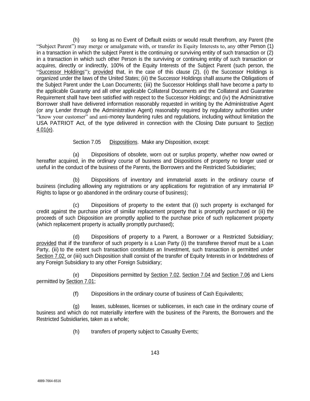 143 4889-7664-6516 (h) so long as no Event of Default exists or would result therefrom, any Parent (the “Subject Parent”) may merge or amalgamate with, or transfer its Equity Interests to, any other Person (1) in a transaction in which the subject Parent is the continuing or surviving entity of such transaction or (2) in a transaction in which such other Person is the surviving or continuing entity of such transaction or acquires, directly or indirectly, 100% of the Equity Interests of the Subject Parent (such person, the “Successor Holdings”); provided that, in the case of this clause (2), (i) the Successor Holdings is organized under the laws of the United States; (ii) the Successor Holdings shall assume the Obligations of the Subject Parent under the Loan Documents; (iii) the Successor Holdings shall have become a party to the applicable Guaranty and all other applicable Collateral Documents and the Collateral and Guarantee Requirement shall have been satisfied with respect to the Successor Holdings; and (iv) the Administrative Borrower shall have delivered information reasonably requested in writing by the Administrative Agent (or any Lender through the Administrative Agent) reasonably required by regulatory authorities under “know your customer” and anti-money laundering rules and regulations, including without limitation the USA PATRIOT Act, of the type delivered in connection with the Closing Date pursuant to Section 4.01(e). Section 7.05 Dispositions. Make any Disposition, except: (a) Dispositions of obsolete, worn out or surplus property, whether now owned or hereafter acquired, in the ordinary course of business and Dispositions of property no longer used or useful in the conduct of the business of the Parents, the Borrowers and the Restricted Subsidiaries; (b) Dispositions of inventory and immaterial assets in the ordinary course of business (including allowing any registrations or any applications for registration of any immaterial IP Rights to lapse or go abandoned in the ordinary course of business); (c) Dispositions of property to the extent that (i) such property is exchanged for credit against the purchase price of similar replacement property that is promptly purchased or (ii) the proceeds of such Disposition are promptly applied to the purchase price of such replacement property (which replacement property is actually promptly purchased); (d) Dispositions of property to a Parent, a Borrower or a Restricted Subsidiary; provided that if the transferor of such property is a Loan Party (i) the transferee thereof must be a Loan Party, (ii) to the extent such transaction constitutes an Investment, such transaction is permitted under Section 7.02, or (iii) such Disposition shall consist of the transfer of Equity Interests in or Indebtedness of any Foreign Subsidiary to any other Foreign Subsidiary; (e) Dispositions permitted by Section 7.02, Section 7.04 and Section 7.06 and Liens permitted by Section 7.01; (f) Dispositions in the ordinary course of business of Cash Equivalents; (g) leases, subleases, licenses or sublicenses, in each case in the ordinary course of business and which do not materially interfere with the business of the Parents, the Borrowers and the Restricted Subsidiaries, taken as a whole; (h) transfers of property subject to Casualty Events;