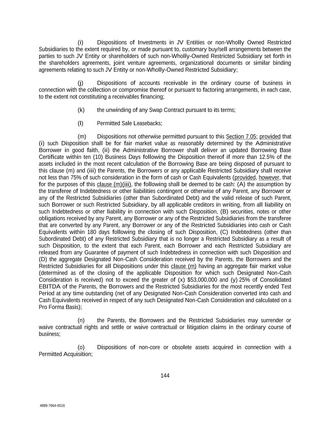 144 4889-7664-6516 (i) Dispositions of Investments in JV Entities or non-Wholly Owned Restricted Subsidiaries to the extent required by, or made pursuant to, customary buy/sell arrangements between the parties to such JV Entity or shareholders of such non-Wholly-Owned Restricted Subsidiary set forth in the shareholders agreements, joint venture agreements, organizational documents or similar binding agreements relating to such JV Entity or non-Wholly-Owned Restricted Subsidiary; (j) Dispositions of accounts receivable in the ordinary course of business in connection with the collection or compromise thereof or pursuant to factoring arrangements, in each case, to the extent not constituting a receivables financing; (k) the unwinding of any Swap Contract pursuant to its terms; (l) Permitted Sale Leasebacks; (m) Dispositions not otherwise permitted pursuant to this Section 7.05; provided that (i) such Disposition shall be for fair market value as reasonably determined by the Administrative Borrower in good faith, (ii) the Administrative Borrower shall deliver an updated Borrowing Base Certificate within ten (10) Business Days following the Disposition thereof if more than 12.5% of the assets included in the most recent calculation of the Borrowing Base are being disposed of pursuant to this clause (m) and (iii) the Parents, the Borrowers or any applicable Restricted Subsidiary shall receive not less than 75% of such consideration in the form of cash or Cash Equivalents (provided, however, that for the purposes of this clause (m)(iii), the following shall be deemed to be cash: (A) the assumption by the transferee of Indebtedness or other liabilities contingent or otherwise of any Parent, any Borrower or any of the Restricted Subsidiaries (other than Subordinated Debt) and the valid release of such Parent, such Borrower or such Restricted Subsidiary, by all applicable creditors in writing, from all liability on such Indebtedness or other liability in connection with such Disposition, (B) securities, notes or other obligations received by any Parent, any Borrower or any of the Restricted Subsidiaries from the transferee that are converted by any Parent, any Borrower or any of the Restricted Subsidiaries into cash or Cash Equivalents within 180 days following the closing of such Disposition, (C) Indebtedness (other than Subordinated Debt) of any Restricted Subsidiary that is no longer a Restricted Subsidiary as a result of such Disposition, to the extent that each Parent, each Borrower and each Restricted Subsidiary are released from any Guarantee of payment of such Indebtedness in connection with such Disposition and (D) the aggregate Designated Non-Cash Consideration received by the Parents, the Borrowers and the Restricted Subsidiaries for all Dispositions under this clause (m) having an aggregate fair market value (determined as of the closing of the applicable Disposition for which such Designated Non-Cash Consideration is received) not to exceed the greater of (x) $53,000,000 and (y) 25% of Consolidated EBITDA of the Parents, the Borrowers and the Restricted Subsidiaries for the most recently ended Test Period at any time outstanding (net of any Designated Non-Cash Consideration converted into cash and Cash Equivalents received in respect of any such Designated Non-Cash Consideration and calculated on a Pro Forma Basis); (n) the Parents, the Borrowers and the Restricted Subsidiaries may surrender or waive contractual rights and settle or waive contractual or litigation claims in the ordinary course of business; (o) Dispositions of non-core or obsolete assets acquired in connection with a Permitted Acquisition;