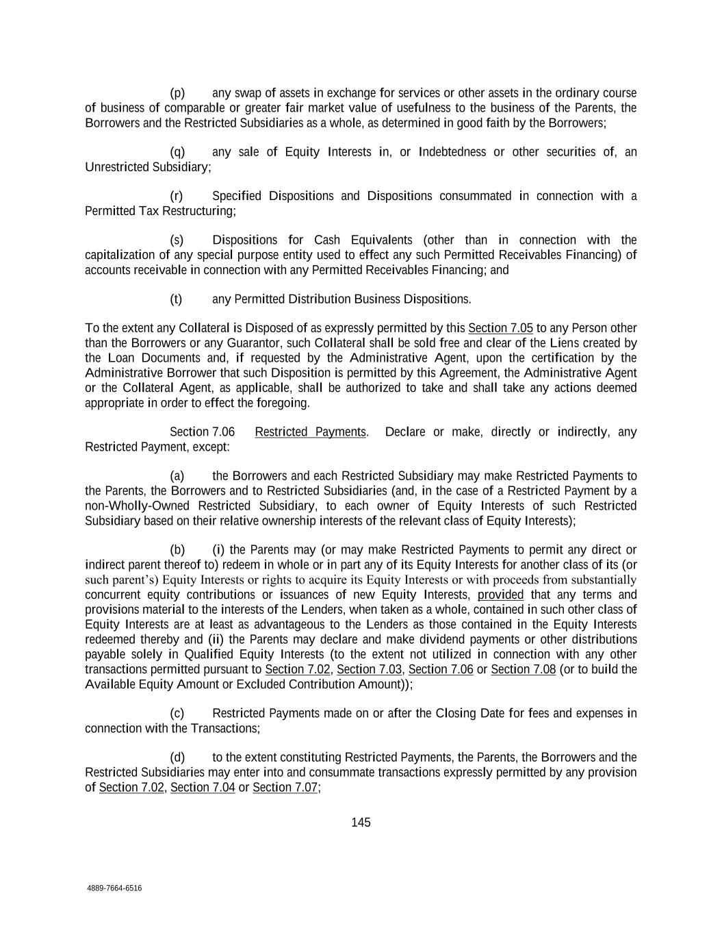 145 4889-7664-6516 (p) any swap of assets in exchange for services or other assets in the ordinary course of business of comparable or greater fair market value of usefulness to the business of the Parents, the Borrowers and the Restricted Subsidiaries as a whole, as determined in good faith by the Borrowers; (q) any sale of Equity Interests in, or Indebtedness or other securities of, an Unrestricted Subsidiary; (r) Specified Dispositions and Dispositions consummated in connection with a Permitted Tax Restructuring; (s) Dispositions for Cash Equivalents (other than in connection with the capitalization of any special purpose entity used to effect any such Permitted Receivables Financing) of accounts receivable in connection with any Permitted Receivables Financing; and (t) any Permitted Distribution Business Dispositions. To the extent any Collateral is Disposed of as expressly permitted by this Section 7.05 to any Person other than the Borrowers or any Guarantor, such Collateral shall be sold free and clear of the Liens created by the Loan Documents and, if requested by the Administrative Agent, upon the certification by the Administrative Borrower that such Disposition is permitted by this Agreement, the Administrative Agent or the Collateral Agent, as applicable, shall be authorized to take and shall take any actions deemed appropriate in order to effect the foregoing. Section 7.06 Restricted Payments. Declare or make, directly or indirectly, any Restricted Payment, except: (a) the Borrowers and each Restricted Subsidiary may make Restricted Payments to the Parents, the Borrowers and to Restricted Subsidiaries (and, in the case of a Restricted Payment by a non-Wholly-Owned Restricted Subsidiary, to each owner of Equity Interests of such Restricted Subsidiary based on their relative ownership interests of the relevant class of Equity Interests); (b) (i) the Parents may (or may make Restricted Payments to permit any direct or indirect parent thereof to) redeem in whole or in part any of its Equity Interests for another class of its (or such parent’s) Equity Interests or rights to acquire its Equity Interests or with proceeds from substantially concurrent equity contributions or issuances of new Equity Interests, provided that any terms and provisions material to the interests of the Lenders, when taken as a whole, contained in such other class of Equity Interests are at least as advantageous to the Lenders as those contained in the Equity Interests redeemed thereby and (ii) the Parents may declare and make dividend payments or other distributions payable solely in Qualified Equity Interests (to the extent not utilized in connection with any other transactions permitted pursuant to Section 7.02, Section 7.03, Section 7.06 or Section 7.08 (or to build the Available Equity Amount or Excluded Contribution Amount)); (c) Restricted Payments made on or after the Closing Date for fees and expenses in connection with the Transactions; (d) to the extent constituting Restricted Payments, the Parents, the Borrowers and the Restricted Subsidiaries may enter into and consummate transactions expressly permitted by any provision of Section 7.02, Section 7.04 or Section 7.07;