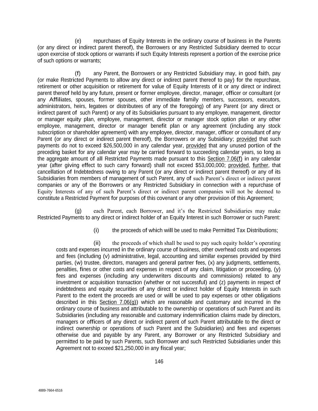 146 4889-7664-6516 (e) repurchases of Equity Interests in the ordinary course of business in the Parents (or any direct or indirect parent thereof), the Borrowers or any Restricted Subsidiary deemed to occur upon exercise of stock options or warrants if such Equity Interests represent a portion of the exercise price of such options or warrants; (f) any Parent, the Borrowers or any Restricted Subsidiary may, in good faith, pay (or make Restricted Payments to allow any direct or indirect parent thereof to pay) for the repurchase, retirement or other acquisition or retirement for value of Equity Interests of it or any direct or indirect parent thereof held by any future, present or former employee, director, manager, officer or consultant (or any Affiliates, spouses, former spouses, other immediate family members, successors, executors, administrators, heirs, legatees or distributees of any of the foregoing) of any Parent (or any direct or indirect parent of such Parent) or any of its Subsidiaries pursuant to any employee, management, director or manager equity plan, employee, management, director or manager stock option plan or any other employee, management, director or manager benefit plan or any agreement (including any stock subscription or shareholder agreement) with any employee, director, manager, officer or consultant of any Parent (or any direct or indirect parent thereof), the Borrowers or any Subsidiary; provided that such payments do not to exceed $26,500,000 in any calendar year, provided that any unused portion of the preceding basket for any calendar year may be carried forward to succeeding calendar years, so long as the aggregate amount of all Restricted Payments made pursuant to this Section 7.06(f) in any calendar year (after giving effect to such carry forward) shall not exceed $53,000,000; provided, further, that cancellation of Indebtedness owing to any Parent (or any direct or indirect parent thereof) or any of its Subsidiaries from members of management of such Parent, any of such Parent’s direct or indirect parent companies or any of the Borrowers or any Restricted Subsidiary in connection with a repurchase of Equity Interests of any of such Parent’s direct or indirect parent companies will not be deemed to constitute a Restricted Payment for purposes of this covenant or any other provision of this Agreement; (g) each Parent, each Borrower, and it’s the Restricted Subsidiaries may make Restricted Payments to any direct or indirect holder of an Equity Interest in such Borrower or such Parent: (i) the proceeds of which will be used to make Permitted Tax Distributions; (ii) the proceeds of which shall be used to pay such equity holder’s operating costs and expenses incurred in the ordinary course of business, other overhead costs and expenses and fees (including (v) administrative, legal, accounting and similar expenses provided by third parties, (w) trustee, directors, managers and general partner fees, (x) any judgments, settlements, penalties, fines or other costs and expenses in respect of any claim, litigation or proceeding, (y) fees and expenses (including any underwriters discounts and commissions) related to any investment or acquisition transaction (whether or not successful) and (z) payments in respect of indebtedness and equity securities of any direct or indirect holder of Equity Interests in such Parent to the extent the proceeds are used or will be used to pay expenses or other obligations described in this Section 7.06(g)) which are reasonable and customary and incurred in the ordinary course of business and attributable to the ownership or operations of such Parent and its Subsidiaries (including any reasonable and customary indemnification claims made by directors, managers or officers of any direct or indirect parent of such Parent attributable to the direct or indirect ownership or operations of such Parent and the Subsidiaries) and fees and expenses otherwise due and payable by any Parent, any Borrower or any Restricted Subsidiary and permitted to be paid by such Parents, such Borrower and such Restricted Subsidiaries under this Agreement not to exceed $21,250,000 in any fiscal year;