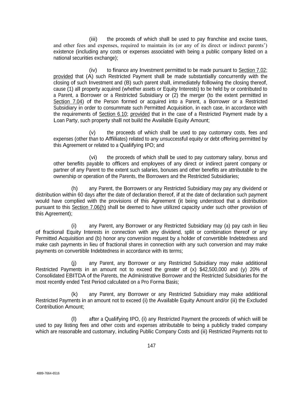 147 4889-7664-6516 (iii) the proceeds of which shall be used to pay franchise and excise taxes, and other fees and expenses, required to maintain its (or any of its direct or indirect parents’) existence (including any costs or expenses associated with being a public company listed on a national securities exchange); (iv) to finance any Investment permitted to be made pursuant to Section 7.02; provided that (A) such Restricted Payment shall be made substantially concurrently with the closing of such Investment and (B) such parent shall, immediately following the closing thereof, cause (1) all property acquired (whether assets or Equity Interests) to be held by or contributed to a Parent, a Borrower or a Restricted Subsidiary or (2) the merger (to the extent permitted in Section 7.04) of the Person formed or acquired into a Parent, a Borrower or a Restricted Subsidiary in order to consummate such Permitted Acquisition, in each case, in accordance with the requirements of Section 6.10; provided that in the case of a Restricted Payment made by a Loan Party, such property shall not build the Available Equity Amount; (v) the proceeds of which shall be used to pay customary costs, fees and expenses (other than to Affiliates) related to any unsuccessful equity or debt offering permitted by this Agreement or related to a Qualifying IPO; and (vi) the proceeds of which shall be used to pay customary salary, bonus and other benefits payable to officers and employees of any direct or indirect parent company or partner of any Parent to the extent such salaries, bonuses and other benefits are attributable to the ownership or operation of the Parents, the Borrowers and the Restricted Subsidiaries; (h) any Parent, the Borrowers or any Restricted Subsidiary may pay any dividend or distribution within 60 days after the date of declaration thereof, if at the date of declaration such payment would have complied with the provisions of this Agreement (it being understood that a distribution pursuant to this Section 7.06(h) shall be deemed to have utilized capacity under such other provision of this Agreement); (i) any Parent, any Borrower or any Restricted Subsidiary may (a) pay cash in lieu of fractional Equity Interests in connection with any dividend, split or combination thereof or any Permitted Acquisition and (b) honor any conversion request by a holder of convertible Indebtedness and make cash payments in lieu of fractional shares in connection with any such conversion and may make payments on convertible Indebtedness in accordance with its terms; (j) any Parent, any Borrower or any Restricted Subsidiary may make additional Restricted Payments in an amount not to exceed the greater of (x) $42,500,000 and (y) 20% of Consolidated EBITDA of the Parents, the Administrative Borrower and the Restricted Subsidiaries for the most recently ended Test Period calculated on a Pro Forma Basis; (k) any Parent, any Borrower or any Restricted Subsidiary may make additional Restricted Payments in an amount not to exceed (i) the Available Equity Amount and/or (ii) the Excluded Contribution Amount; (l) after a Qualifying IPO, (i) any Restricted Payment the proceeds of which will be used to pay listing fees and other costs and expenses attributable to being a publicly traded company which are reasonable and customary, including Public Company Costs and (ii) Restricted Payments not to