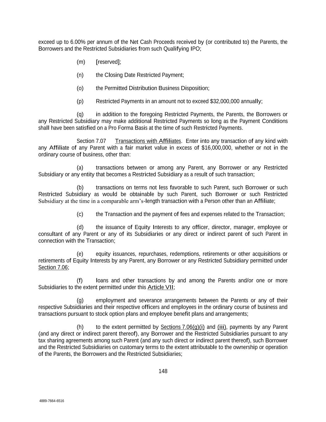 148 4889-7664-6516 exceed up to 6.00% per annum of the Net Cash Proceeds received by (or contributed to) the Parents, the Borrowers and the Restricted Subsidiaries from such Qualifying IPO; (m) [reserved]; (n) the Closing Date Restricted Payment; (o) the Permitted Distribution Business Disposition; (p) Restricted Payments in an amount not to exceed $32,000,000 annually; (q) in addition to the foregoing Restricted Payments, the Parents, the Borrowers or any Restricted Subsidiary may make additional Restricted Payments so long as the Payment Conditions shall have been satisfied on a Pro Forma Basis at the time of such Restricted Payments. Section 7.07 Transactions with Affiliates. Enter into any transaction of any kind with any Affiliate of any Parent with a fair market value in excess of $16,000,000, whether or not in the ordinary course of business, other than: (a) transactions between or among any Parent, any Borrower or any Restricted Subsidiary or any entity that becomes a Restricted Subsidiary as a result of such transaction; (b) transactions on terms not less favorable to such Parent, such Borrower or such Restricted Subsidiary as would be obtainable by such Parent, such Borrower or such Restricted Subsidiary at the time in a comparable arm’s-length transaction with a Person other than an Affiliate; (c) the Transaction and the payment of fees and expenses related to the Transaction; (d) the issuance of Equity Interests to any officer, director, manager, employee or consultant of any Parent or any of its Subsidiaries or any direct or indirect parent of such Parent in connection with the Transaction; (e) equity issuances, repurchases, redemptions, retirements or other acquisitions or retirements of Equity Interests by any Parent, any Borrower or any Restricted Subsidiary permitted under Section 7.06; (f) loans and other transactions by and among the Parents and/or one or more Subsidiaries to the extent permitted under this Article VII; (g) employment and severance arrangements between the Parents or any of their respective Subsidiaries and their respective officers and employees in the ordinary course of business and transactions pursuant to stock option plans and employee benefit plans and arrangements; (h) to the extent permitted by Sections 7.06(g)(i) and (iii), payments by any Parent (and any direct or indirect parent thereof), any Borrower and the Restricted Subsidiaries pursuant to any tax sharing agreements among such Parent (and any such direct or indirect parent thereof), such Borrower and the Restricted Subsidiaries on customary terms to the extent attributable to the ownership or operation of the Parents, the Borrowers and the Restricted Subsidiaries;