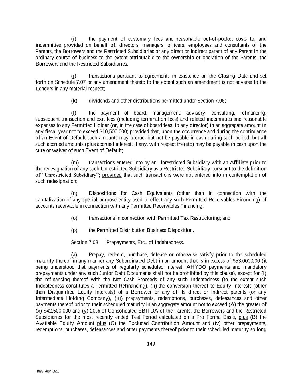 149 4889-7664-6516 (i) the payment of customary fees and reasonable out-of-pocket costs to, and indemnities provided on behalf of, directors, managers, officers, employees and consultants of the Parents, the Borrowers and the Restricted Subsidiaries or any direct or indirect parent of any Parent in the ordinary course of business to the extent attributable to the ownership or operation of the Parents, the Borrowers and the Restricted Subsidiaries; (j) transactions pursuant to agreements in existence on the Closing Date and set forth on Schedule 7.07 or any amendment thereto to the extent such an amendment is not adverse to the Lenders in any material respect; (k) dividends and other distributions permitted under Section 7.06; (l) the payment of board, management, advisory, consulting, refinancing, subsequent transaction and exit fees (including termination fees) and related indemnities and reasonable expenses to any Permitted Holder (or, in the case of board fees, to any director) in an aggregate amount in any fiscal year not to exceed $10,500,000; provided that, upon the occurrence and during the continuance of an Event of Default such amounts may accrue, but not be payable in cash during such period, but all such accrued amounts (plus accrued interest, if any, with respect thereto) may be payable in cash upon the cure or waiver of such Event of Default; (m) transactions entered into by an Unrestricted Subsidiary with an Affiliate prior to the redesignation of any such Unrestricted Subsidiary as a Restricted Subsidiary pursuant to the definition of “Unrestricted Subsidiary”; provided that such transactions were not entered into in contemplation of such redesignation; (n) Dispositions for Cash Equivalents (other than in connection with the capitalization of any special purpose entity used to effect any such Permitted Receivables Financing) of accounts receivable in connection with any Permitted Receivables Financing; (o) transactions in connection with Permitted Tax Restructuring; and (p) the Permitted Distribution Business Disposition. Section 7.08 Prepayments, Etc., of Indebtedness. (a) Prepay, redeem, purchase, defease or otherwise satisfy prior to the scheduled maturity thereof in any manner any Subordinated Debt in an amount that is in excess of $53,000,000 (it being understood that payments of regularly scheduled interest, AHYDO payments and mandatory prepayments under any such Junior Debt Documents shall not be prohibited by this clause), except for (i) the refinancing thereof with the Net Cash Proceeds of any such Indebtedness (to the extent such Indebtedness constitutes a Permitted Refinancing), (ii) the conversion thereof to Equity Interests (other than Disqualified Equity Interests) of a Borrower or any of its direct or indirect parents (or any Intermediate Holding Company), (iii) prepayments, redemptions, purchases, defeasances and other payments thereof prior to their scheduled maturity in an aggregate amount not to exceed (A) the greater of (x) $42,500,000 and (y) 20% of Consolidated EBITDA of the Parents, the Borrowers and the Restricted Subsidiaries for the most recently ended Test Period calculated on a Pro Forma Basis, plus (B) the Available Equity Amount plus (C) the Excluded Contribution Amount and (iv) other prepayments, redemptions, purchases, defeasances and other payments thereof prior to their scheduled maturity so long