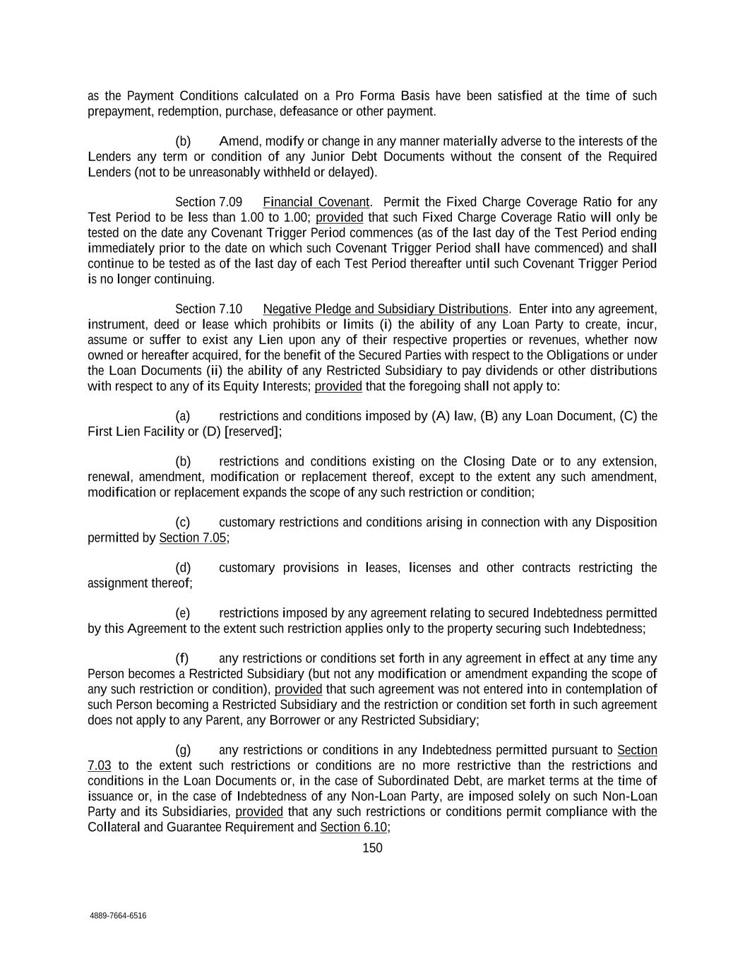 150 4889-7664-6516 as the Payment Conditions calculated on a Pro Forma Basis have been satisfied at the time of such prepayment, redemption, purchase, defeasance or other payment. (b) Amend, modify or change in any manner materially adverse to the interests of the Lenders any term or condition of any Junior Debt Documents without the consent of the Required Lenders (not to be unreasonably withheld or delayed). Section 7.09 Financial Covenant. Permit the Fixed Charge Coverage Ratio for any Test Period to be less than 1.00 to 1.00; provided that such Fixed Charge Coverage Ratio will only be tested on the date any Covenant Trigger Period commences (as of the last day of the Test Period ending immediately prior to the date on which such Covenant Trigger Period shall have commenced) and shall continue to be tested as of the last day of each Test Period thereafter until such Covenant Trigger Period is no longer continuing. Section 7.10 Negative Pledge and Subsidiary Distributions. Enter into any agreement, instrument, deed or lease which prohibits or limits (i) the ability of any Loan Party to create, incur, assume or suffer to exist any Lien upon any of their respective properties or revenues, whether now owned or hereafter acquired, for the benefit of the Secured Parties with respect to the Obligations or under the Loan Documents (ii) the ability of any Restricted Subsidiary to pay dividends or other distributions with respect to any of its Equity Interests; provided that the foregoing shall not apply to: (a) restrictions and conditions imposed by (A) law, (B) any Loan Document, (C) the First Lien Facility or (D) [reserved]; (b) restrictions and conditions existing on the Closing Date or to any extension, renewal, amendment, modification or replacement thereof, except to the extent any such amendment, modification or replacement expands the scope of any such restriction or condition; (c) customary restrictions and conditions arising in connection with any Disposition permitted by Section 7.05; (d) customary provisions in leases, licenses and other contracts restricting the assignment thereof; (e) restrictions imposed by any agreement relating to secured Indebtedness permitted by this Agreement to the extent such restriction applies only to the property securing such Indebtedness; (f) any restrictions or conditions set forth in any agreement in effect at any time any Person becomes a Restricted Subsidiary (but not any modification or amendment expanding the scope of any such restriction or condition), provided that such agreement was not entered into in contemplation of such Person becoming a Restricted Subsidiary and the restriction or condition set forth in such agreement does not apply to any Parent, any Borrower or any Restricted Subsidiary; (g) any restrictions or conditions in any Indebtedness permitted pursuant to Section 7.03 to the extent such restrictions or conditions are no more restrictive than the restrictions and conditions in the Loan Documents or, in the case of Subordinated Debt, are market terms at the time of issuance or, in the case of Indebtedness of any Non-Loan Party, are imposed solely on such Non-Loan Party and its Subsidiaries, provided that any such restrictions or conditions permit compliance with the Collateral and Guarantee Requirement and Section 6.10;