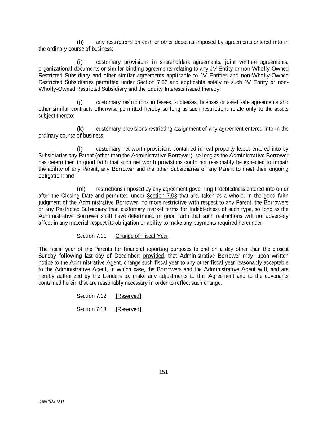 151 4889-7664-6516 (h) any restrictions on cash or other deposits imposed by agreements entered into in the ordinary course of business; (i) customary provisions in shareholders agreements, joint venture agreements, organizational documents or similar binding agreements relating to any JV Entity or non-Wholly-Owned Restricted Subsidiary and other similar agreements applicable to JV Entities and non-Wholly-Owned Restricted Subsidiaries permitted under Section 7.02 and applicable solely to such JV Entity or non- Wholly-Owned Restricted Subsidiary and the Equity Interests issued thereby; (j) customary restrictions in leases, subleases, licenses or asset sale agreements and other similar contracts otherwise permitted hereby so long as such restrictions relate only to the assets subject thereto; (k) customary provisions restricting assignment of any agreement entered into in the ordinary course of business; (l) customary net worth provisions contained in real property leases entered into by Subsidiaries any Parent (other than the Administrative Borrower), so long as the Administrative Borrower has determined in good faith that such net worth provisions could not reasonably be expected to impair the ability of any Parent, any Borrower and the other Subsidiaries of any Parent to meet their ongoing obligation; and (m) restrictions imposed by any agreement governing Indebtedness entered into on or after the Closing Date and permitted under Section 7.03 that are, taken as a whole, in the good faith judgment of the Administrative Borrower, no more restrictive with respect to any Parent, the Borrowers or any Restricted Subsidiary than customary market terms for Indebtedness of such type, so long as the Administrative Borrower shall have determined in good faith that such restrictions will not adversely affect in any material respect its obligation or ability to make any payments required hereunder. Section 7.11 Change of Fiscal Year. The fiscal year of the Parents for financial reporting purposes to end on a day other than the closest Sunday following last day of December; provided, that Administrative Borrower may, upon written notice to the Administrative Agent, change such fiscal year to any other fiscal year reasonably acceptable to the Administrative Agent, in which case, the Borrowers and the Administrative Agent will, and are hereby authorized by the Lenders to, make any adjustments to this Agreement and to the covenants contained herein that are reasonably necessary in order to reflect such change. Section 7.12 [Reserved]. Section 7.13 [Reserved].