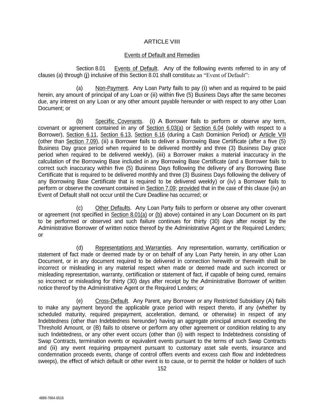 152 4889-7664-6516 ARTICLE VIII Events of Default and Remedies Section 8.01 Events of Default. Any of the following events referred to in any of clauses (a) through (j) inclusive of this Section 8.01 shall constitute an “Event of Default”: (a) Non-Payment. Any Loan Party fails to pay (i) when and as required to be paid herein, any amount of principal of any Loan or (ii) within five (5) Business Days after the same becomes due, any interest on any Loan or any other amount payable hereunder or with respect to any other Loan Document; or (b) Specific Covenants. (i) A Borrower fails to perform or observe any term, covenant or agreement contained in any of Section 6.03(a) or Section 6.04 (solely with respect to a Borrower), Section 6.11, Section 6.13, Section 6.16 (during a Cash Dominion Period) or Article VII (other than Section 7.09), (ii) a Borrower fails to deliver a Borrowing Base Certificate (after a five (5) Business Day grace period when required to be delivered monthly and three (3) Business Day grace period when required to be delivered weekly), (iii) a Borrower makes a material inaccuracy in the calculation of the Borrowing Base included in any Borrowing Base Certificate (and a Borrower fails to correct such inaccuracy within five (5) Business Days following the delivery of any Borrowing Base Certificate that is required to be delivered monthly and three (3) Business Days following the delivery of any Borrowing Base Certificate that is required to be delivered weekly) or (iv) a Borrower fails to perform or observe the covenant contained in Section 7.09; provided that in the case of this clause (iv) an Event of Default shall not occur until the Cure Deadline has occurred; or (c) Other Defaults. Any Loan Party fails to perform or observe any other covenant or agreement (not specified in Section 8.01(a) or (b) above) contained in any Loan Document on its part to be performed or observed and such failure continues for thirty (30) days after receipt by the Administrative Borrower of written notice thereof by the Administrative Agent or the Required Lenders; or (d) Representations and Warranties. Any representation, warranty, certification or statement of fact made or deemed made by or on behalf of any Loan Party herein, in any other Loan Document, or in any document required to be delivered in connection herewith or therewith shall be incorrect or misleading in any material respect when made or deemed made and such incorrect or misleading representation, warranty, certification or statement of fact, if capable of being cured, remains so incorrect or misleading for thirty (30) days after receipt by the Administrative Borrower of written notice thereof by the Administrative Agent or the Required Lenders; or (e) Cross-Default. Any Parent, any Borrower or any Restricted Subsidiary (A) fails to make any payment beyond the applicable grace period with respect thereto, if any (whether by scheduled maturity, required prepayment, acceleration, demand, or otherwise) in respect of any Indebtedness (other than Indebtedness hereunder) having an aggregate principal amount exceeding the Threshold Amount, or (B) fails to observe or perform any other agreement or condition relating to any such Indebtedness, or any other event occurs (other than (i) with respect to Indebtedness consisting of Swap Contracts, termination events or equivalent events pursuant to the terms of such Swap Contracts and (ii) any event requiring prepayment pursuant to customary asset sale events, insurance and condemnation proceeds events, change of control offers events and excess cash flow and indebtedness sweeps), the effect of which default or other event is to cause, or to permit the holder or holders of such