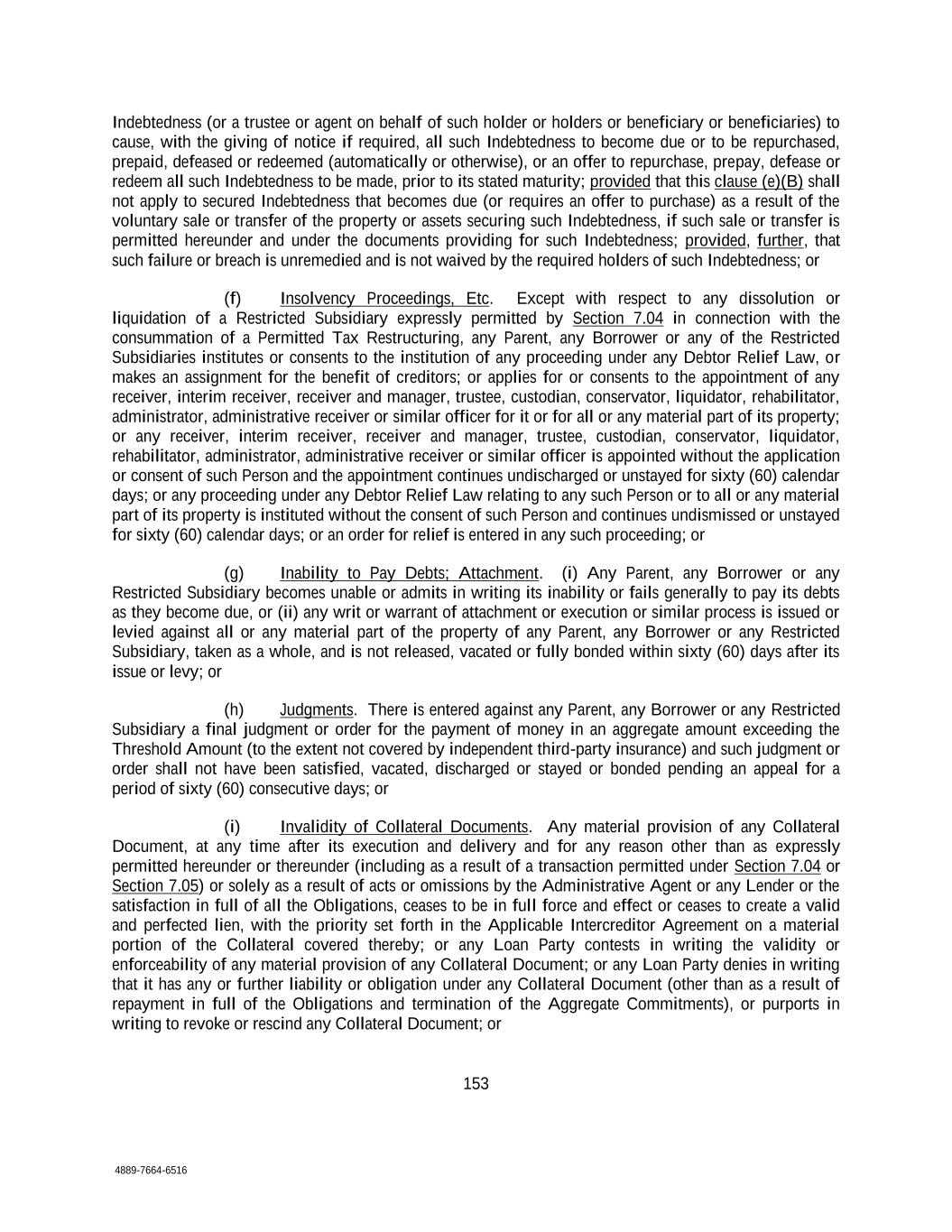 153 4889-7664-6516 Indebtedness (or a trustee or agent on behalf of such holder or holders or beneficiary or beneficiaries) to cause, with the giving of notice if required, all such Indebtedness to become due or to be repurchased, prepaid, defeased or redeemed (automatically or otherwise), or an offer to repurchase, prepay, defease or redeem all such Indebtedness to be made, prior to its stated maturity; provided that this clause (e)(B) shall not apply to secured Indebtedness that becomes due (or requires an offer to purchase) as a result of the voluntary sale or transfer of the property or assets securing such Indebtedness, if such sale or transfer is permitted hereunder and under the documents providing for such Indebtedness; provided, further, that such failure or breach is unremedied and is not waived by the required holders of such Indebtedness; or (f) Insolvency Proceedings, Etc. Except with respect to any dissolution or liquidation of a Restricted Subsidiary expressly permitted by Section 7.04 in connection with the consummation of a Permitted Tax Restructuring, any Parent, any Borrower or any of the Restricted Subsidiaries institutes or consents to the institution of any proceeding under any Debtor Relief Law, or makes an assignment for the benefit of creditors; or applies for or consents to the appointment of any receiver, interim receiver, receiver and manager, trustee, custodian, conservator, liquidator, rehabilitator, administrator, administrative receiver or similar officer for it or for all or any material part of its property; or any receiver, interim receiver, receiver and manager, trustee, custodian, conservator, liquidator, rehabilitator, administrator, administrative receiver or similar officer is appointed without the application or consent of such Person and the appointment continues undischarged or unstayed for sixty (60) calendar days; or any proceeding under any Debtor Relief Law relating to any such Person or to all or any material part of its property is instituted without the consent of such Person and continues undismissed or unstayed for sixty (60) calendar days; or an order for relief is entered in any such proceeding; or (g) Inability to Pay Debts; Attachment. (i) Any Parent, any Borrower or any Restricted Subsidiary becomes unable or admits in writing its inability or fails generally to pay its debts as they become due, or (ii) any writ or warrant of attachment or execution or similar process is issued or levied against all or any material part of the property of any Parent, any Borrower or any Restricted Subsidiary, taken as a whole, and is not released, vacated or fully bonded within sixty (60) days after its issue or levy; or (h) Judgments. There is entered against any Parent, any Borrower or any Restricted Subsidiary a final judgment or order for the payment of money in an aggregate amount exceeding the Threshold Amount (to the extent not covered by independent third-party insurance) and such judgment or order shall not have been satisfied, vacated, discharged or stayed or bonded pending an appeal for a period of sixty (60) consecutive days; or (i) Invalidity of Collateral Documents. Any material provision of any Collateral Document, at any time after its execution and delivery and for any reason other than as expressly permitted hereunder or thereunder (including as a result of a transaction permitted under Section 7.04 or Section 7.05) or solely as a result of acts or omissions by the Administrative Agent or any Lender or the satisfaction in full of all the Obligations, ceases to be in full force and effect or ceases to create a valid and perfected lien, with the priority set forth in the Applicable Intercreditor Agreement on a material portion of the Collateral covered thereby; or any Loan Party contests in writing the validity or enforceability of any material provision of any Collateral Document; or any Loan Party denies in writing that it has any or further liability or obligation under any Collateral Document (other than as a result of repayment in full of the Obligations and termination of the Aggregate Commitments), or purports in writing to revoke or rescind any Collateral Document; or