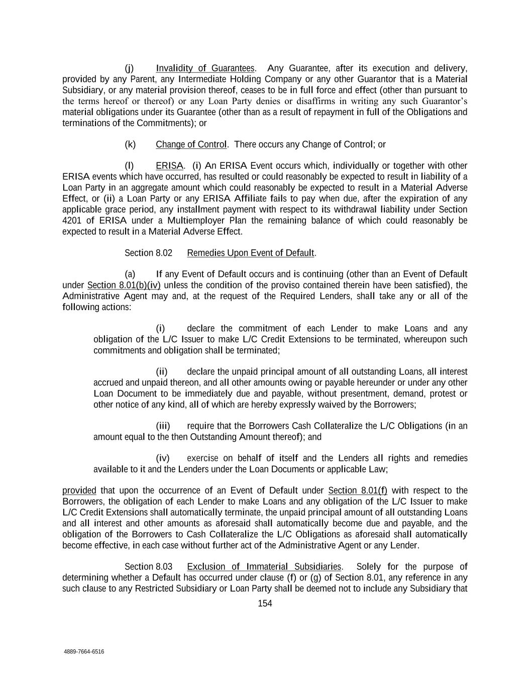 154 4889-7664-6516 (j) Invalidity of Guarantees. Any Guarantee, after its execution and delivery, provided by any Parent, any Intermediate Holding Company or any other Guarantor that is a Material Subsidiary, or any material provision thereof, ceases to be in full force and effect (other than pursuant to the terms hereof or thereof) or any Loan Party denies or disaffirms in writing any such Guarantor’s material obligations under its Guarantee (other than as a result of repayment in full of the Obligations and terminations of the Commitments); or (k) Change of Control. There occurs any Change of Control; or (l) ERISA. (i) An ERISA Event occurs which, individually or together with other ERISA events which have occurred, has resulted or could reasonably be expected to result in liability of a Loan Party in an aggregate amount which could reasonably be expected to result in a Material Adverse Effect, or (ii) a Loan Party or any ERISA Affiliate fails to pay when due, after the expiration of any applicable grace period, any installment payment with respect to its withdrawal liability under Section 4201 of ERISA under a Multiemployer Plan the remaining balance of which could reasonably be expected to result in a Material Adverse Effect. Section 8.02 Remedies Upon Event of Default. (a) If any Event of Default occurs and is continuing (other than an Event of Default under Section 8.01(b)(iv) unless the condition of the proviso contained therein have been satisfied), the Administrative Agent may and, at the request of the Required Lenders, shall take any or all of the following actions: (i) declare the commitment of each Lender to make Loans and any obligation of the L/C Issuer to make L/C Credit Extensions to be terminated, whereupon such commitments and obligation shall be terminated; (ii) declare the unpaid principal amount of all outstanding Loans, all interest accrued and unpaid thereon, and all other amounts owing or payable hereunder or under any other Loan Document to be immediately due and payable, without presentment, demand, protest or other notice of any kind, all of which are hereby expressly waived by the Borrowers; (iii) require that the Borrowers Cash Collateralize the L/C Obligations (in an amount equal to the then Outstanding Amount thereof); and (iv) exercise on behalf of itself and the Lenders all rights and remedies available to it and the Lenders under the Loan Documents or applicable Law; provided that upon the occurrence of an Event of Default under Section 8.01(f) with respect to the Borrowers, the obligation of each Lender to make Loans and any obligation of the L/C Issuer to make L/C Credit Extensions shall automatically terminate, the unpaid principal amount of all outstanding Loans and all interest and other amounts as aforesaid shall automatically become due and payable, and the obligation of the Borrowers to Cash Collateralize the L/C Obligations as aforesaid shall automatically become effective, in each case without further act of the Administrative Agent or any Lender. Section 8.03 Exclusion of Immaterial Subsidiaries. Solely for the purpose of determining whether a Default has occurred under clause (f) or (g) of Section 8.01, any reference in any such clause to any Restricted Subsidiary or Loan Party shall be deemed not to include any Subsidiary that