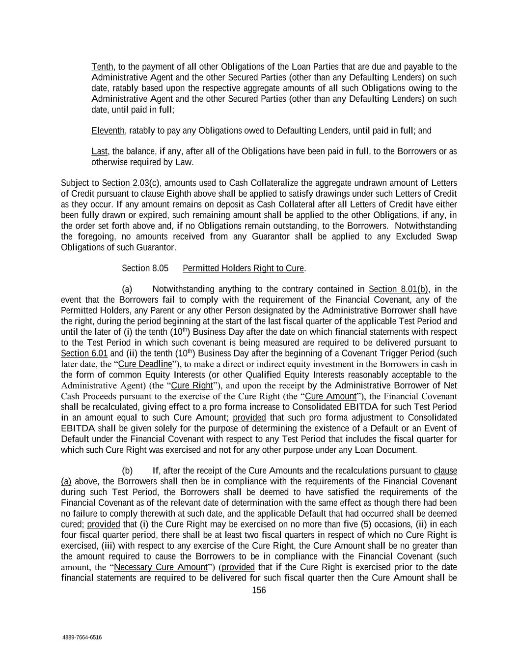 156 4889-7664-6516 Tenth, to the payment of all other Obligations of the Loan Parties that are due and payable to the Administrative Agent and the other Secured Parties (other than any Defaulting Lenders) on such date, ratably based upon the respective aggregate amounts of all such Obligations owing to the Administrative Agent and the other Secured Parties (other than any Defaulting Lenders) on such date, until paid in full; Eleventh, ratably to pay any Obligations owed to Defaulting Lenders, until paid in full; and Last, the balance, if any, after all of the Obligations have been paid in full, to the Borrowers or as otherwise required by Law. Subject to Section 2.03(c), amounts used to Cash Collateralize the aggregate undrawn amount of Letters of Credit pursuant to clause Eighth above shall be applied to satisfy drawings under such Letters of Credit as they occur. If any amount remains on deposit as Cash Collateral after all Letters of Credit have either been fully drawn or expired, such remaining amount shall be applied to the other Obligations, if any, in the order set forth above and, if no Obligations remain outstanding, to the Borrowers. Notwithstanding the foregoing, no amounts received from any Guarantor shall be applied to any Excluded Swap Obligations of such Guarantor. Section 8.05 Permitted Holders Right to Cure. (a) Notwithstanding anything to the contrary contained in Section 8.01(b), in the event that the Borrowers fail to comply with the requirement of the Financial Covenant, any of the Permitted Holders, any Parent or any other Person designated by the Administrative Borrower shall have the right, during the period beginning at the start of the last fiscal quarter of the applicable Test Period and until the later of (i) the tenth (10th) Business Day after the date on which financial statements with respect to the Test Period in which such covenant is being measured are required to be delivered pursuant to Section 6.01 and (ii) the tenth (10th) Business Day after the beginning of a Covenant Trigger Period (such later date, the “Cure Deadline”), to make a direct or indirect equity investment in the Borrowers in cash in the form of common Equity Interests (or other Qualified Equity Interests reasonably acceptable to the Administrative Agent) (the “Cure Right”), and upon the receipt by the Administrative Borrower of Net Cash Proceeds pursuant to the exercise of the Cure Right (the “Cure Amount”), the Financial Covenant shall be recalculated, giving effect to a pro forma increase to Consolidated EBITDA for such Test Period in an amount equal to such Cure Amount; provided that such pro forma adjustment to Consolidated EBITDA shall be given solely for the purpose of determining the existence of a Default or an Event of Default under the Financial Covenant with respect to any Test Period that includes the fiscal quarter for which such Cure Right was exercised and not for any other purpose under any Loan Document. (b) If, after the receipt of the Cure Amounts and the recalculations pursuant to clause (a) above, the Borrowers shall then be in compliance with the requirements of the Financial Covenant during such Test Period, the Borrowers shall be deemed to have satisfied the requirements of the Financial Covenant as of the relevant date of determination with the same effect as though there had been no failure to comply therewith at such date, and the applicable Default that had occurred shall be deemed cured; provided that (i) the Cure Right may be exercised on no more than five (5) occasions, (ii) in each four fiscal quarter period, there shall be at least two fiscal quarters in respect of which no Cure Right is exercised, (iii) with respect to any exercise of the Cure Right, the Cure Amount shall be no greater than the amount required to cause the Borrowers to be in compliance with the Financial Covenant (such amount, the “Necessary Cure Amount”) (provided that if the Cure Right is exercised prior to the date financial statements are required to be delivered for such fiscal quarter then the Cure Amount shall be