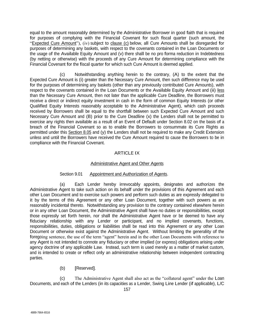 157 4889-7664-6516 equal to the amount reasonably determined by the Administrative Borrower in good faith that is required for purposes of complying with the Financial Covenant for such fiscal quarter (such amount, the “Expected Cure Amount”), (iv) subject to clause (c) below, all Cure Amounts shall be disregarded for purposes of determining any baskets, with respect to the covenants contained in the Loan Documents or the usage of the Available Equity Amount and (v) there shall be no pro forma reduction in Indebtedness (by netting or otherwise) with the proceeds of any Cure Amount for determining compliance with the Financial Covenant for the fiscal quarter for which such Cure Amount is deemed applied. (c) Notwithstanding anything herein to the contrary, (A) to the extent that the Expected Cure Amount is (i) greater than the Necessary Cure Amount, then such difference may be used for the purposes of determining any baskets (other than any previously contributed Cure Amounts), with respect to the covenants contained in the Loan Documents or the Available Equity Amount and (ii) less than the Necessary Cure Amount, then not later than the applicable Cure Deadline, the Borrowers must receive a direct or indirect equity investment in cash in the form of common Equity Interests (or other Qualified Equity Interests reasonably acceptable to the Administrative Agent), which cash proceeds received by Borrowers shall be equal to the shortfall between such Expected Cure Amount and such Necessary Cure Amount and (B) prior to the Cure Deadline (x) the Lenders shall not be permitted to exercise any rights then available as a result of an Event of Default under Section 8.02 on the basis of a breach of the Financial Covenant so as to enable the Borrowers to consummate its Cure Rights as permitted under this Section 8.05 and (y) the Lenders shall not be required to make any Credit Extension unless and until the Borrowers have received the Cure Amount required to cause the Borrowers to be in compliance with the Financial Covenant. ARTICLE IX Administrative Agent and Other Agents Section 9.01 Appointment and Authorization of Agents. (a) Each Lender hereby irrevocably appoints, designates and authorizes the Administrative Agent to take such action on its behalf under the provisions of this Agreement and each other Loan Document and to exercise such powers and perform such duties as are expressly delegated to it by the terms of this Agreement or any other Loan Document, together with such powers as are reasonably incidental thereto. Notwithstanding any provision to the contrary contained elsewhere herein or in any other Loan Document, the Administrative Agent shall have no duties or responsibilities, except those expressly set forth herein, nor shall the Administrative Agent have or be deemed to have any fiduciary relationship with any Lender or participant, and no implied covenants, functions, responsibilities, duties, obligations or liabilities shall be read into this Agreement or any other Loan Document or otherwise exist against the Administrative Agent. Without limiting the generality of the foregoing sentence, the use of the term “agent” herein and in the other Loan Documents with reference to any Agent is not intended to connote any fiduciary or other implied (or express) obligations arising under agency doctrine of any applicable Law. Instead, such term is used merely as a matter of market custom, and is intended to create or reflect only an administrative relationship between independent contracting parties. (b) [Reserved]. (c) The Administrative Agent shall also act as the “collateral agent” under the Loan Documents, and each of the Lenders (in its capacities as a Lender, Swing Line Lender (if applicable), L/C