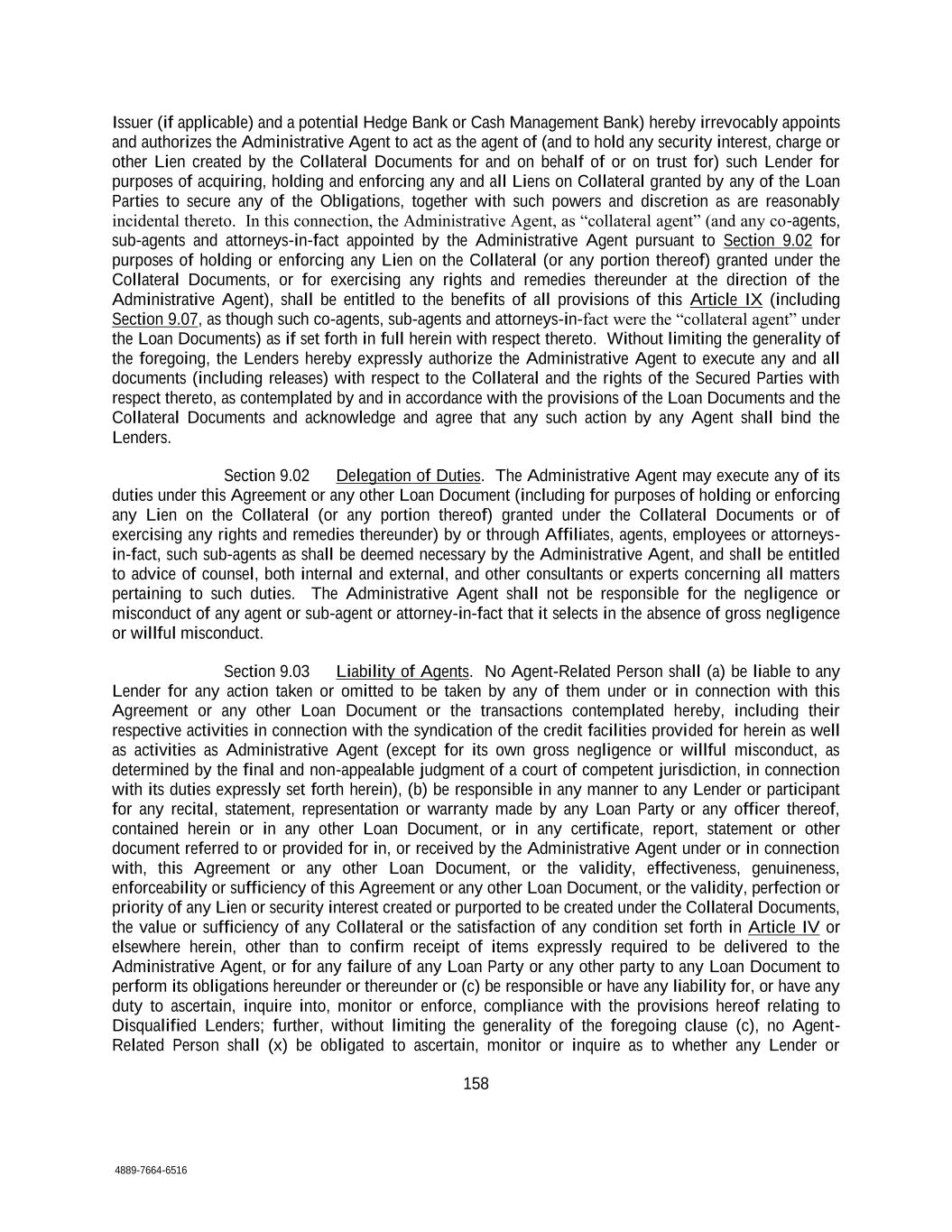 158 4889-7664-6516 Issuer (if applicable) and a potential Hedge Bank or Cash Management Bank) hereby irrevocably appoints and authorizes the Administrative Agent to act as the agent of (and to hold any security interest, charge or other Lien created by the Collateral Documents for and on behalf of or on trust for) such Lender for purposes of acquiring, holding and enforcing any and all Liens on Collateral granted by any of the Loan Parties to secure any of the Obligations, together with such powers and discretion as are reasonably incidental thereto. In this connection, the Administrative Agent, as “collateral agent” (and any co-agents, sub-agents and attorneys-in-fact appointed by the Administrative Agent pursuant to Section 9.02 for purposes of holding or enforcing any Lien on the Collateral (or any portion thereof) granted under the Collateral Documents, or for exercising any rights and remedies thereunder at the direction of the Administrative Agent), shall be entitled to the benefits of all provisions of this Article IX (including Section 9.07, as though such co-agents, sub-agents and attorneys-in-fact were the “collateral agent” under the Loan Documents) as if set forth in full herein with respect thereto. Without limiting the generality of the foregoing, the Lenders hereby expressly authorize the Administrative Agent to execute any and all documents (including releases) with respect to the Collateral and the rights of the Secured Parties with respect thereto, as contemplated by and in accordance with the provisions of the Loan Documents and the Collateral Documents and acknowledge and agree that any such action by any Agent shall bind the Lenders. Section 9.02 Delegation of Duties. The Administrative Agent may execute any of its duties under this Agreement or any other Loan Document (including for purposes of holding or enforcing any Lien on the Collateral (or any portion thereof) granted under the Collateral Documents or of exercising any rights and remedies thereunder) by or through Affiliates, agents, employees or attorneys- in-fact, such sub-agents as shall be deemed necessary by the Administrative Agent, and shall be entitled to advice of counsel, both internal and external, and other consultants or experts concerning all matters pertaining to such duties. The Administrative Agent shall not be responsible for the negligence or misconduct of any agent or sub-agent or attorney-in-fact that it selects in the absence of gross negligence or willful misconduct. Section 9.03 Liability of Agents. No Agent-Related Person shall (a) be liable to any Lender for any action taken or omitted to be taken by any of them under or in connection with this Agreement or any other Loan Document or the transactions contemplated hereby, including their respective activities in connection with the syndication of the credit facilities provided for herein as well as activities as Administrative Agent (except for its own gross negligence or willful misconduct, as determined by the final and non-appealable judgment of a court of competent jurisdiction, in connection with its duties expressly set forth herein), (b) be responsible in any manner to any Lender or participant for any recital, statement, representation or warranty made by any Loan Party or any officer thereof, contained herein or in any other Loan Document, or in any certificate, report, statement or other document referred to or provided for in, or received by the Administrative Agent under or in connection with, this Agreement or any other Loan Document, or the validity, effectiveness, genuineness, enforceability or sufficiency of this Agreement or any other Loan Document, or the validity, perfection or priority of any Lien or security interest created or purported to be created under the Collateral Documents, the value or sufficiency of any Collateral or the satisfaction of any condition set forth in Article IV or elsewhere herein, other than to confirm receipt of items expressly required to be delivered to the Administrative Agent, or for any failure of any Loan Party or any other party to any Loan Document to perform its obligations hereunder or thereunder or (c) be responsible or have any liability for, or have any duty to ascertain, inquire into, monitor or enforce, compliance with the provisions hereof relating to Disqualified Lenders; further, without limiting the generality of the foregoing clause (c), no Agent- Related Person shall (x) be obligated to ascertain, monitor or inquire as to whether any Lender or