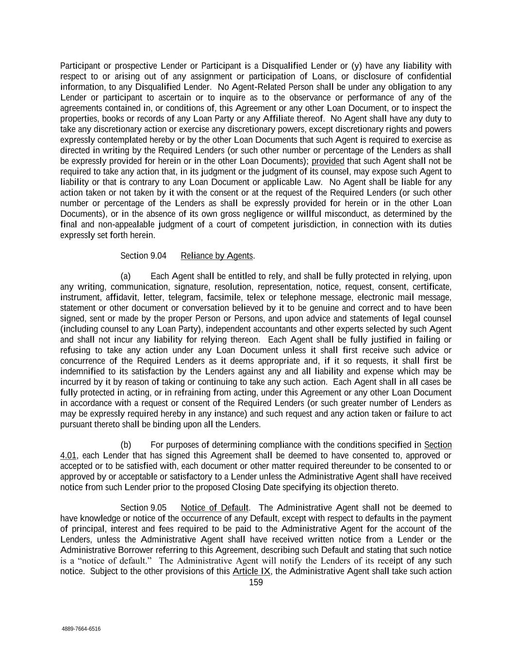 159 4889-7664-6516 Participant or prospective Lender or Participant is a Disqualified Lender or (y) have any liability with respect to or arising out of any assignment or participation of Loans, or disclosure of confidential information, to any Disqualified Lender. No Agent-Related Person shall be under any obligation to any Lender or participant to ascertain or to inquire as to the observance or performance of any of the agreements contained in, or conditions of, this Agreement or any other Loan Document, or to inspect the properties, books or records of any Loan Party or any Affiliate thereof. No Agent shall have any duty to take any discretionary action or exercise any discretionary powers, except discretionary rights and powers expressly contemplated hereby or by the other Loan Documents that such Agent is required to exercise as directed in writing by the Required Lenders (or such other number or percentage of the Lenders as shall be expressly provided for herein or in the other Loan Documents); provided that such Agent shall not be required to take any action that, in its judgment or the judgment of its counsel, may expose such Agent to liability or that is contrary to any Loan Document or applicable Law. No Agent shall be liable for any action taken or not taken by it with the consent or at the request of the Required Lenders (or such other number or percentage of the Lenders as shall be expressly provided for herein or in the other Loan Documents), or in the absence of its own gross negligence or willful misconduct, as determined by the final and non-appealable judgment of a court of competent jurisdiction, in connection with its duties expressly set forth herein. Section 9.04 Reliance by Agents. (a) Each Agent shall be entitled to rely, and shall be fully protected in relying, upon any writing, communication, signature, resolution, representation, notice, request, consent, certificate, instrument, affidavit, letter, telegram, facsimile, telex or telephone message, electronic mail message, statement or other document or conversation believed by it to be genuine and correct and to have been signed, sent or made by the proper Person or Persons, and upon advice and statements of legal counsel (including counsel to any Loan Party), independent accountants and other experts selected by such Agent and shall not incur any liability for relying thereon. Each Agent shall be fully justified in failing or refusing to take any action under any Loan Document unless it shall first receive such advice or concurrence of the Required Lenders as it deems appropriate and, if it so requests, it shall first be indemnified to its satisfaction by the Lenders against any and all liability and expense which may be incurred by it by reason of taking or continuing to take any such action. Each Agent shall in all cases be fully protected in acting, or in refraining from acting, under this Agreement or any other Loan Document in accordance with a request or consent of the Required Lenders (or such greater number of Lenders as may be expressly required hereby in any instance) and such request and any action taken or failure to act pursuant thereto shall be binding upon all the Lenders. (b) For purposes of determining compliance with the conditions specified in Section 4.01, each Lender that has signed this Agreement shall be deemed to have consented to, approved or accepted or to be satisfied with, each document or other matter required thereunder to be consented to or approved by or acceptable or satisfactory to a Lender unless the Administrative Agent shall have received notice from such Lender prior to the proposed Closing Date specifying its objection thereto. Section 9.05 Notice of Default. The Administrative Agent shall not be deemed to have knowledge or notice of the occurrence of any Default, except with respect to defaults in the payment of principal, interest and fees required to be paid to the Administrative Agent for the account of the Lenders, unless the Administrative Agent shall have received written notice from a Lender or the Administrative Borrower referring to this Agreement, describing such Default and stating that such notice is a “notice of default.” The Administrative Agent will notify the Lenders of its receipt of any such notice. Subject to the other provisions of this Article IX, the Administrative Agent shall take such action