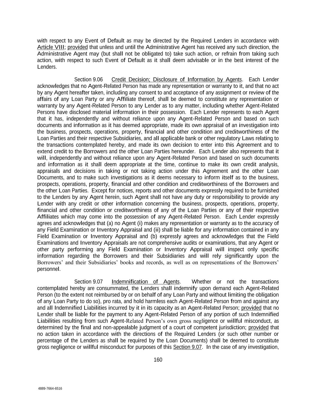 160 4889-7664-6516 with respect to any Event of Default as may be directed by the Required Lenders in accordance with Article VIII; provided that unless and until the Administrative Agent has received any such direction, the Administrative Agent may (but shall not be obligated to) take such action, or refrain from taking such action, with respect to such Event of Default as it shall deem advisable or in the best interest of the Lenders. Section 9.06 Credit Decision; Disclosure of Information by Agents. Each Lender acknowledges that no Agent-Related Person has made any representation or warranty to it, and that no act by any Agent hereafter taken, including any consent to and acceptance of any assignment or review of the affairs of any Loan Party or any Affiliate thereof, shall be deemed to constitute any representation or warranty by any Agent-Related Person to any Lender as to any matter, including whether Agent-Related Persons have disclosed material information in their possession. Each Lender represents to each Agent that it has, independently and without reliance upon any Agent-Related Person and based on such documents and information as it has deemed appropriate, made its own appraisal of an investigation into the business, prospects, operations, property, financial and other condition and creditworthiness of the Loan Parties and their respective Subsidiaries, and all applicable bank or other regulatory Laws relating to the transactions contemplated hereby, and made its own decision to enter into this Agreement and to extend credit to the Borrowers and the other Loan Parties hereunder. Each Lender also represents that it will, independently and without reliance upon any Agent-Related Person and based on such documents and information as it shall deem appropriate at the time, continue to make its own credit analysis, appraisals and decisions in taking or not taking action under this Agreement and the other Loan Documents, and to make such investigations as it deems necessary to inform itself as to the business, prospects, operations, property, financial and other condition and creditworthiness of the Borrowers and the other Loan Parties. Except for notices, reports and other documents expressly required to be furnished to the Lenders by any Agent herein, such Agent shall not have any duty or responsibility to provide any Lender with any credit or other information concerning the business, prospects, operations, property, financial and other condition or creditworthiness of any of the Loan Parties or any of their respective Affiliates which may come into the possession of any Agent-Related Person. Each Lender expressly agrees and acknowledges that (a) no Agent (i) makes any representation or warranty as to the accuracy of any Field Examination or Inventory Appraisal and (ii) shall be liable for any information contained in any Field Examination or Inventory Appraisal and (b) expressly agrees and acknowledges that the Field Examinations and Inventory Appraisals are not comprehensive audits or examinations, that any Agent or other party performing any Field Examination or Inventory Appraisal will inspect only specific information regarding the Borrowers and their Subsidiaries and will rely significantly upon the Borrowers’ and their Subsidiaries’ books and records, as well as on representations of the Borrowers’ personnel. Section 9.07 Indemnification of Agents. Whether or not the transactions contemplated hereby are consummated, the Lenders shall indemnify upon demand each Agent-Related Person (to the extent not reimbursed by or on behalf of any Loan Party and without limiting the obligation of any Loan Party to do so), pro rata, and hold harmless each Agent-Related Person from and against any and all Indemnified Liabilities incurred by it in its capacity as an Agent-Related Person; provided that no Lender shall be liable for the payment to any Agent-Related Person of any portion of such Indemnified Liabilities resulting from such Agent-Related Person’s own gross negligence or willful misconduct, as determined by the final and non-appealable judgment of a court of competent jurisdiction; provided that no action taken in accordance with the directions of the Required Lenders (or such other number or percentage of the Lenders as shall be required by the Loan Documents) shall be deemed to constitute gross negligence or willful misconduct for purposes of this Section 9.07. In the case of any investigation,