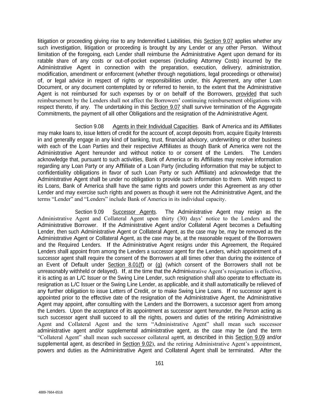161 4889-7664-6516 litigation or proceeding giving rise to any Indemnified Liabilities, this Section 9.07 applies whether any such investigation, litigation or proceeding is brought by any Lender or any other Person. Without limitation of the foregoing, each Lender shall reimburse the Administrative Agent upon demand for its ratable share of any costs or out-of-pocket expenses (including Attorney Costs) incurred by the Administrative Agent in connection with the preparation, execution, delivery, administration, modification, amendment or enforcement (whether through negotiations, legal proceedings or otherwise) of, or legal advice in respect of rights or responsibilities under, this Agreement, any other Loan Document, or any document contemplated by or referred to herein, to the extent that the Administrative Agent is not reimbursed for such expenses by or on behalf of the Borrowers, provided that such reimbursement by the Lenders shall not affect the Borrowers’ continuing reimbursement obligations with respect thereto, if any. The undertaking in this Section 9.07 shall survive termination of the Aggregate Commitments, the payment of all other Obligations and the resignation of the Administrative Agent. Section 9.08 Agents in their Individual Capacities. Bank of America and its Affiliates may make loans to, issue letters of credit for the account of, accept deposits from, acquire Equity Interests in and generally engage in any kind of banking, trust, financial advisory, underwriting or other business with each of the Loan Parties and their respective Affiliates as though Bank of America were not the Administrative Agent hereunder and without notice to or consent of the Lenders. The Lenders acknowledge that, pursuant to such activities, Bank of America or its Affiliates may receive information regarding any Loan Party or any Affiliate of a Loan Party (including information that may be subject to confidentiality obligations in favor of such Loan Party or such Affiliate) and acknowledge that the Administrative Agent shall be under no obligation to provide such information to them. With respect to its Loans, Bank of America shall have the same rights and powers under this Agreement as any other Lender and may exercise such rights and powers as though it were not the Administrative Agent, and the terms “Lender” and “Lenders” include Bank of America in its individual capacity. Section 9.09 Successor Agents. The Administrative Agent may resign as the Administrative Agent and Collateral Agent upon thirty (30) days’ notice to the Lenders and the Administrative Borrower. If the Administrative Agent and/or Collateral Agent becomes a Defaulting Lender, then such Administrative Agent or Collateral Agent, as the case may be, may be removed as the Administrative Agent or Collateral Agent, as the case may be, at the reasonable request of the Borrowers and the Required Lenders. If the Administrative Agent resigns under this Agreement, the Required Lenders shall appoint from among the Lenders a successor agent for the Lenders, which appointment of a successor agent shall require the consent of the Borrowers at all times other than during the existence of an Event of Default under Section 8.01(f) or (g) (which consent of the Borrowers shall not be unreasonably withheld or delayed). If, at the time that the Administrative Agent’s resignation is effective, it is acting as an L/C Issuer or the Swing Line Lender, such resignation shall also operate to effectuate its resignation as L/C Issuer or the Swing Line Lender, as applicable, and it shall automatically be relieved of any further obligation to issue Letters of Credit, or to make Swing Line Loans. If no successor agent is appointed prior to the effective date of the resignation of the Administrative Agent, the Administrative Agent may appoint, after consulting with the Lenders and the Borrowers, a successor agent from among the Lenders. Upon the acceptance of its appointment as successor agent hereunder, the Person acting as such successor agent shall succeed to all the rights, powers and duties of the retiring Administrative Agent and Collateral Agent and the term “Administrative Agent” shall mean such successor administrative agent and/or supplemental administrative agent, as the case may be (and the term “Collateral Agent” shall mean such successor collateral agent, as described in this Section 9.09 and/or supplemental agent, as described in Section 9.02), and the retiring Administrative Agent’s appointment, powers and duties as the Administrative Agent and Collateral Agent shall be terminated. After the