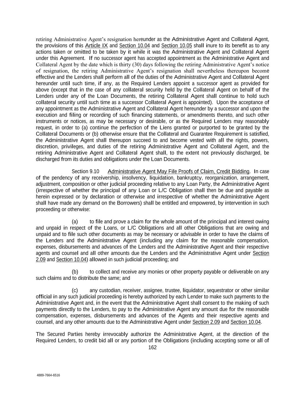 162 4889-7664-6516 retiring Administrative Agent’s resignation hereunder as the Administrative Agent and Collateral Agent, the provisions of this Article IX and Section 10.04 and Section 10.05 shall inure to its benefit as to any actions taken or omitted to be taken by it while it was the Administrative Agent and Collateral Agent under this Agreement. If no successor agent has accepted appointment as the Administrative Agent and Collateral Agent by the date which is thirty (30) days following the retiring Administrative Agent’s notice of resignation, the retiring Administrative Agent’s resignation shall nevertheless thereupon become effective and the Lenders shall perform all of the duties of the Administrative Agent and Collateral Agent hereunder until such time, if any, as the Required Lenders appoint a successor agent as provided for above (except that in the case of any collateral security held by the Collateral Agent on behalf of the Lenders under any of the Loan Documents, the retiring Collateral Agent shall continue to hold such collateral security until such time as a successor Collateral Agent is appointed). Upon the acceptance of any appointment as the Administrative Agent and Collateral Agent hereunder by a successor and upon the execution and filing or recording of such financing statements, or amendments thereto, and such other instruments or notices, as may be necessary or desirable, or as the Required Lenders may reasonably request, in order to (a) continue the perfection of the Liens granted or purported to be granted by the Collateral Documents or (b) otherwise ensure that the Collateral and Guarantee Requirement is satisfied, the Administrative Agent shall thereupon succeed to and become vested with all the rights, powers, discretion, privileges, and duties of the retiring Administrative Agent and Collateral Agent, and the retiring Administrative Agent and Collateral Agent shall, to the extent not previously discharged, be discharged from its duties and obligations under the Loan Documents. Section 9.10 Administrative Agent May File Proofs of Claim, Credit Bidding. In case of the pendency of any receivership, insolvency, liquidation, bankruptcy, reorganization, arrangement, adjustment, composition or other judicial proceeding relative to any Loan Party, the Administrative Agent (irrespective of whether the principal of any Loan or L/C Obligation shall then be due and payable as herein expressed or by declaration or otherwise and irrespective of whether the Administrative Agent shall have made any demand on the Borrowers) shall be entitled and empowered, by intervention in such proceeding or otherwise: (a) to file and prove a claim for the whole amount of the principal and interest owing and unpaid in respect of the Loans, or L/C Obligations and all other Obligations that are owing and unpaid and to file such other documents as may be necessary or advisable in order to have the claims of the Lenders and the Administrative Agent (including any claim for the reasonable compensation, expenses, disbursements and advances of the Lenders and the Administrative Agent and their respective agents and counsel and all other amounts due the Lenders and the Administrative Agent under Section 2.09 and Section 10.04) allowed in such judicial proceeding; and (b) to collect and receive any monies or other property payable or deliverable on any such claims and to distribute the same; and (c) any custodian, receiver, assignee, trustee, liquidator, sequestrator or other similar official in any such judicial proceeding is hereby authorized by each Lender to make such payments to the Administrative Agent and, in the event that the Administrative Agent shall consent to the making of such payments directly to the Lenders, to pay to the Administrative Agent any amount due for the reasonable compensation, expenses, disbursements and advances of the Agents and their respective agents and counsel, and any other amounts due to the Administrative Agent under Section 2.09 and Section 10.04. The Secured Parties hereby irrevocably authorize the Administrative Agent, at the direction of the Required Lenders, to credit bid all or any portion of the Obligations (including accepting some or all of