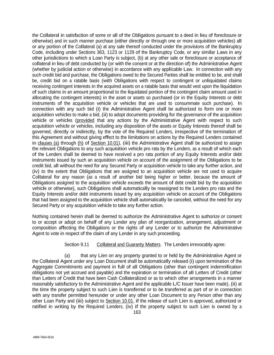 163 4889-7664-6516 the Collateral in satisfaction of some or all of the Obligations pursuant to a deed in lieu of foreclosure or otherwise) and in such manner purchase (either directly or through one or more acquisition vehicles) all or any portion of the Collateral (a) at any sale thereof conducted under the provisions of the Bankruptcy Code, including under Sections 363, 1123 or 1129 of the Bankruptcy Code, or any similar Laws in any other jurisdictions to which a Loan Party is subject, (b) at any other sale or foreclosure or acceptance of collateral in lieu of debt conducted by (or with the consent or at the direction of) the Administrative Agent (whether by judicial action or otherwise) in accordance with any applicable Law. In connection with any such credit bid and purchase, the Obligations owed to the Secured Parties shall be entitled to be, and shall be, credit bid on a ratable basis (with Obligations with respect to contingent or unliquidated claims receiving contingent interests in the acquired assets on a ratable basis that would vest upon the liquidation of such claims in an amount proportional to the liquidated portion of the contingent claim amount used in allocating the contingent interests) in the asset or assets so purchased (or in the Equity Interests or debt instruments of the acquisition vehicle or vehicles that are used to consummate such purchase). In connection with any such bid (i) the Administrative Agent shall be authorized to form one or more acquisition vehicles to make a bid, (ii) to adopt documents providing for the governance of the acquisition vehicle or vehicles (provided that any actions by the Administrative Agent with respect to such acquisition vehicle or vehicles, including any disposition of the assets or Equity Interests thereof shall be governed, directly or indirectly, by the vote of the Required Lenders, irrespective of the termination of this Agreement and without giving effect to the limitations on actions by the Required Lenders contained in clauses (a) through (h) of Section 10.01), (iii) the Administrative Agent shall be authorized to assign the relevant Obligations to any such acquisition vehicle pro rata by the Lenders, as a result of which each of the Lenders shall be deemed to have received a pro rata portion of any Equity Interests and/or debt instruments issued by such an acquisition vehicle on account of the assignment of the Obligations to be credit bid, all without the need for any Secured Party or acquisition vehicle to take any further action, and (iv) to the extent that Obligations that are assigned to an acquisition vehicle are not used to acquire Collateral for any reason (as a result of another bid being higher or better, because the amount of Obligations assigned to the acquisition vehicle exceeds the amount of debt credit bid by the acquisition vehicle or otherwise), such Obligations shall automatically be reassigned to the Lenders pro rata and the Equity Interests and/or debt instruments issued by any acquisition vehicle on account of the Obligations that had been assigned to the acquisition vehicle shall automatically be canceled, without the need for any Secured Party or any acquisition vehicle to take any further action. Nothing contained herein shall be deemed to authorize the Administrative Agent to authorize or consent to or accept or adopt on behalf of any Lender any plan of reorganization, arrangement, adjustment or composition affecting the Obligations or the rights of any Lender or to authorize the Administrative Agent to vote in respect of the claim of any Lender in any such proceeding. Section 9.11 Collateral and Guaranty Matters. The Lenders irrevocably agree: (a) that any Lien on any property granted to or held by the Administrative Agent or the Collateral Agent under any Loan Document shall be automatically released (i) upon termination of the Aggregate Commitments and payment in full of all Obligations (other than contingent indemnification obligations not yet accrued and payable) and the expiration or termination of all Letters of Credit (other than Letters of Credit that have been Cash Collateralized or as to which other arrangements in a manner reasonably satisfactory to the Administrative Agent and the applicable L/C Issuer have been made), (ii) at the time the property subject to such Lien is transferred or to be transferred as part of or in connection with any transfer permitted hereunder or under any other Loan Document to any Person other than any other Loan Party and (iii) subject to Section 10.01, if the release of such Lien is approved, authorized or ratified in writing by the Required Lenders, (iv) if the property subject to such Lien is owned by a
