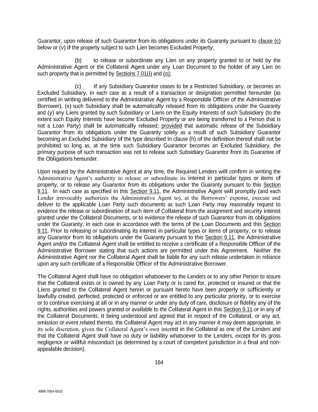 164 4889-7664-6516 Guarantor, upon release of such Guarantor from its obligations under its Guaranty pursuant to clause (c) below or (v) if the property subject to such Lien becomes Excluded Property; (b) to release or subordinate any Lien on any property granted to or held by the Administrative Agent or the Collateral Agent under any Loan Document to the holder of any Lien on such property that is permitted by Sections 7.01(i) and (o); (c) if any Subsidiary Guarantor ceases to be a Restricted Subsidiary, or becomes an Excluded Subsidiary, in each case as a result of a transaction or designation permitted hereunder (as certified in writing delivered to the Administrative Agent by a Responsible Officer of the Administrative Borrower), (x) such Subsidiary shall be automatically released from its obligations under the Guaranty and (y) any Liens granted by such Subsidiary or Liens on the Equity Interests of such Subsidiary (to the extent such Equity Interests have become Excluded Property or are being transferred to a Person that is not a Loan Party) shall be automatically released; provided that automatic release of the Subsidiary Guarantor from its obligations under the Guaranty solely as a result of such Subsidiary Guarantor becoming an Excluded Subsidiary of the type described in clause (h) of the definition thereof shall not be prohibited so long as, at the time such Subsidiary Guarantor becomes an Excluded Subsidiary, the primary purpose of such transaction was not to release such Subsidiary Guarantor from its Guarantee of the Obligations hereunder. Upon request by the Administrative Agent at any time, the Required Lenders will confirm in writing the Administrative Agent’s authority to release or subordinate its interest in particular types or items of property, or to release any Guarantor from its obligations under the Guaranty pursuant to this Section 9.11. In each case as specified in this Section 9.11, the Administrative Agent will promptly (and each Lender irrevocably authorizes the Administrative Agent to), at the Borrowers’ expense, execute and deliver to the applicable Loan Party such documents as such Loan Party may reasonably request to evidence the release or subordination of such item of Collateral from the assignment and security interest granted under the Collateral Documents, or to evidence the release of such Guarantor from its obligations under the Guaranty, in each case in accordance with the terms of the Loan Documents and this Section 9.11. Prior to releasing or subordinating its interest in particular types or items of property, or to release any Guarantor from its obligations under the Guaranty pursuant to this Section 9.11, the Administrative Agent and/or the Collateral Agent shall be entitled to receive a certificate of a Responsible Officer of the Administrative Borrower stating that such actions are permitted under this Agreement. Neither the Administrative Agent nor the Collateral Agent shall be liable for any such release undertaken in reliance upon any such certificate of a Responsible Officer of the Administrative Borrower. The Collateral Agent shall have no obligation whatsoever to the Lenders or to any other Person to assure that the Collateral exists or is owned by any Loan Party or is cared for, protected or insured or that the Liens granted to the Collateral Agent herein or pursuant hereto have been properly or sufficiently or lawfully created, perfected, protected or enforced or are entitled to any particular priority, or to exercise or to continue exercising at all or in any manner or under any duty of care, disclosure or fidelity any of the rights, authorities and powers granted or available to the Collateral Agent in this Section 9.11 or in any of the Collateral Documents, it being understood and agreed that in respect of the Collateral, or any act, omission or event related thereto, the Collateral Agent may act in any manner it may deem appropriate, in its sole discretion, given the Collateral Agent’s own interest in the Collateral as one of the Lenders and that the Collateral Agent shall have no duty or liability whatsoever to the Lenders, except for its gross negligence or willful misconduct (as determined by a court of competent jurisdiction in a final and non- appealable decision).