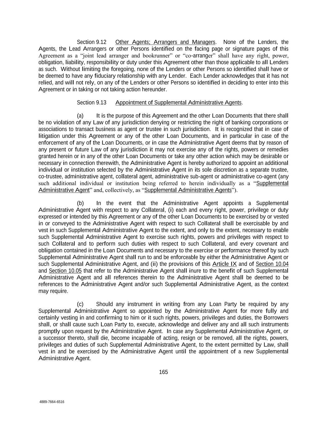 165 4889-7664-6516 Section 9.12 Other Agents; Arrangers and Managers. None of the Lenders, the Agents, the Lead Arrangers or other Persons identified on the facing page or signature pages of this Agreement as a “joint lead arranger and bookrunner” or “co-arranger” shall have any right, power, obligation, liability, responsibility or duty under this Agreement other than those applicable to all Lenders as such. Without limiting the foregoing, none of the Lenders or other Persons so identified shall have or be deemed to have any fiduciary relationship with any Lender. Each Lender acknowledges that it has not relied, and will not rely, on any of the Lenders or other Persons so identified in deciding to enter into this Agreement or in taking or not taking action hereunder. Section 9.13 Appointment of Supplemental Administrative Agents. (a) It is the purpose of this Agreement and the other Loan Documents that there shall be no violation of any Law of any jurisdiction denying or restricting the right of banking corporations or associations to transact business as agent or trustee in such jurisdiction. It is recognized that in case of litigation under this Agreement or any of the other Loan Documents, and in particular in case of the enforcement of any of the Loan Documents, or in case the Administrative Agent deems that by reason of any present or future Law of any jurisdiction it may not exercise any of the rights, powers or remedies granted herein or in any of the other Loan Documents or take any other action which may be desirable or necessary in connection therewith, the Administrative Agent is hereby authorized to appoint an additional individual or institution selected by the Administrative Agent in its sole discretion as a separate trustee, co-trustee, administrative agent, collateral agent, administrative sub-agent or administrative co-agent (any such additional individual or institution being referred to herein individually as a “Supplemental Administrative Agent” and, collectively, as “Supplemental Administrative Agents”). (b) In the event that the Administrative Agent appoints a Supplemental Administrative Agent with respect to any Collateral, (i) each and every right, power, privilege or duty expressed or intended by this Agreement or any of the other Loan Documents to be exercised by or vested in or conveyed to the Administrative Agent with respect to such Collateral shall be exercisable by and vest in such Supplemental Administrative Agent to the extent, and only to the extent, necessary to enable such Supplemental Administrative Agent to exercise such rights, powers and privileges with respect to such Collateral and to perform such duties with respect to such Collateral, and every covenant and obligation contained in the Loan Documents and necessary to the exercise or performance thereof by such Supplemental Administrative Agent shall run to and be enforceable by either the Administrative Agent or such Supplemental Administrative Agent, and (ii) the provisions of this Article IX and of Section 10.04 and Section 10.05 that refer to the Administrative Agent shall inure to the benefit of such Supplemental Administrative Agent and all references therein to the Administrative Agent shall be deemed to be references to the Administrative Agent and/or such Supplemental Administrative Agent, as the context may require. (c) Should any instrument in writing from any Loan Party be required by any Supplemental Administrative Agent so appointed by the Administrative Agent for more fully and certainly vesting in and confirming to him or it such rights, powers, privileges and duties, the Borrowers shall, or shall cause such Loan Party to, execute, acknowledge and deliver any and all such instruments promptly upon request by the Administrative Agent. In case any Supplemental Administrative Agent, or a successor thereto, shall die, become incapable of acting, resign or be removed, all the rights, powers, privileges and duties of such Supplemental Administrative Agent, to the extent permitted by Law, shall vest in and be exercised by the Administrative Agent until the appointment of a new Supplemental Administrative Agent.