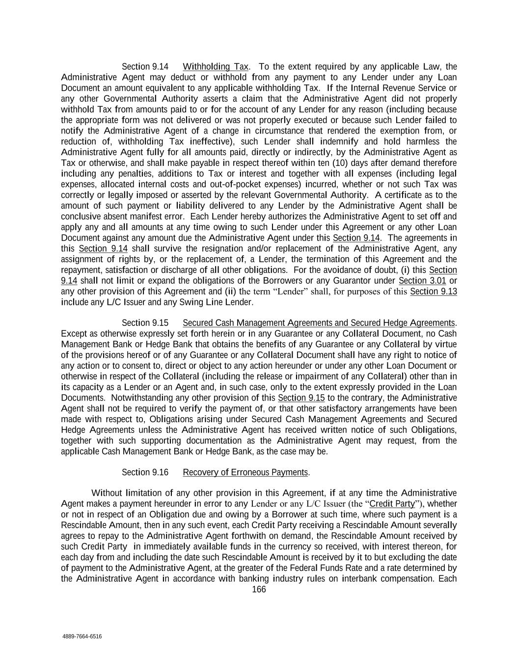 166 4889-7664-6516 Section 9.14 Withholding Tax. To the extent required by any applicable Law, the Administrative Agent may deduct or withhold from any payment to any Lender under any Loan Document an amount equivalent to any applicable withholding Tax. If the Internal Revenue Service or any other Governmental Authority asserts a claim that the Administrative Agent did not properly withhold Tax from amounts paid to or for the account of any Lender for any reason (including because the appropriate form was not delivered or was not properly executed or because such Lender failed to notify the Administrative Agent of a change in circumstance that rendered the exemption from, or reduction of, withholding Tax ineffective), such Lender shall indemnify and hold harmless the Administrative Agent fully for all amounts paid, directly or indirectly, by the Administrative Agent as Tax or otherwise, and shall make payable in respect thereof within ten (10) days after demand therefore including any penalties, additions to Tax or interest and together with all expenses (including legal expenses, allocated internal costs and out-of-pocket expenses) incurred, whether or not such Tax was correctly or legally imposed or asserted by the relevant Governmental Authority. A certificate as to the amount of such payment or liability delivered to any Lender by the Administrative Agent shall be conclusive absent manifest error. Each Lender hereby authorizes the Administrative Agent to set off and apply any and all amounts at any time owing to such Lender under this Agreement or any other Loan Document against any amount due the Administrative Agent under this Section 9.14. The agreements in this Section 9.14 shall survive the resignation and/or replacement of the Administrative Agent, any assignment of rights by, or the replacement of, a Lender, the termination of this Agreement and the repayment, satisfaction or discharge of all other obligations. For the avoidance of doubt, (i) this Section 9.14 shall not limit or expand the obligations of the Borrowers or any Guarantor under Section 3.01 or any other provision of this Agreement and (ii) the term “Lender” shall, for purposes of this Section 9.13 include any L/C Issuer and any Swing Line Lender. Section 9.15 Secured Cash Management Agreements and Secured Hedge Agreements. Except as otherwise expressly set forth herein or in any Guarantee or any Collateral Document, no Cash Management Bank or Hedge Bank that obtains the benefits of any Guarantee or any Collateral by virtue of the provisions hereof or of any Guarantee or any Collateral Document shall have any right to notice of any action or to consent to, direct or object to any action hereunder or under any other Loan Document or otherwise in respect of the Collateral (including the release or impairment of any Collateral) other than in its capacity as a Lender or an Agent and, in such case, only to the extent expressly provided in the Loan Documents. Notwithstanding any other provision of this Section 9.15 to the contrary, the Administrative Agent shall not be required to verify the payment of, or that other satisfactory arrangements have been made with respect to, Obligations arising under Secured Cash Management Agreements and Secured Hedge Agreements unless the Administrative Agent has received written notice of such Obligations, together with such supporting documentation as the Administrative Agent may request, from the applicable Cash Management Bank or Hedge Bank, as the case may be. Section 9.16 Recovery of Erroneous Payments. Without limitation of any other provision in this Agreement, if at any time the Administrative Agent makes a payment hereunder in error to any Lender or any L/C Issuer (the “Credit Party”), whether or not in respect of an Obligation due and owing by a Borrower at such time, where such payment is a Rescindable Amount, then in any such event, each Credit Party receiving a Rescindable Amount severally agrees to repay to the Administrative Agent forthwith on demand, the Rescindable Amount received by such Credit Party in immediately available funds in the currency so received, with interest thereon, for each day from and including the date such Rescindable Amount is received by it to but excluding the date of payment to the Administrative Agent, at the greater of the Federal Funds Rate and a rate determined by the Administrative Agent in accordance with banking industry rules on interbank compensation. Each
