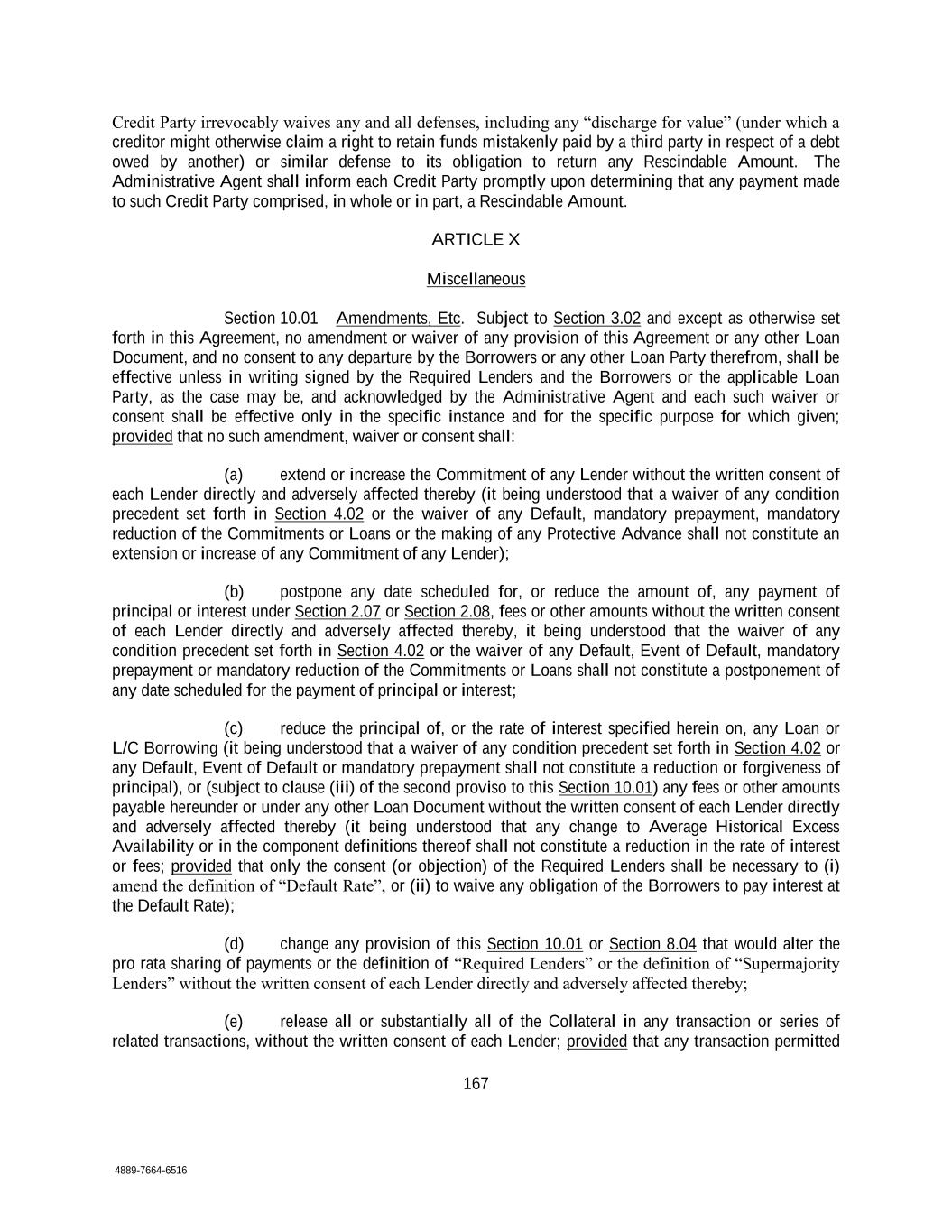 167 4889-7664-6516 Credit Party irrevocably waives any and all defenses, including any “discharge for value” (under which a creditor might otherwise claim a right to retain funds mistakenly paid by a third party in respect of a debt owed by another) or similar defense to its obligation to return any Rescindable Amount. The Administrative Agent shall inform each Credit Party promptly upon determining that any payment made to such Credit Party comprised, in whole or in part, a Rescindable Amount. ARTICLE X Miscellaneous Section 10.01 Amendments, Etc. Subject to Section 3.02 and except as otherwise set forth in this Agreement, no amendment or waiver of any provision of this Agreement or any other Loan Document, and no consent to any departure by the Borrowers or any other Loan Party therefrom, shall be effective unless in writing signed by the Required Lenders and the Borrowers or the applicable Loan Party, as the case may be, and acknowledged by the Administrative Agent and each such waiver or consent shall be effective only in the specific instance and for the specific purpose for which given; provided that no such amendment, waiver or consent shall: (a) extend or increase the Commitment of any Lender without the written consent of each Lender directly and adversely affected thereby (it being understood that a waiver of any condition precedent set forth in Section 4.02 or the waiver of any Default, mandatory prepayment, mandatory reduction of the Commitments or Loans or the making of any Protective Advance shall not constitute an extension or increase of any Commitment of any Lender); (b) postpone any date scheduled for, or reduce the amount of, any payment of principal or interest under Section 2.07 or Section 2.08, fees or other amounts without the written consent of each Lender directly and adversely affected thereby, it being understood that the waiver of any condition precedent set forth in Section 4.02 or the waiver of any Default, Event of Default, mandatory prepayment or mandatory reduction of the Commitments or Loans shall not constitute a postponement of any date scheduled for the payment of principal or interest; (c) reduce the principal of, or the rate of interest specified herein on, any Loan or L/C Borrowing (it being understood that a waiver of any condition precedent set forth in Section 4.02 or any Default, Event of Default or mandatory prepayment shall not constitute a reduction or forgiveness of principal), or (subject to clause (iii) of the second proviso to this Section 10.01) any fees or other amounts payable hereunder or under any other Loan Document without the written consent of each Lender directly and adversely affected thereby (it being understood that any change to Average Historical Excess Availability or in the component definitions thereof shall not constitute a reduction in the rate of interest or fees; provided that only the consent (or objection) of the Required Lenders shall be necessary to (i) amend the definition of “Default Rate”, or (ii) to waive any obligation of the Borrowers to pay interest at the Default Rate); (d) change any provision of this Section 10.01 or Section 8.04 that would alter the pro rata sharing of payments or the definition of “Required Lenders” or the definition of “Supermajority Lenders” without the written consent of each Lender directly and adversely affected thereby; (e) release all or substantially all of the Collateral in any transaction or series of related transactions, without the written consent of each Lender; provided that any transaction permitted