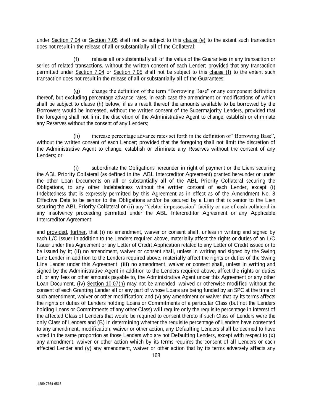 168 4889-7664-6516 under Section 7.04 or Section 7.05 shall not be subject to this clause (e) to the extent such transaction does not result in the release of all or substantially all of the Collateral; (f) release all or substantially all of the value of the Guarantees in any transaction or series of related transactions, without the written consent of each Lender; provided that any transaction permitted under Section 7.04 or Section 7.05 shall not be subject to this clause (f) to the extent such transaction does not result in the release of all or substantially all of the Guarantees; (g) change the definition of the term “Borrowing Base” or any component definition thereof, but excluding percentage advance rates, in each case the amendment or modifications of which shall be subject to clause (h) below, if as a result thereof the amounts available to be borrowed by the Borrowers would be increased, without the written consent of the Supermajority Lenders, provided that the foregoing shall not limit the discretion of the Administrative Agent to change, establish or eliminate any Reserves without the consent of any Lenders; (h) increase percentage advance rates set forth in the definition of “Borrowing Base”, without the written consent of each Lender; provided that the foregoing shall not limit the discretion of the Administrative Agent to change, establish or eliminate any Reserves without the consent of any Lenders; or (i) subordinate the Obligations hereunder in right of payment or the Liens securing the ABL Priority Collateral (as defined in the ABL Intercreditor Agreement) granted hereunder or under the other Loan Documents on all or substantially all of the ABL Priority Collateral securing the Obligations, to any other Indebtedness without the written consent of each Lender, except (i) Indebtedness that is expressly permitted by this Agreement as in effect as of the Amendment No. 8 Effective Date to be senior to the Obligations and/or be secured by a Lien that is senior to the Lien securing the ABL Priority Collateral or (ii) any “debtor in-possession” facility or use of cash collateral in any insolvency proceeding permitted under the ABL Intercreditor Agreement or any Applicable Intercreditor Agreement; and provided, further, that (i) no amendment, waiver or consent shall, unless in writing and signed by each L/C Issuer in addition to the Lenders required above, materially affect the rights or duties of an L/C Issuer under this Agreement or any Letter of Credit Application related to any Letter of Credit issued or to be issued by it; (ii) no amendment, waiver or consent shall, unless in writing and signed by the Swing Line Lender in addition to the Lenders required above, materially affect the rights or duties of the Swing Line Lender under this Agreement, (iii) no amendment, waiver or consent shall, unless in writing and signed by the Administrative Agent in addition to the Lenders required above, affect the rights or duties of, or any fees or other amounts payable to, the Administrative Agent under this Agreement or any other Loan Document, (iv) Section 10.07(h) may not be amended, waived or otherwise modified without the consent of each Granting Lender all or any part of whose Loans are being funded by an SPC at the time of such amendment, waiver or other modification; and (v) any amendment or waiver that by its terms affects the rights or duties of Lenders holding Loans or Commitments of a particular Class (but not the Lenders holding Loans or Commitments of any other Class) will require only the requisite percentage in interest of the affected Class of Lenders that would be required to consent thereto if such Class of Lenders were the only Class of Lenders and (B) in determining whether the requisite percentage of Lenders have consented to any amendment, modification, waiver or other action, any Defaulting Lenders shall be deemed to have voted in the same proportion as those Lenders who are not Defaulting Lenders, except with respect to (x) any amendment, waiver or other action which by its terms requires the consent of all Lenders or each affected Lender and (y) any amendment, waiver or other action that by its terms adversely affects any